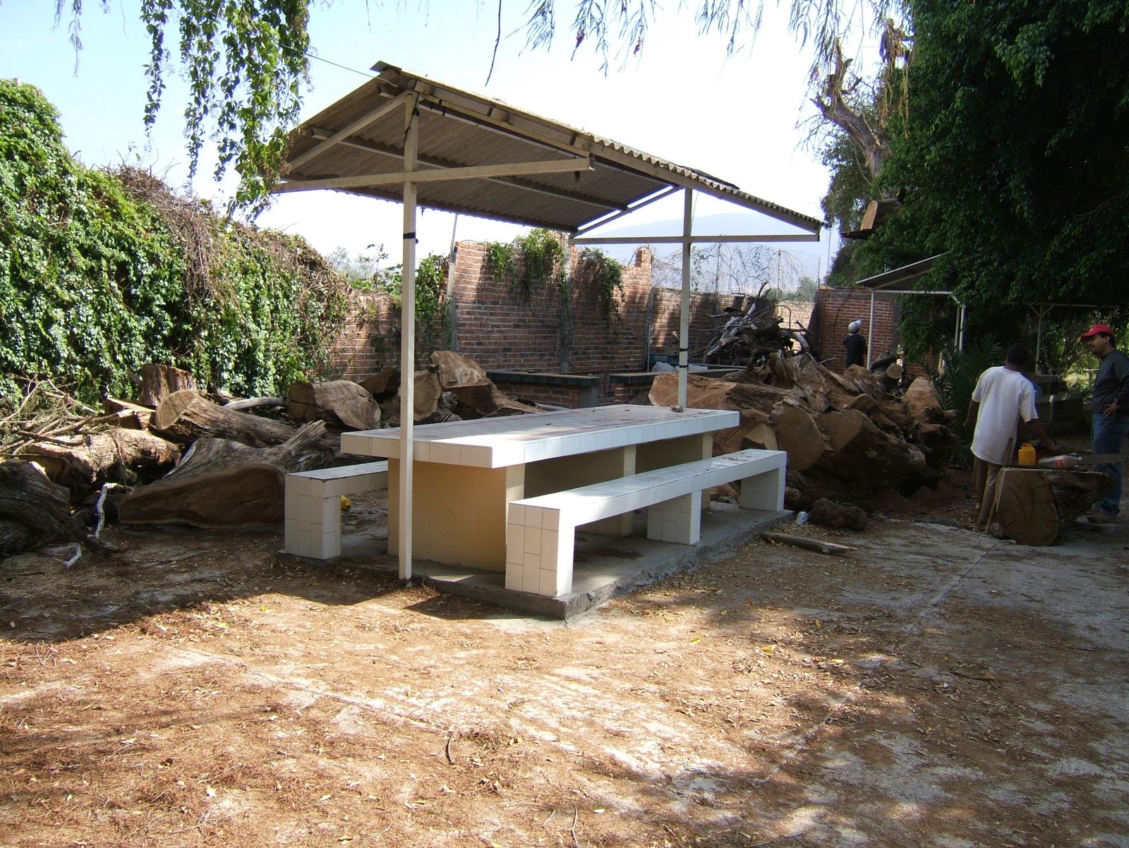 Aquí, un árbol grande que ha caído se está cortando, y un árbol muerto e inestable se está cortando también en trozos por partes. Hay mucho trabajo por hacer arreglar y reforzar las paredes de los límites, y reemplazar la estructura metálica para la cocina en el patio. Otro trabajo que se está haciendo en esta fase preliminaria incluye proveer facilidades para regar, instalar una bomba sumergible en el pozo y su unito para controlar, numerosas instalaciones eléctricas, reemplazar los techos de los refugios en el patio, proveer suministros para agua y gas al patio, colocar una barra en el refugio de la cocina y colocar piso allá, colocar la tarja en la cocina y un lavabo en el WC, y rehacer el techo y reconstruír las paredes de la bodeguita al extremo al sur.