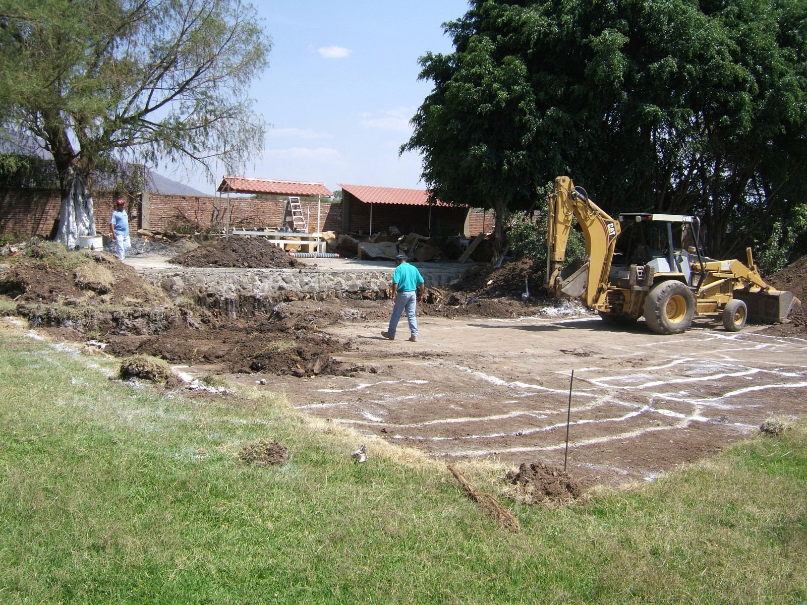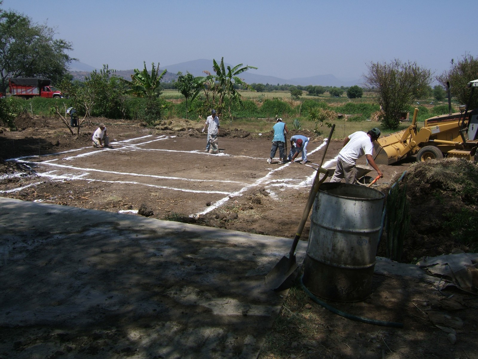 Se dejan marcas con cal en las líneas de la cimentación. Se construirá el frente de la casa desde el patio que se puede ver en el primer plano.