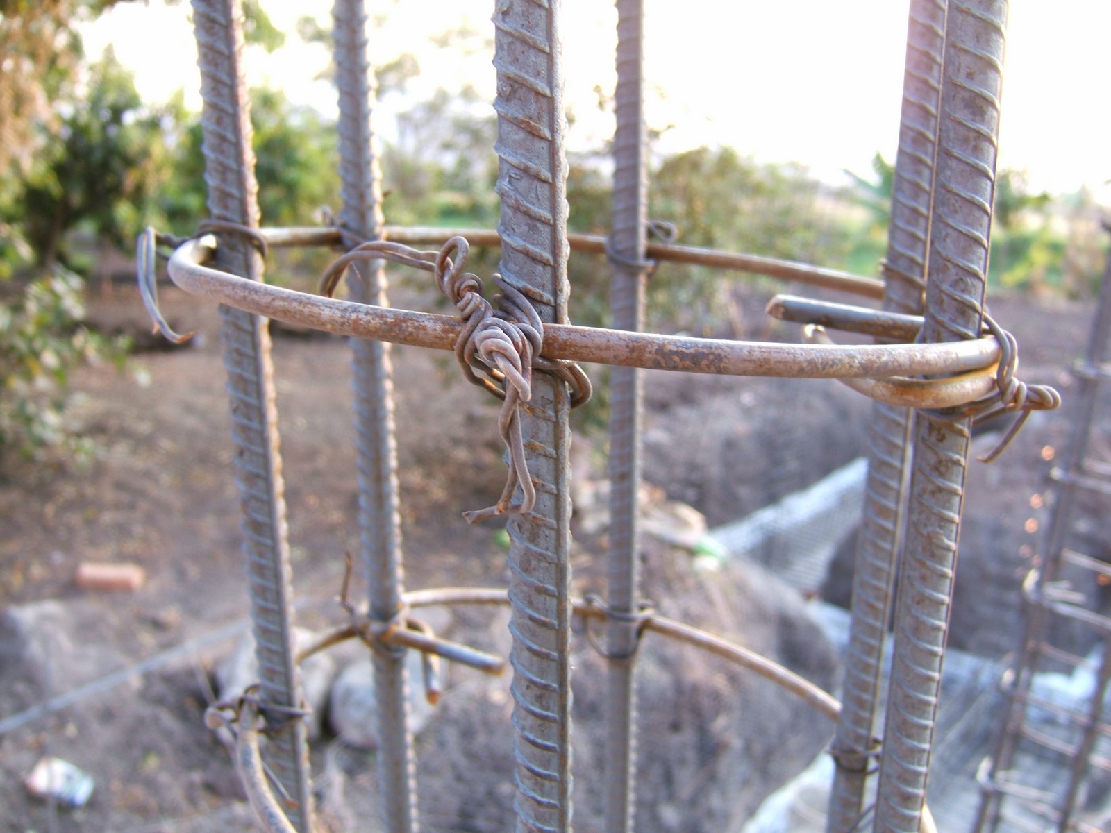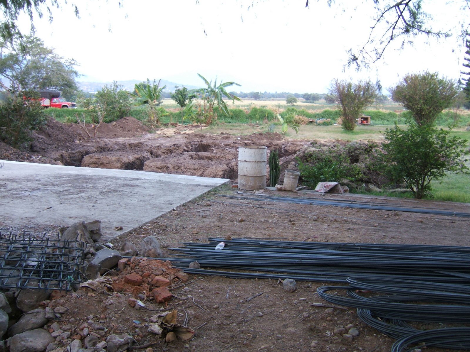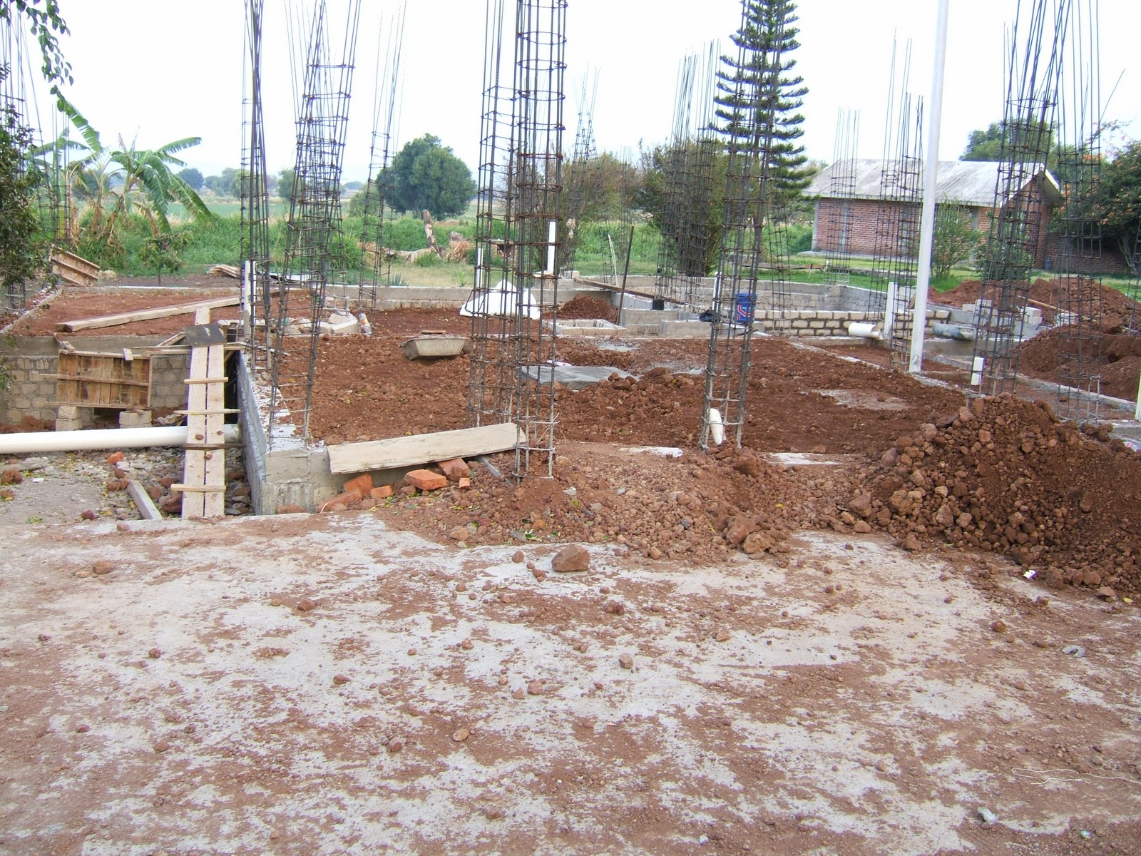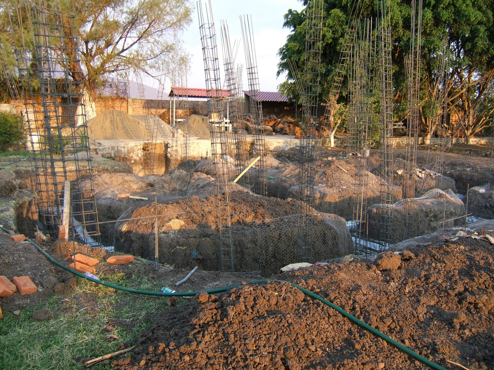 Una vista de las excavaciones para la cimentación. En el primer plano a la derecha están las varillas, el acero que se usa para refuerzos. Éste se corta y arma con alambrón y alambre. A la izquierda está una base de la cimentación (zapata).