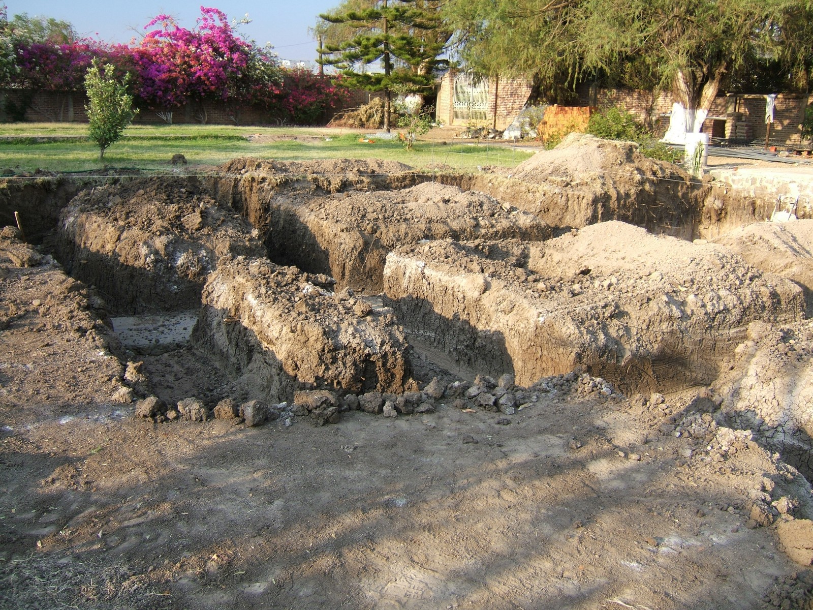 Una vista del patio mostrando las tapas sobre los registros, y la mayoría del material en la cimentación aplicada.