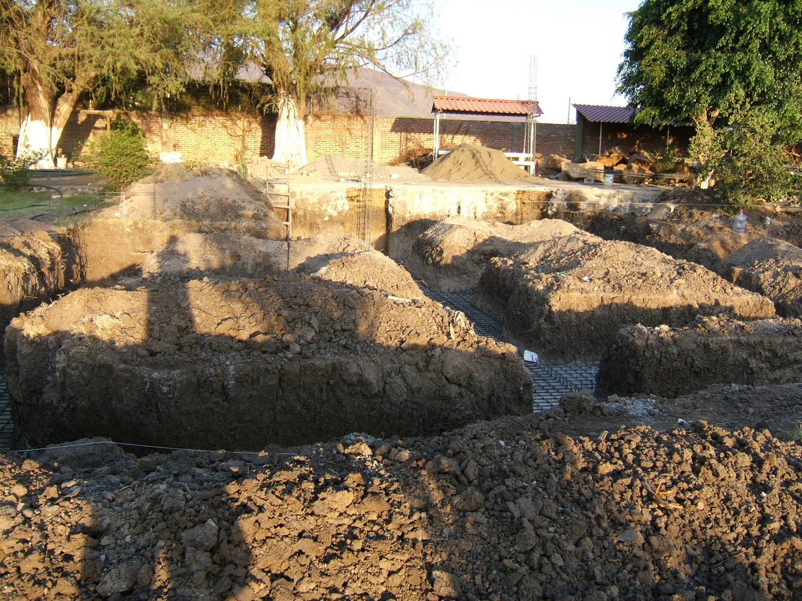 Ésta muestra que se han cavado todos los hoyos de la cimentación. La base está dentro de la capa firme de mineral, la cual tiene 1.0m a 1.3m de profundidad debajo de la tierra negra. Se necesita la profundidad de 2 metros por la altura del patio.