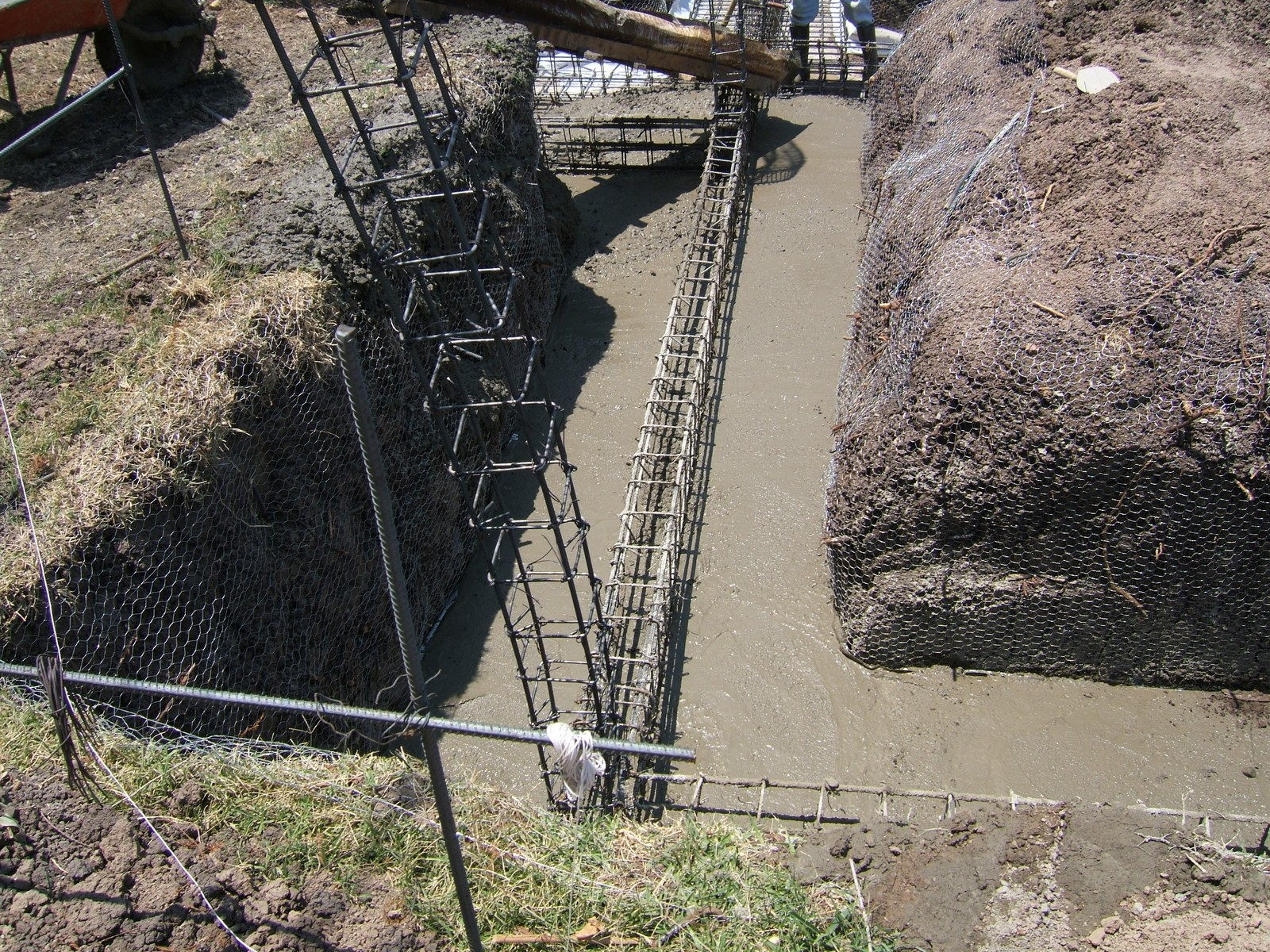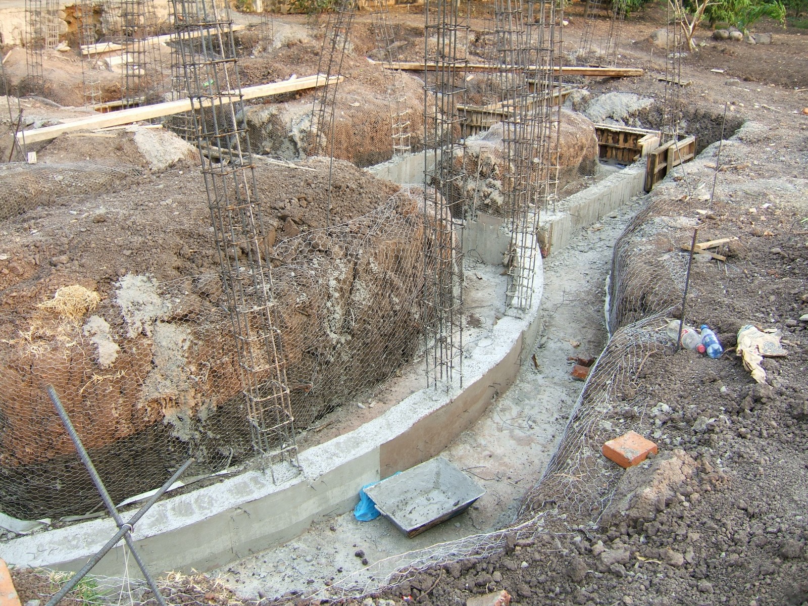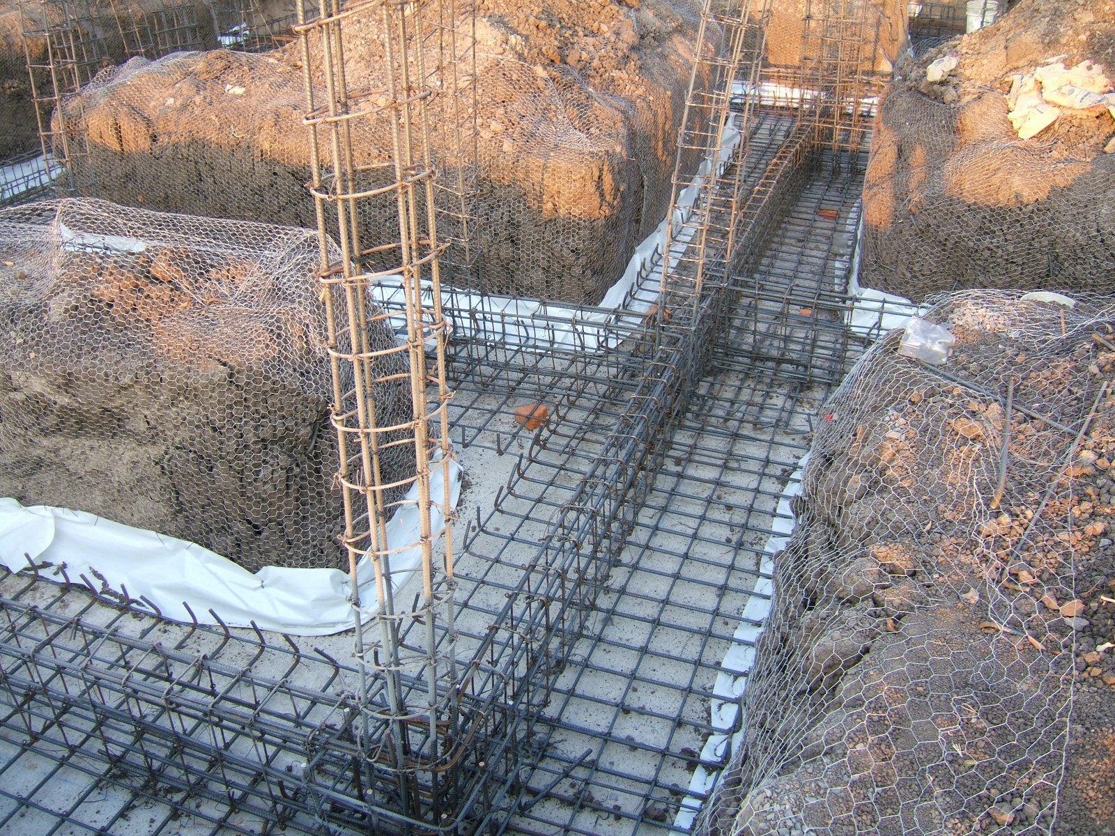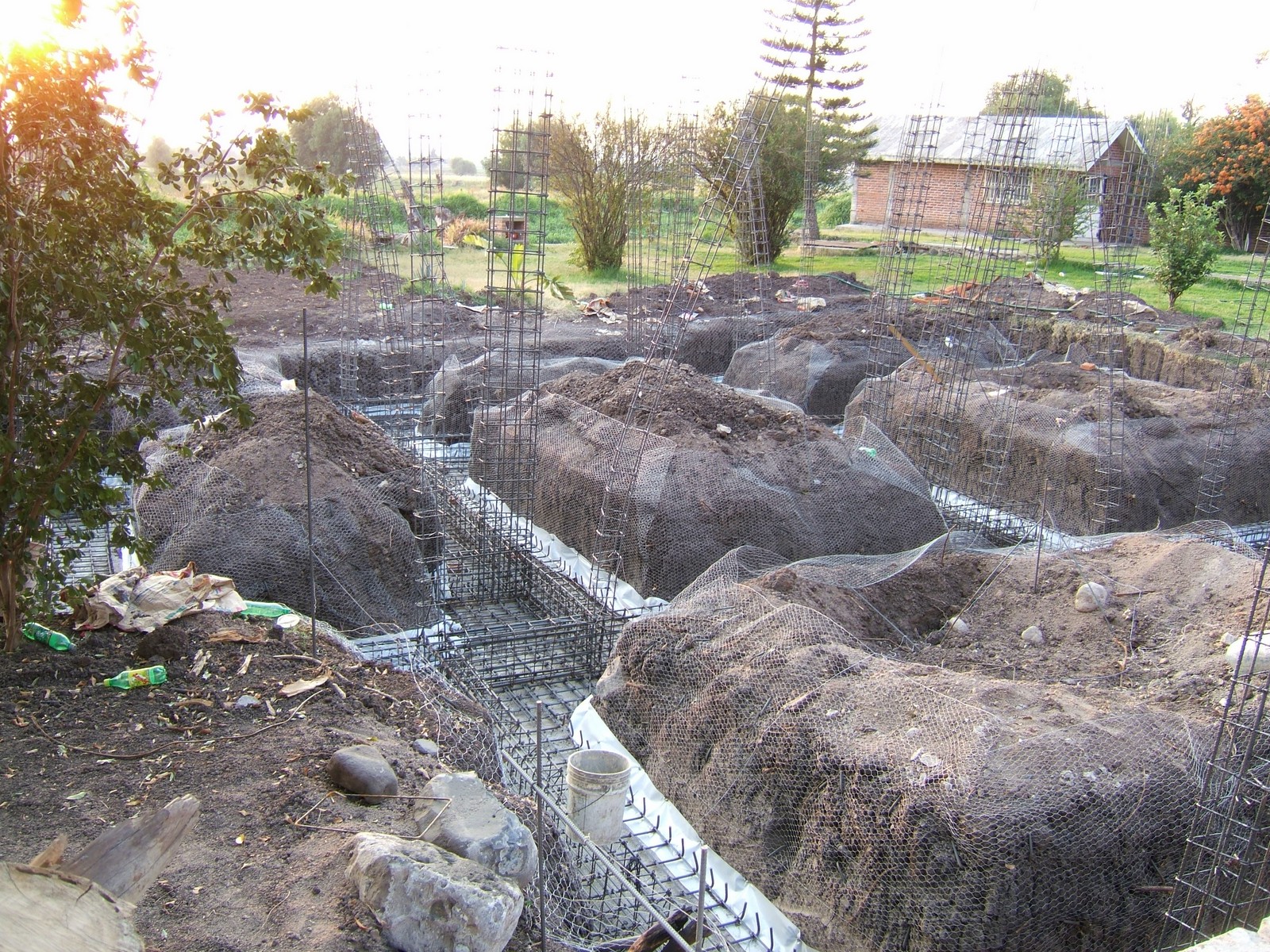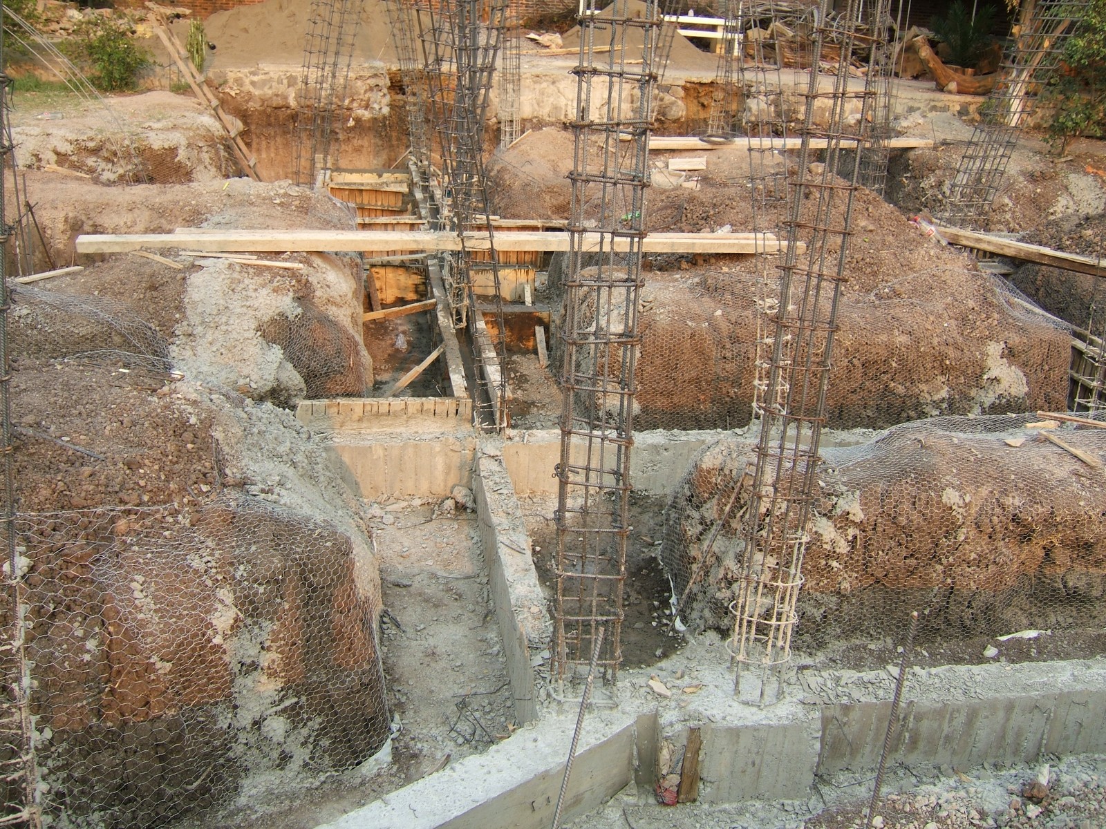 Una vista más próxima de algunos de los elaborados refuerzos de acero. El propósito del alambrado y los marcos de plástico en los montículos de tierra son para evitar la contaminación del concreto que se pondrá.