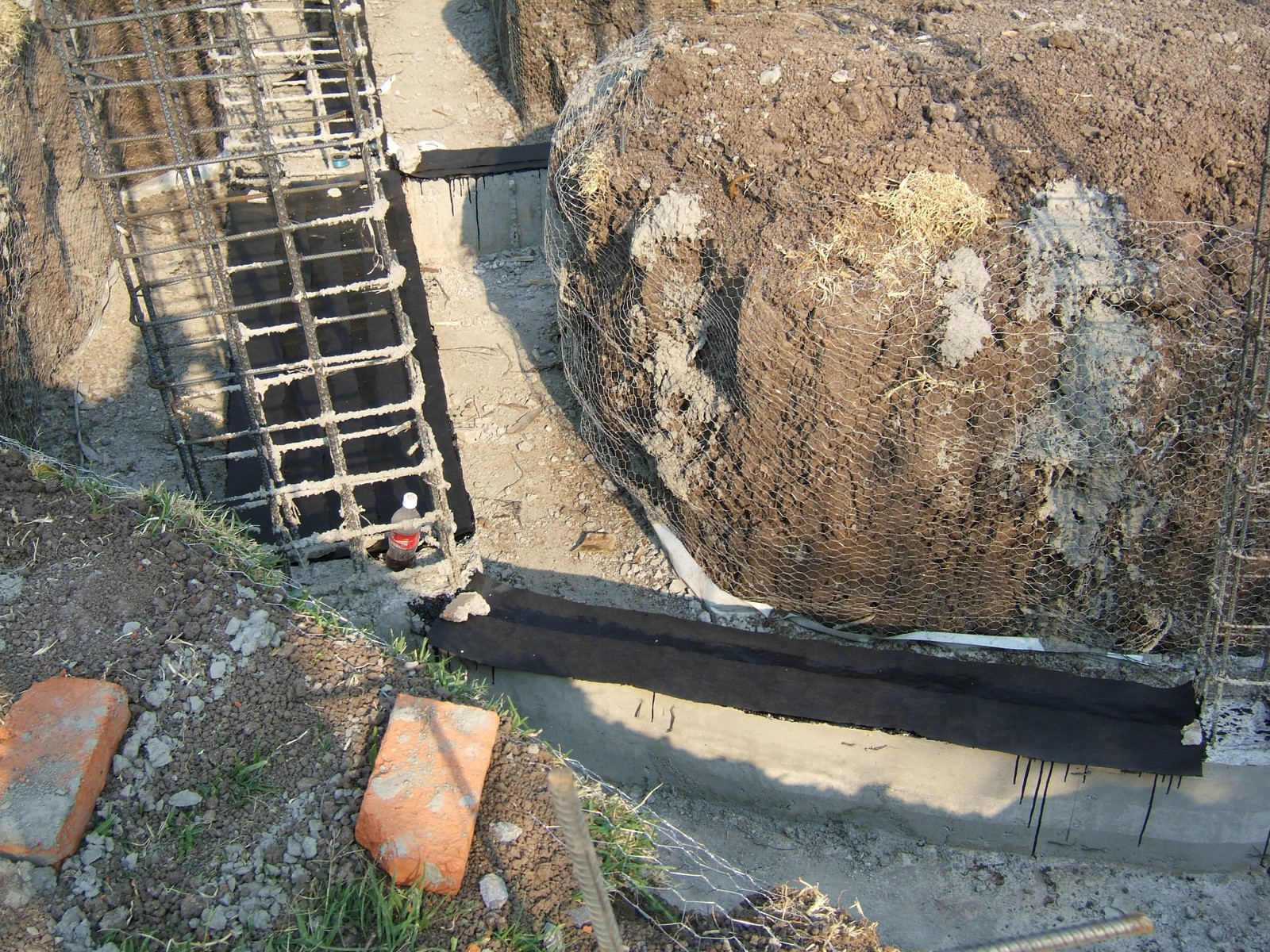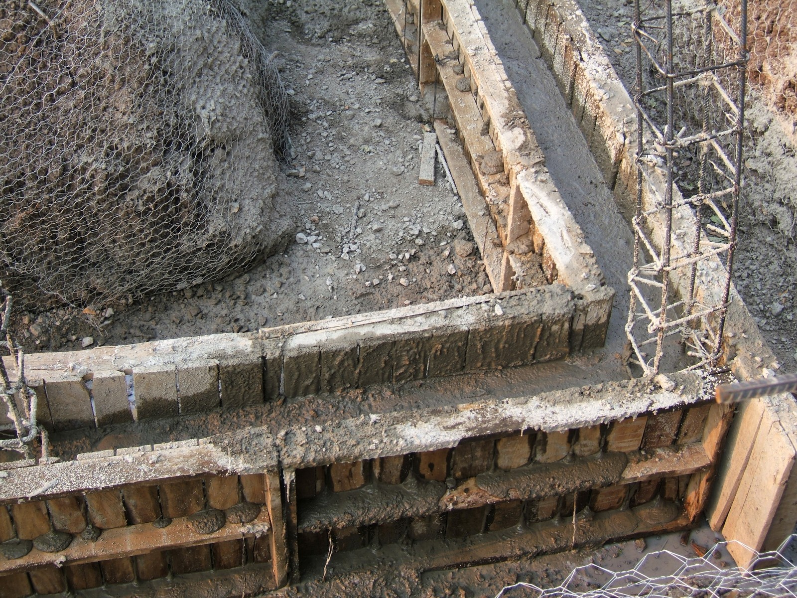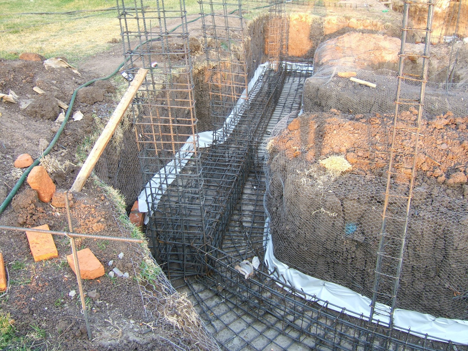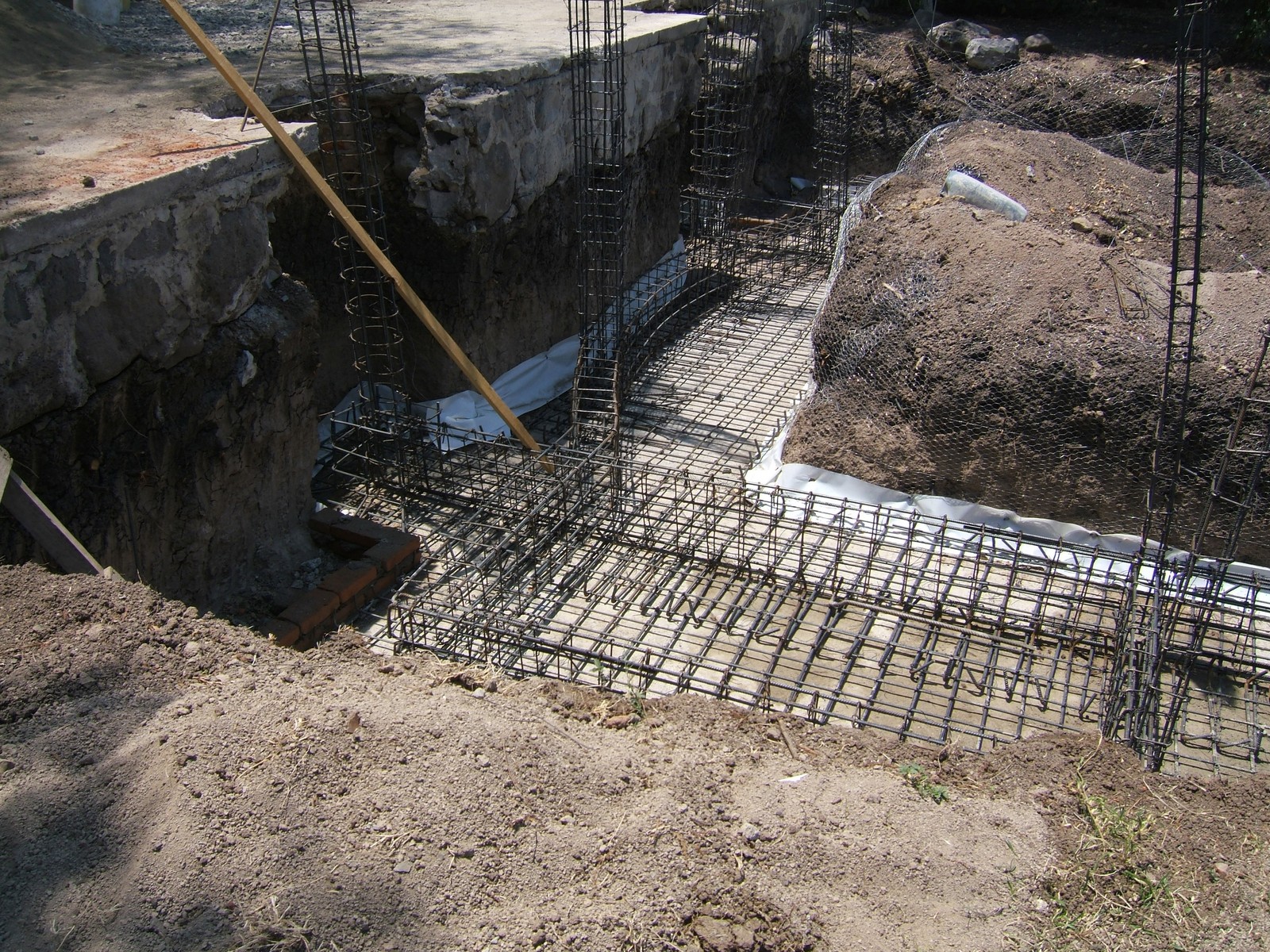 Una vista de los refuerzos de la cimentación que se ve al lado derecho del patio. La entera cimentación es conectada y forma una estructura de soporte que es ambas cohesiva y flexible, distinta de zapatas comunes en una cimentación de piedras. Se puede ver fácilmente la capa firme de mineral con color claro bajo de la tierra oscura.