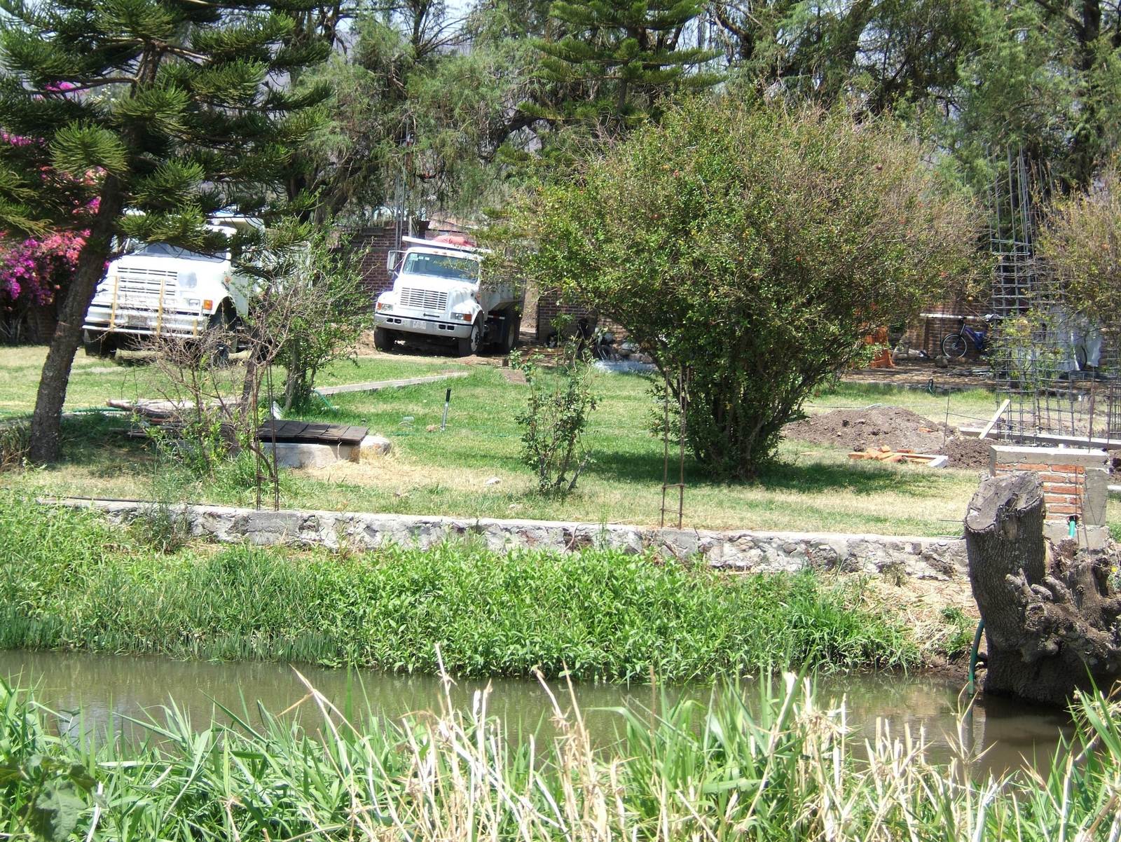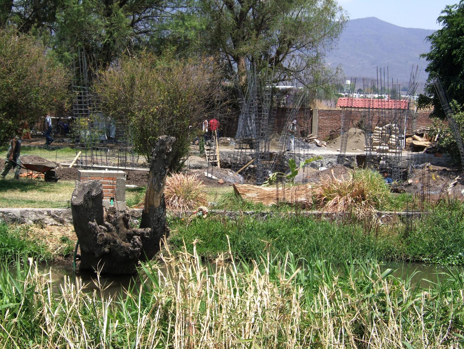 Una perspectiva general desde otro lado del canal, mostrando el hoyo grande en la tierra donde se está construyendo la casa.