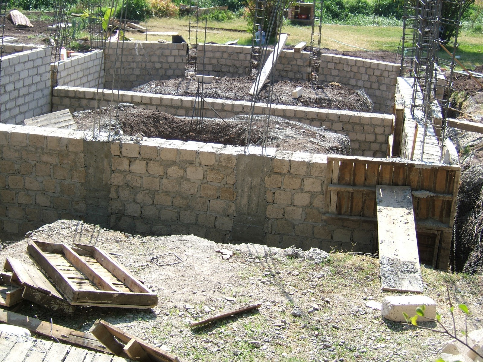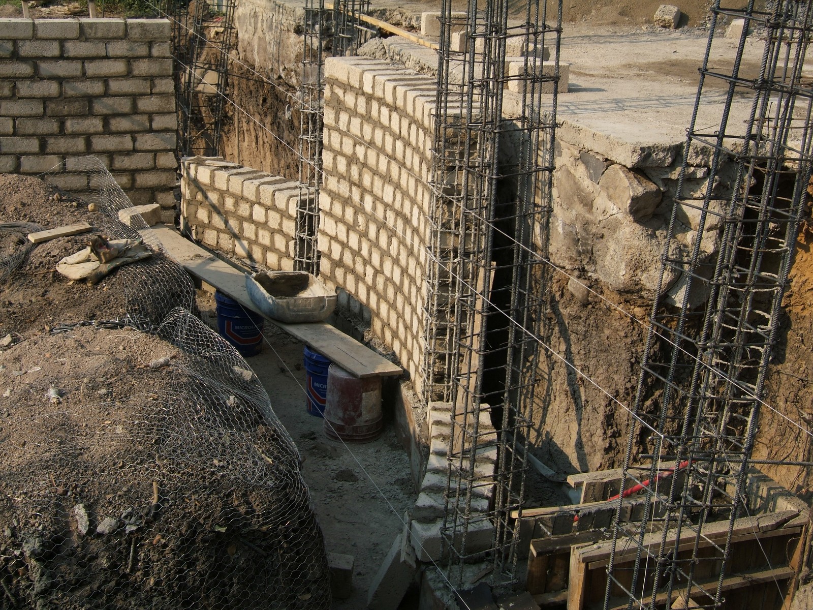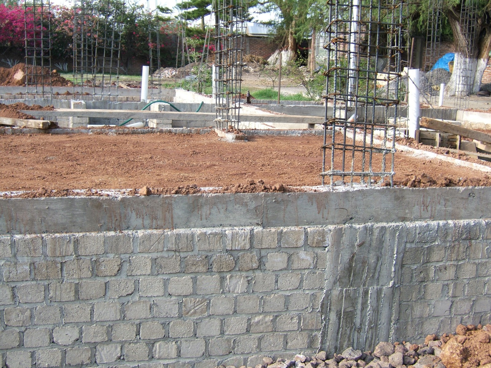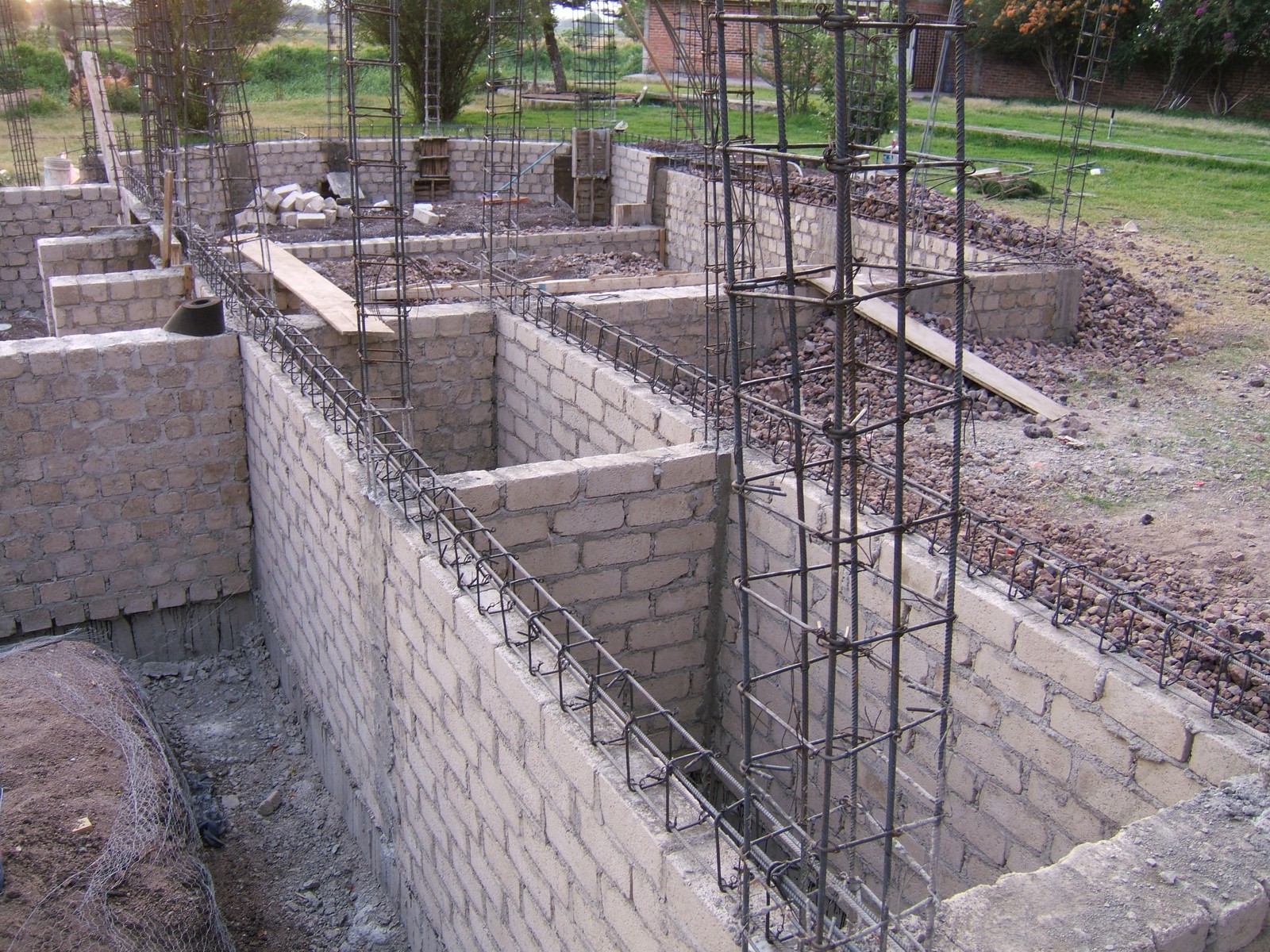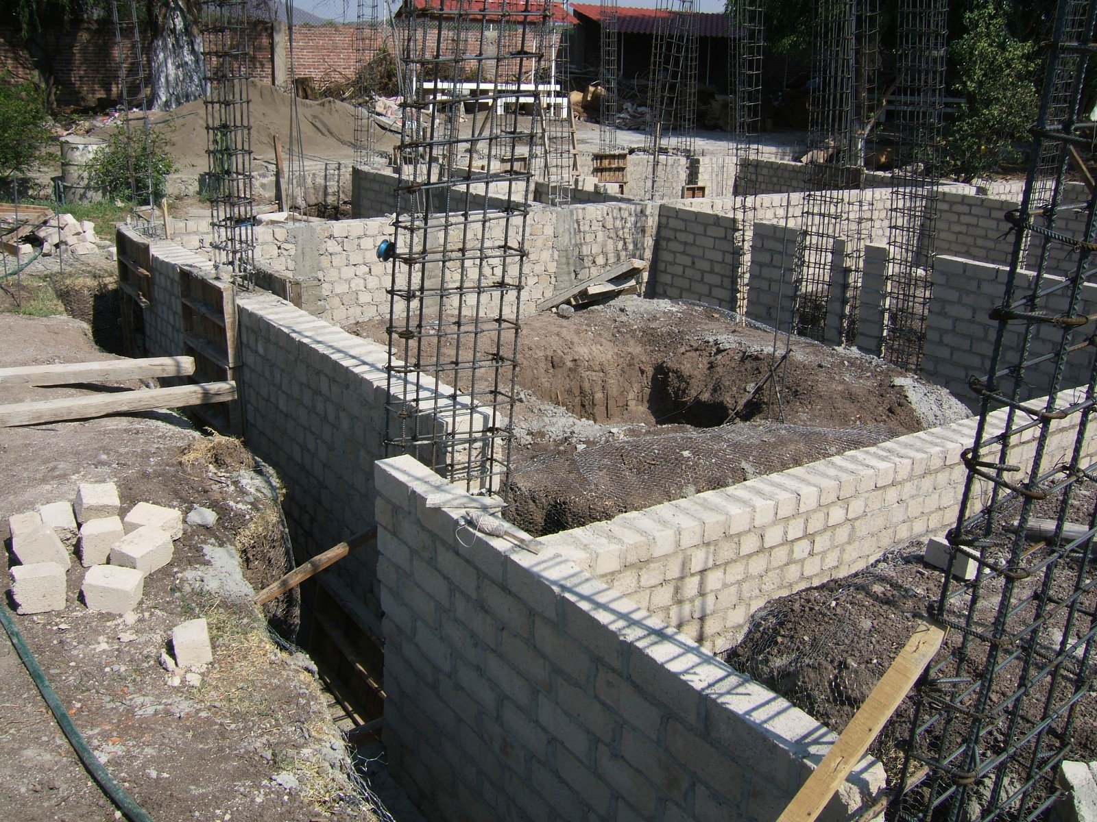 El siguiente paso es el construir los muros de la cimentación encima de las dalas; se usan ladrillos de concreto para más fuerza. Esta perspectiva general muestra el comienzo de este proceso.