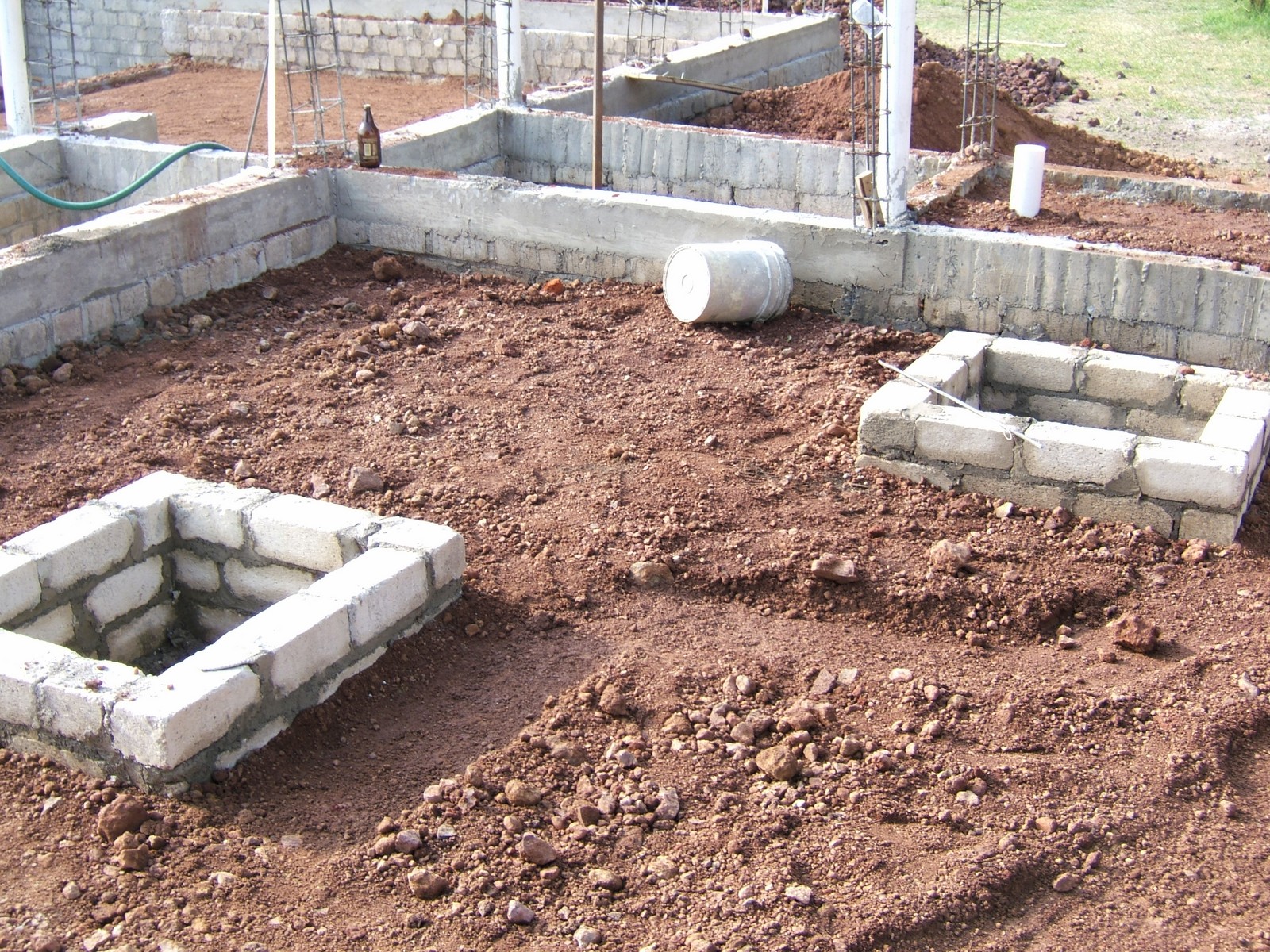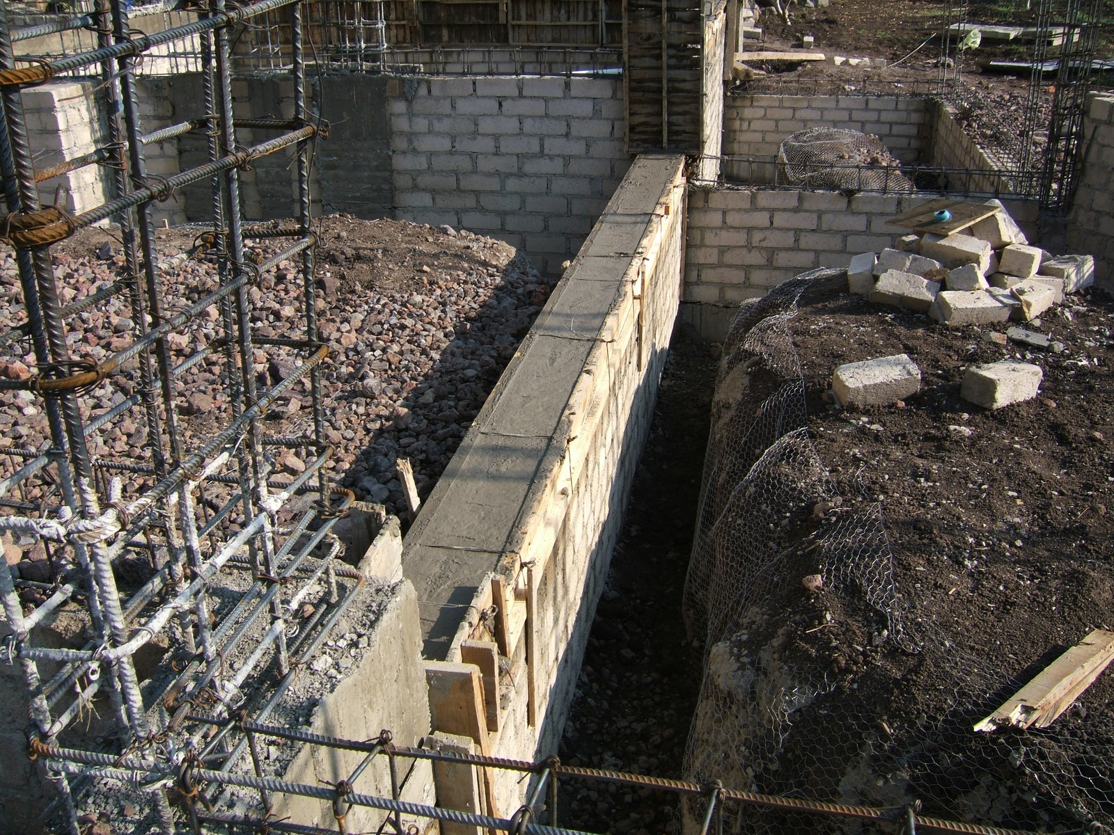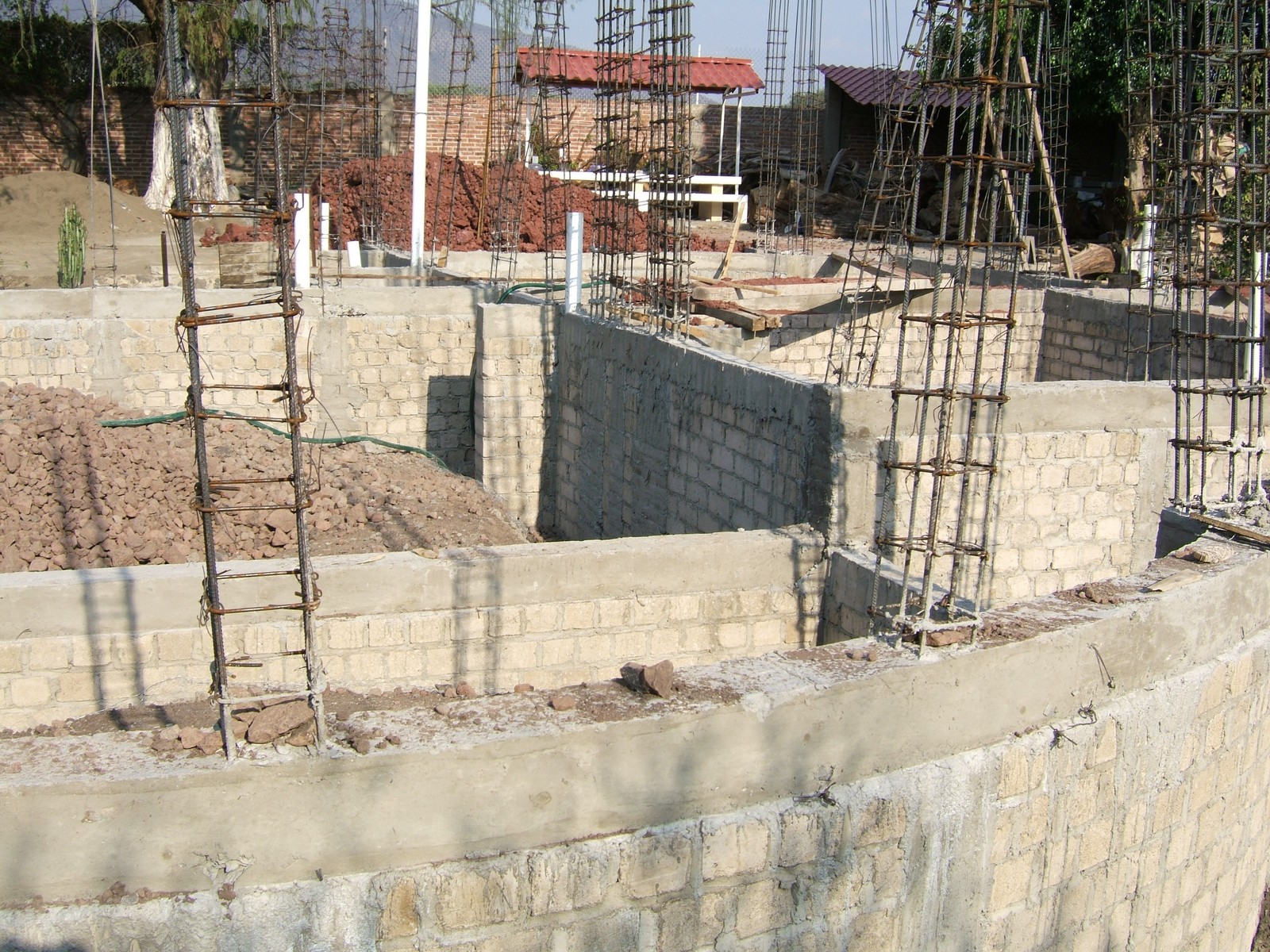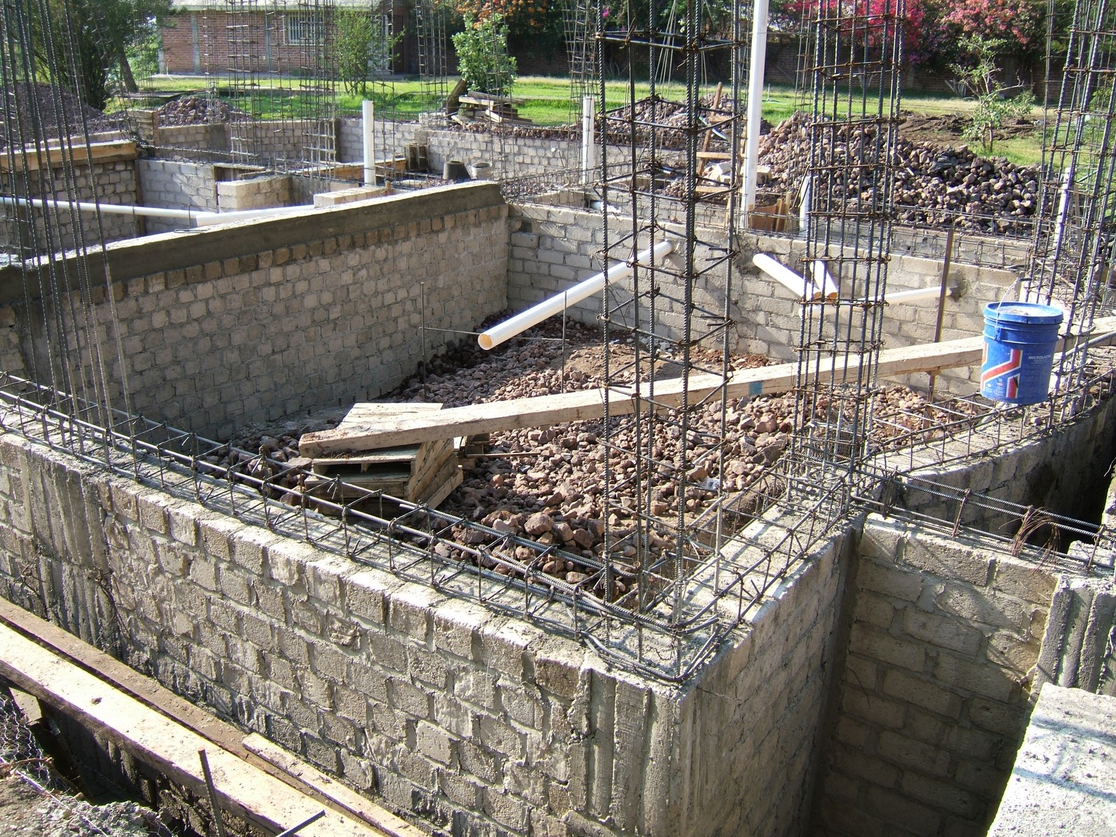 El siguiente paso es el construir los muros de la cimentación encima de las dalas; se usan ladrillos de concreto para más fuerza. Esta perspectiva general muestra el comienzo de este proceso.