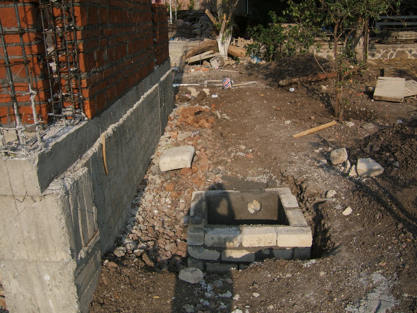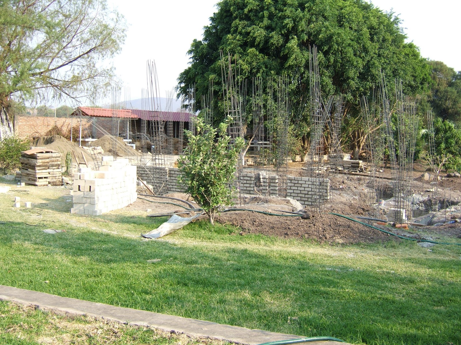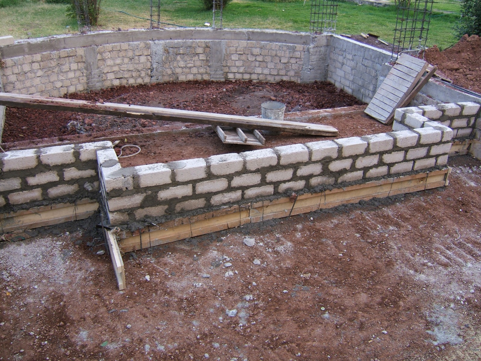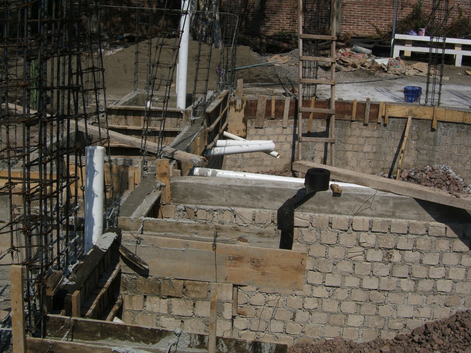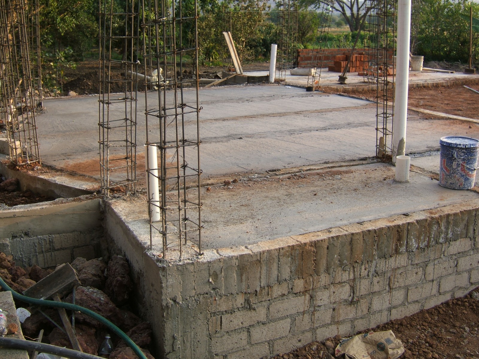 El siguiente paso es el construir los muros de la cimentación encima de las dalas; se usan ladrillos de concreto para más fuerza. Esta perspectiva general muestra el comienzo de este proceso.