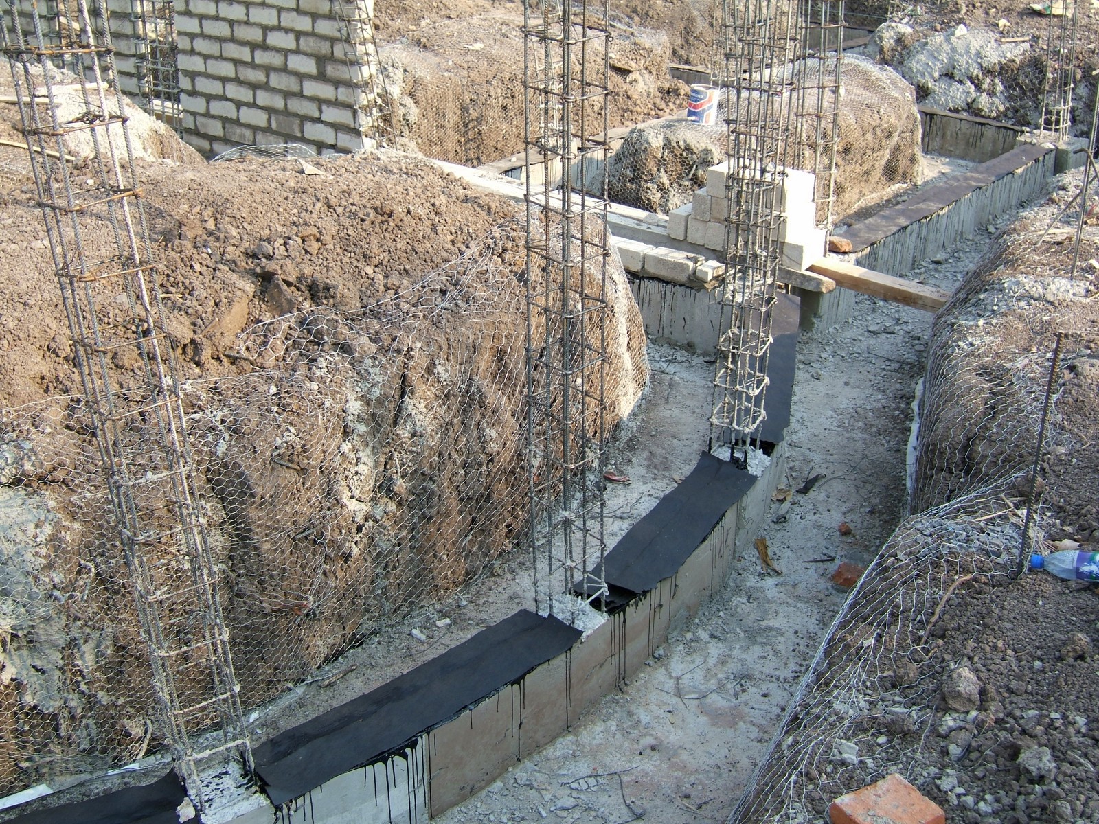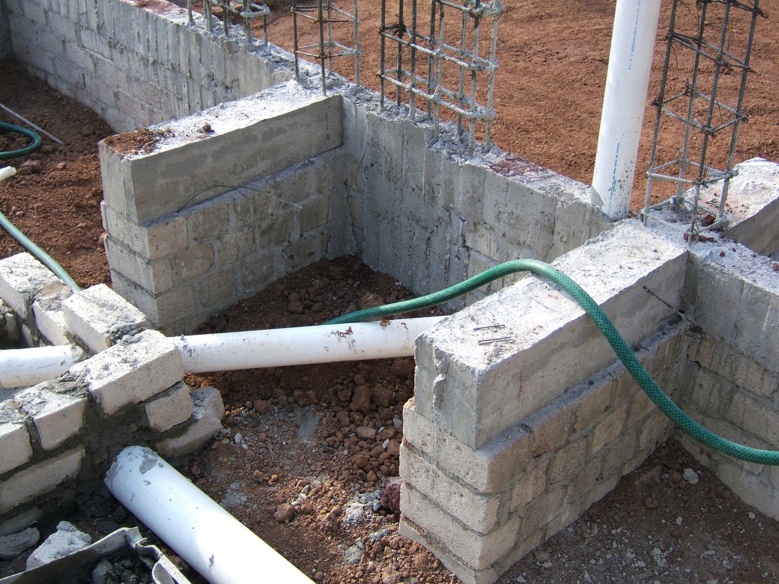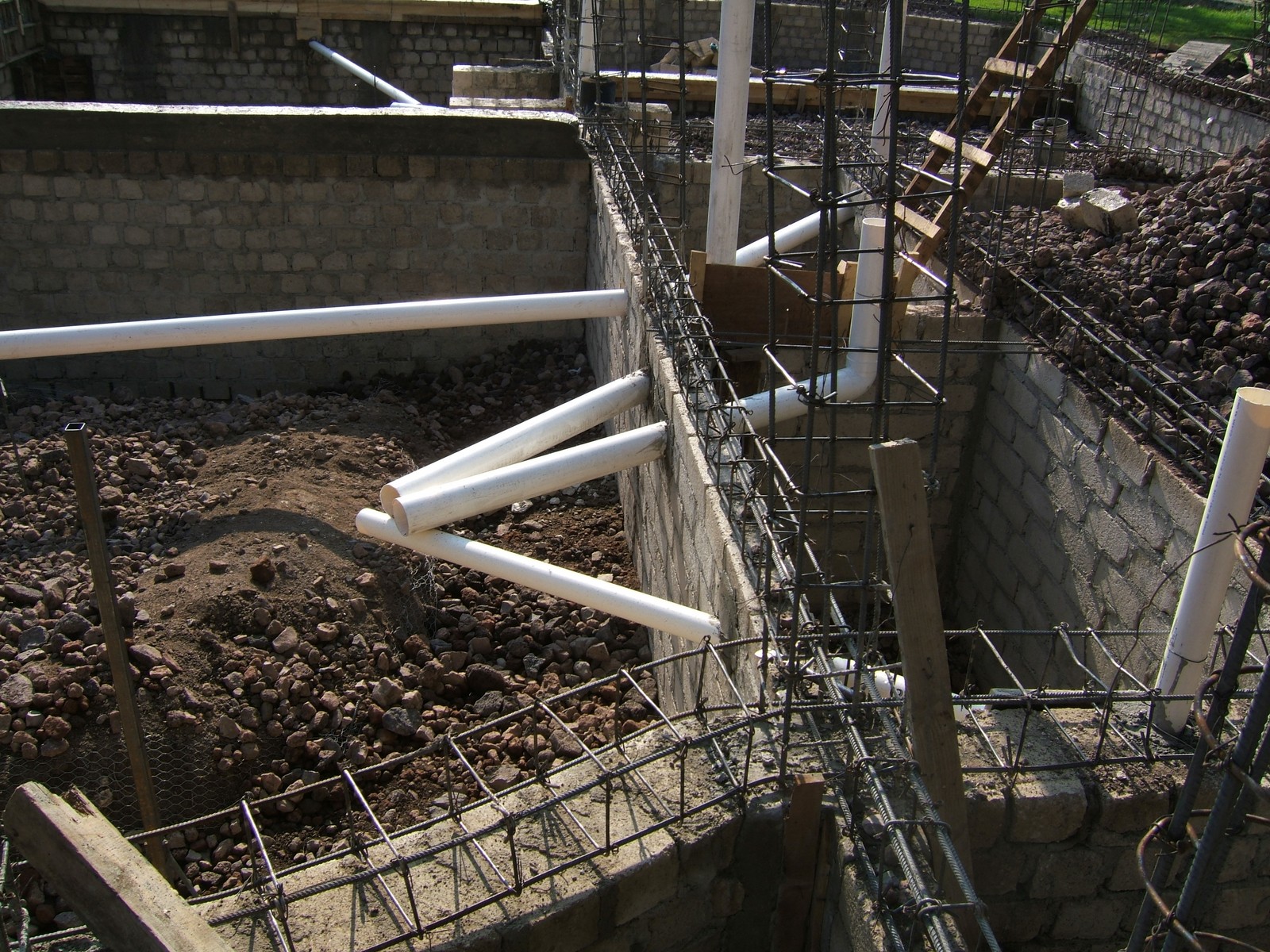 Una parte de la cimentación, mostrando unos muros terminados de la cimentación y tubos de drenaje que se han instalado.