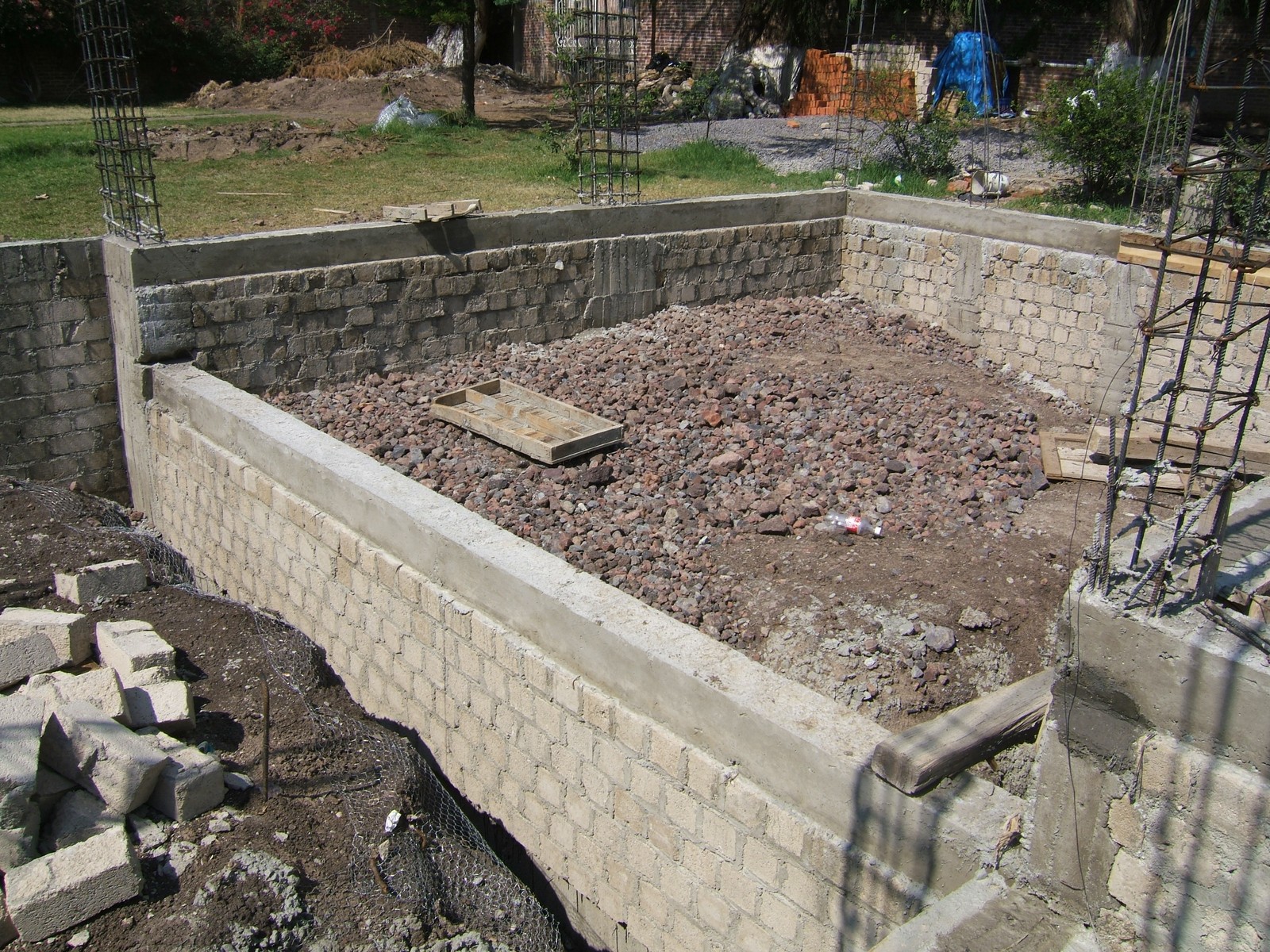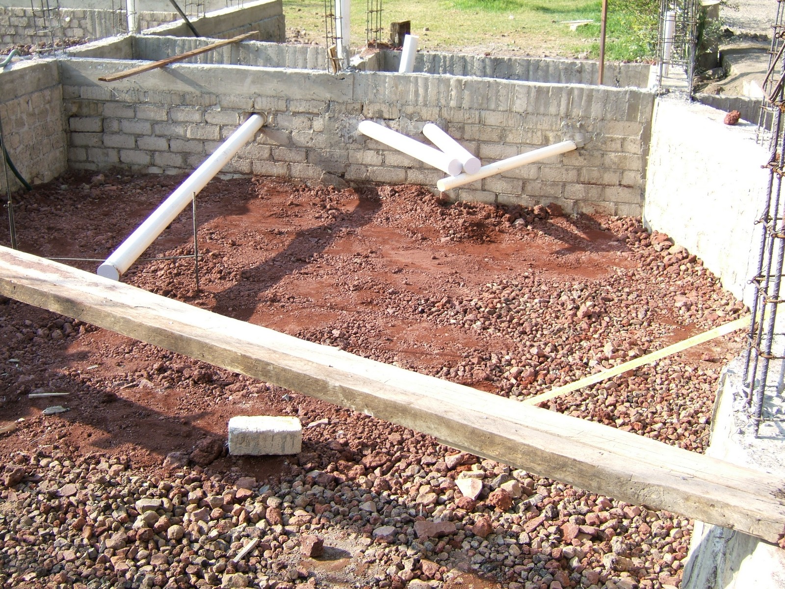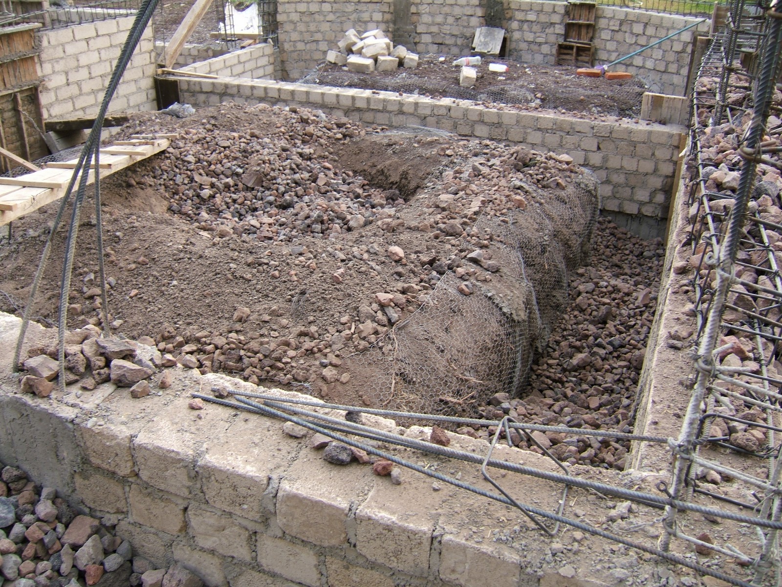 Ahora todos los espacios entre los muros de la cimentación son llenados con roca y grava. Esto aplica también a las zanjas afuera de la cimentación.
