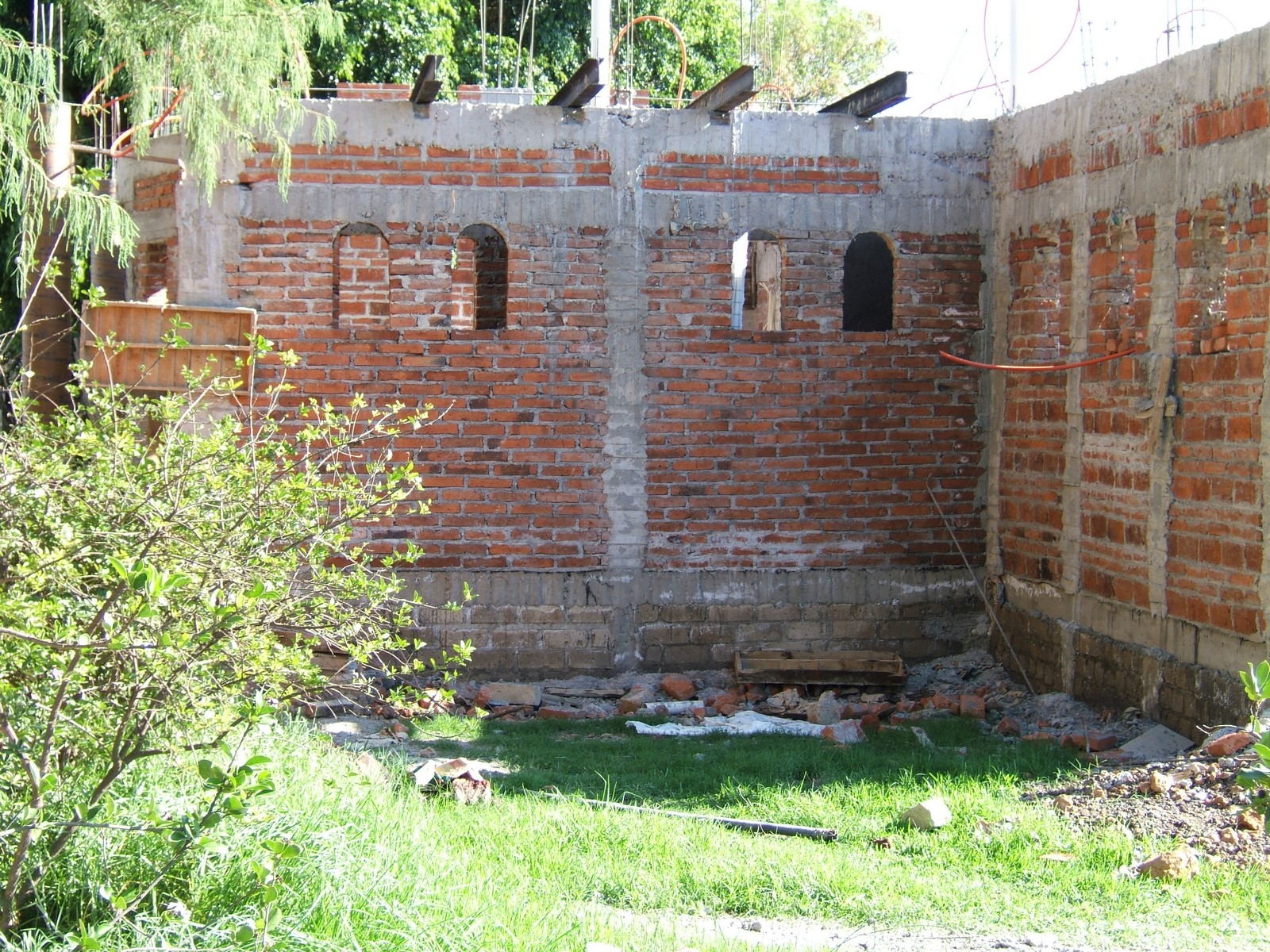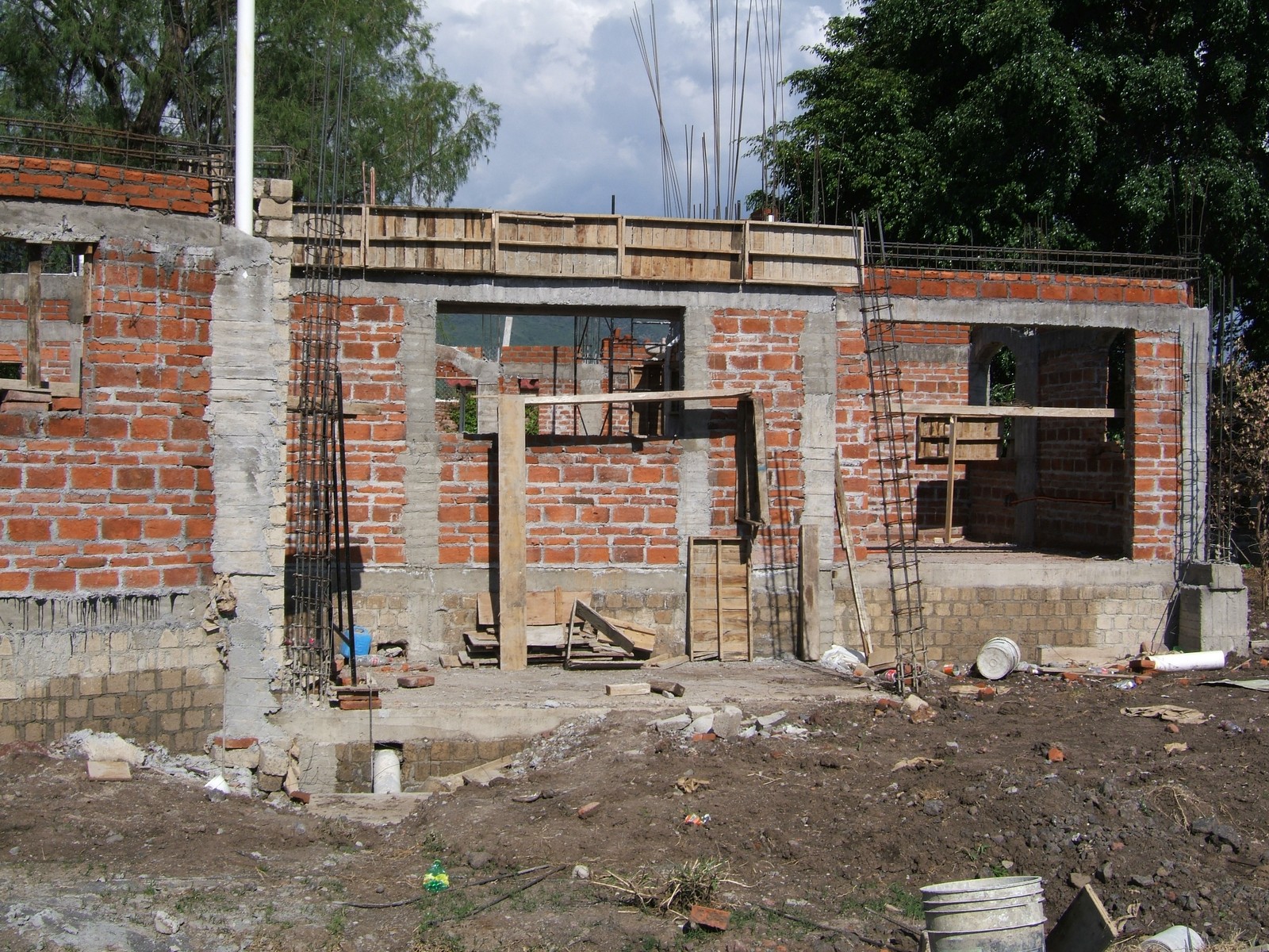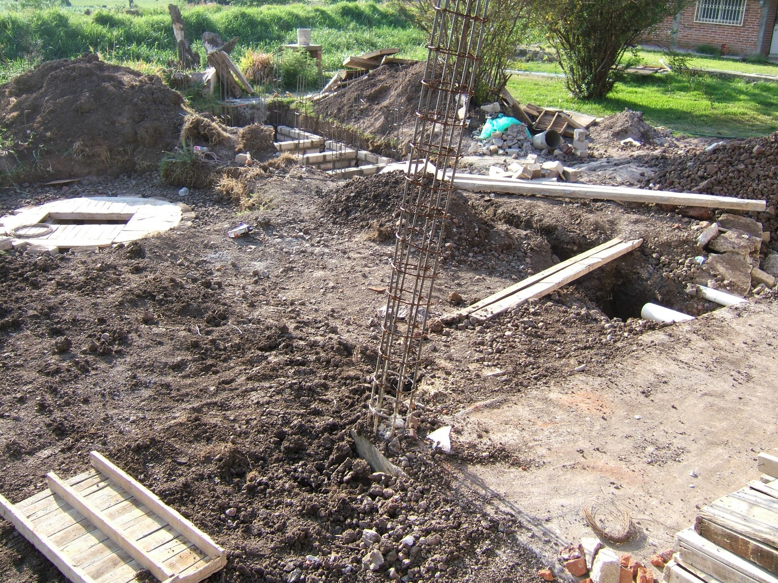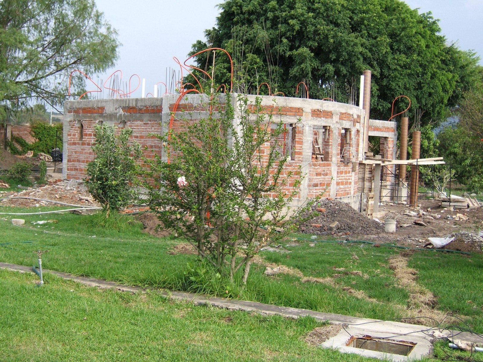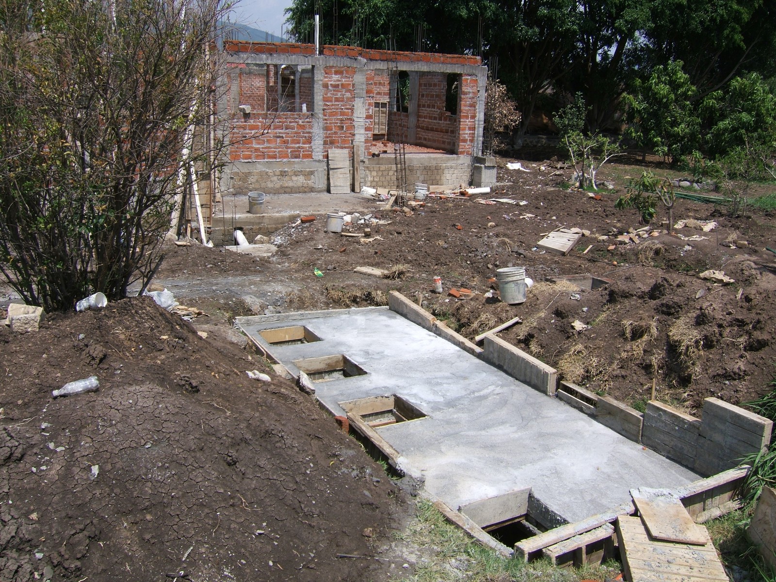 La fosa séptica cubierta, con la cocina y la sala familiar en el fondo. Actualmente las paredes de la casa tienen un altura de 2.5 metros; con una dala que tiene una altura de 20cm, que dará una altura de 2.7 metros.