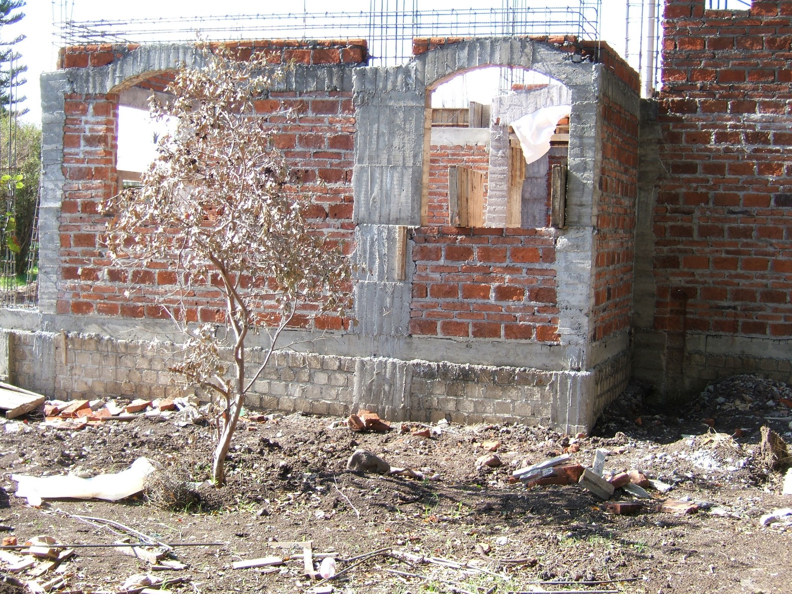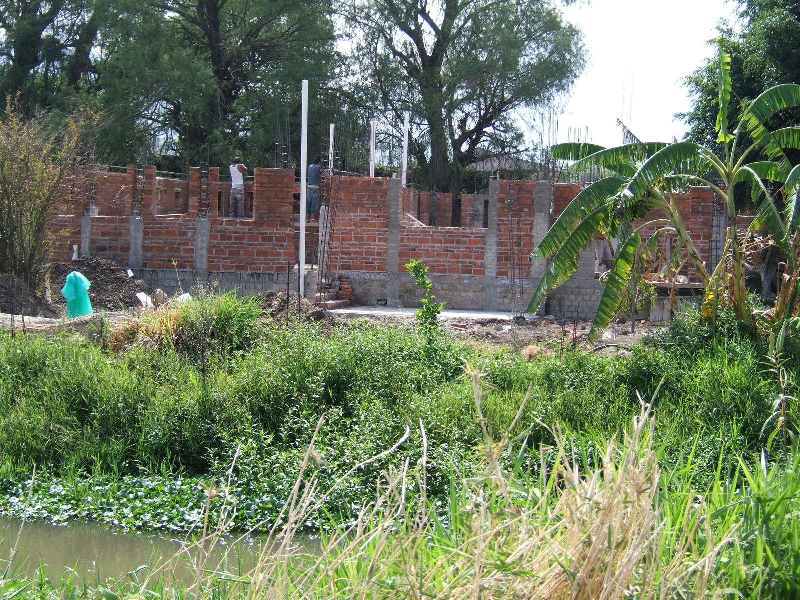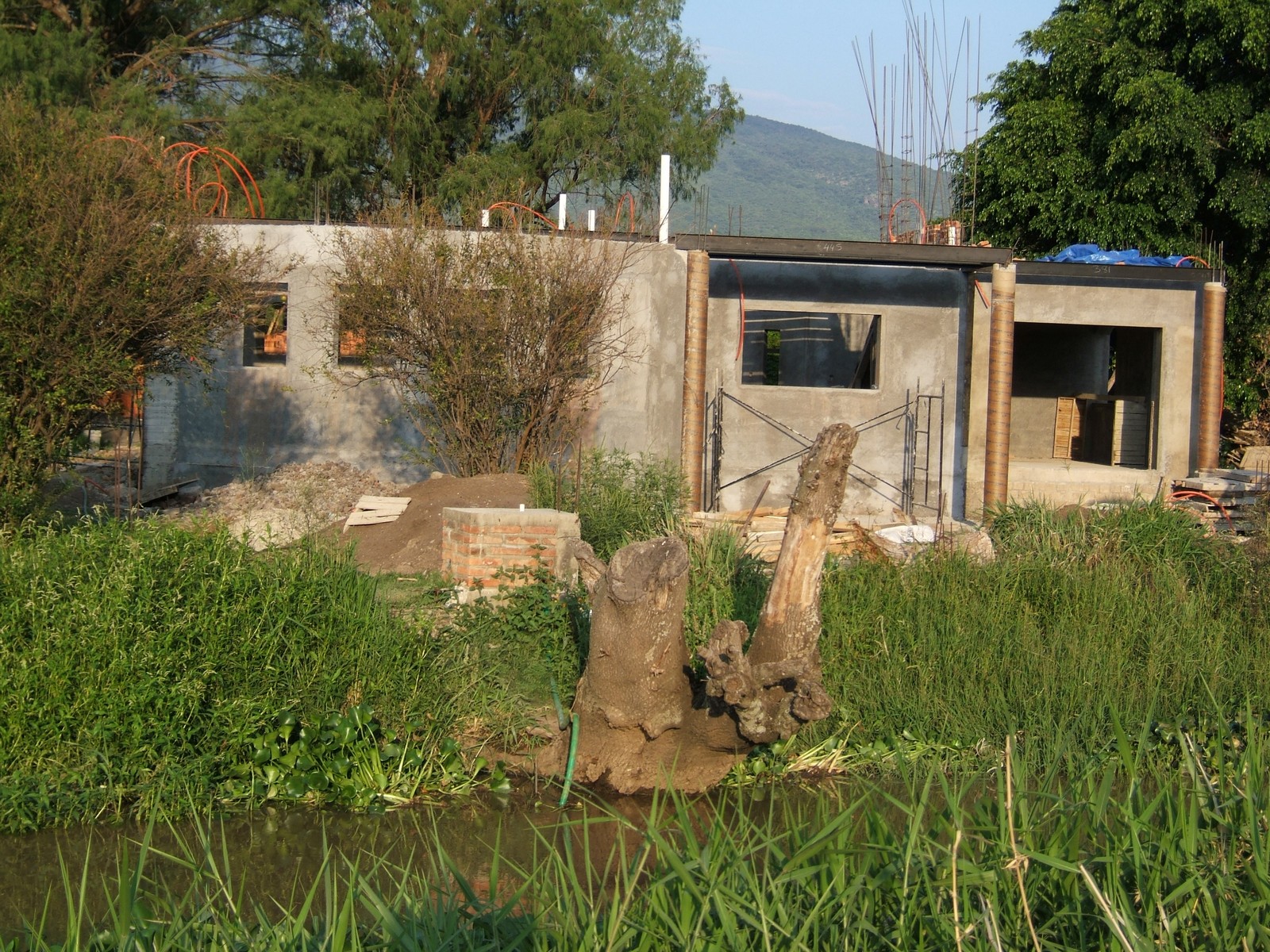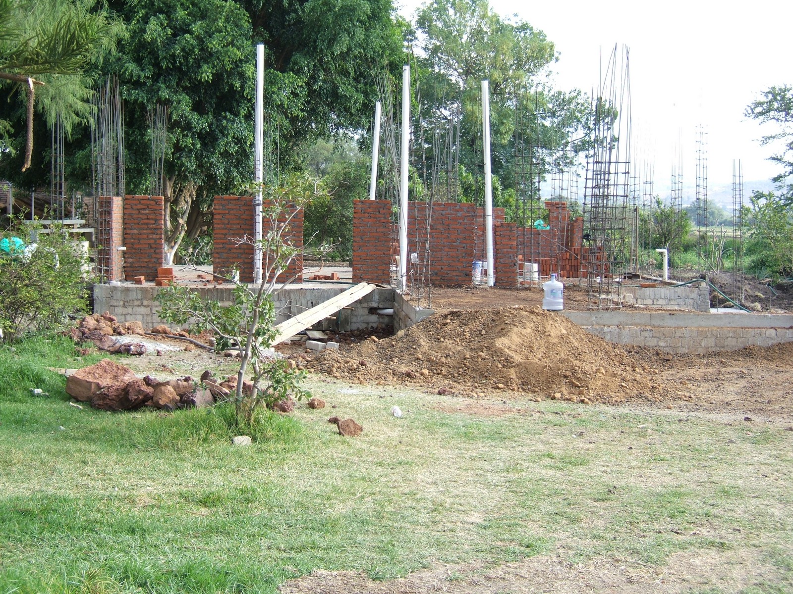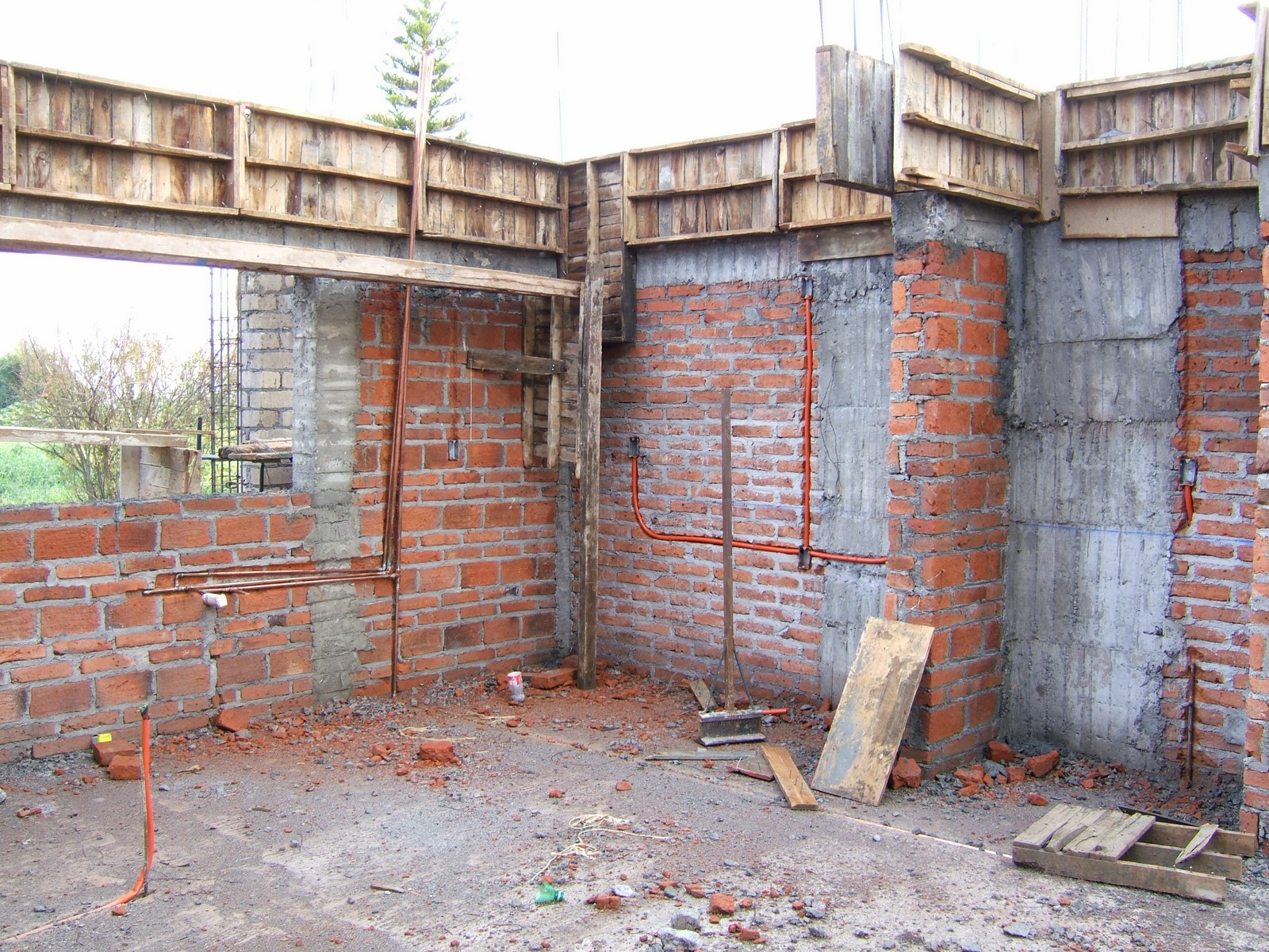 La fosa séptica cubierta, con la cocina y la sala familiar en el fondo. Actualmente las paredes de la casa tienen un altura de 2.5 metros; con una dala que tiene una altura de 20cm, que dará una altura de 2.7 metros.