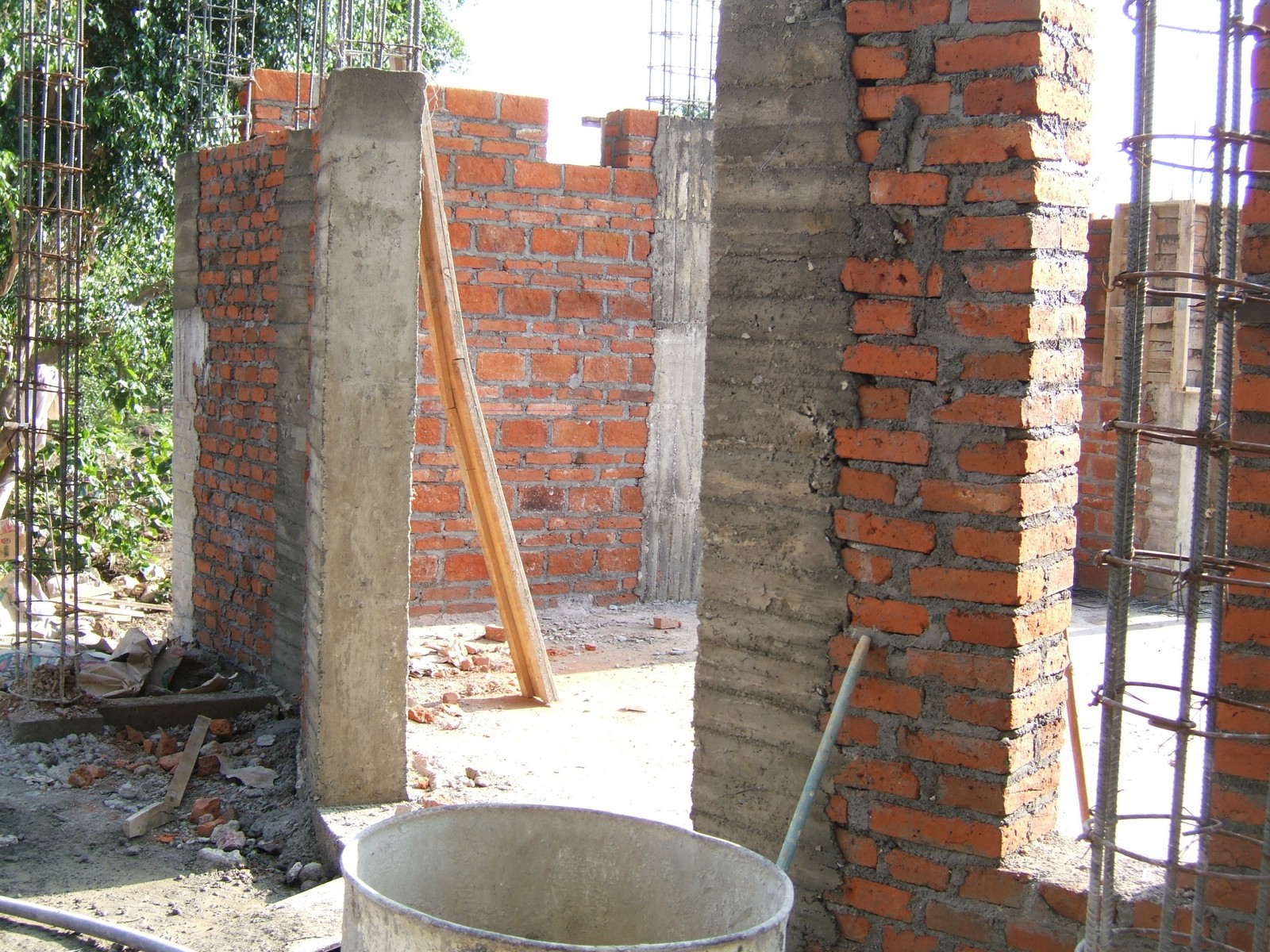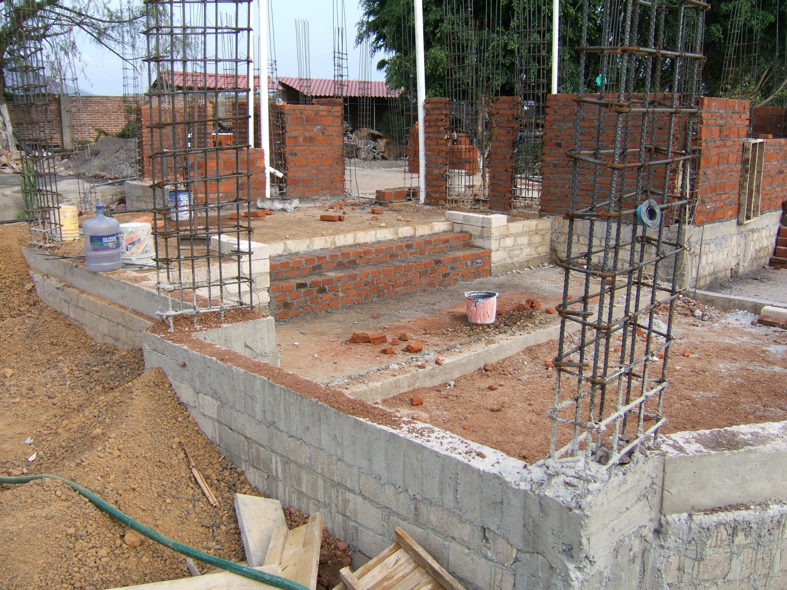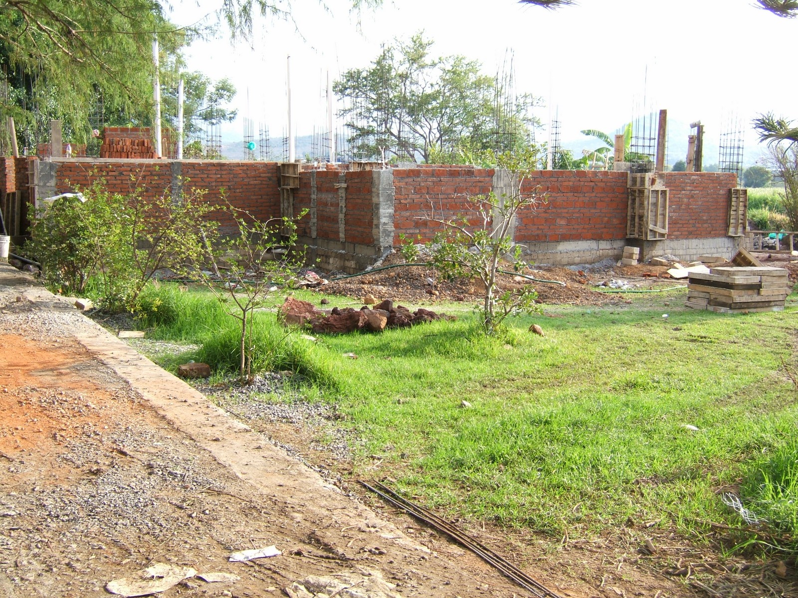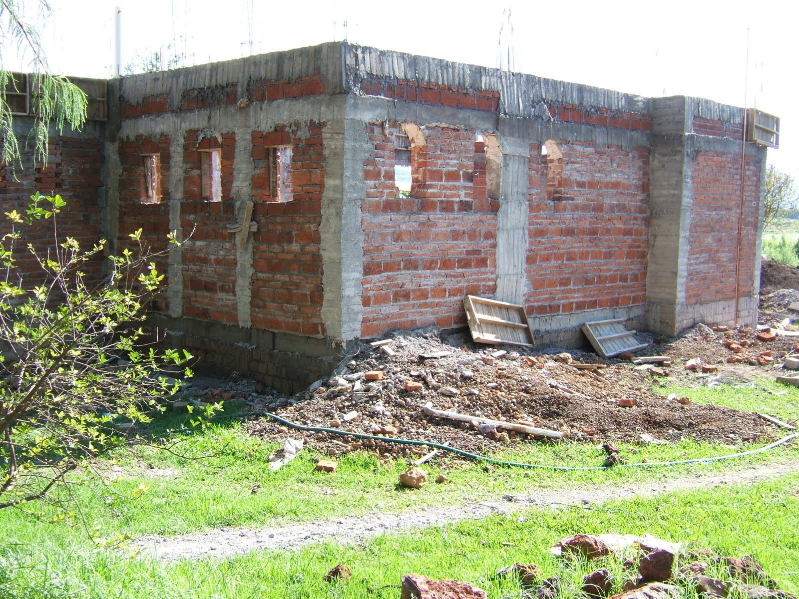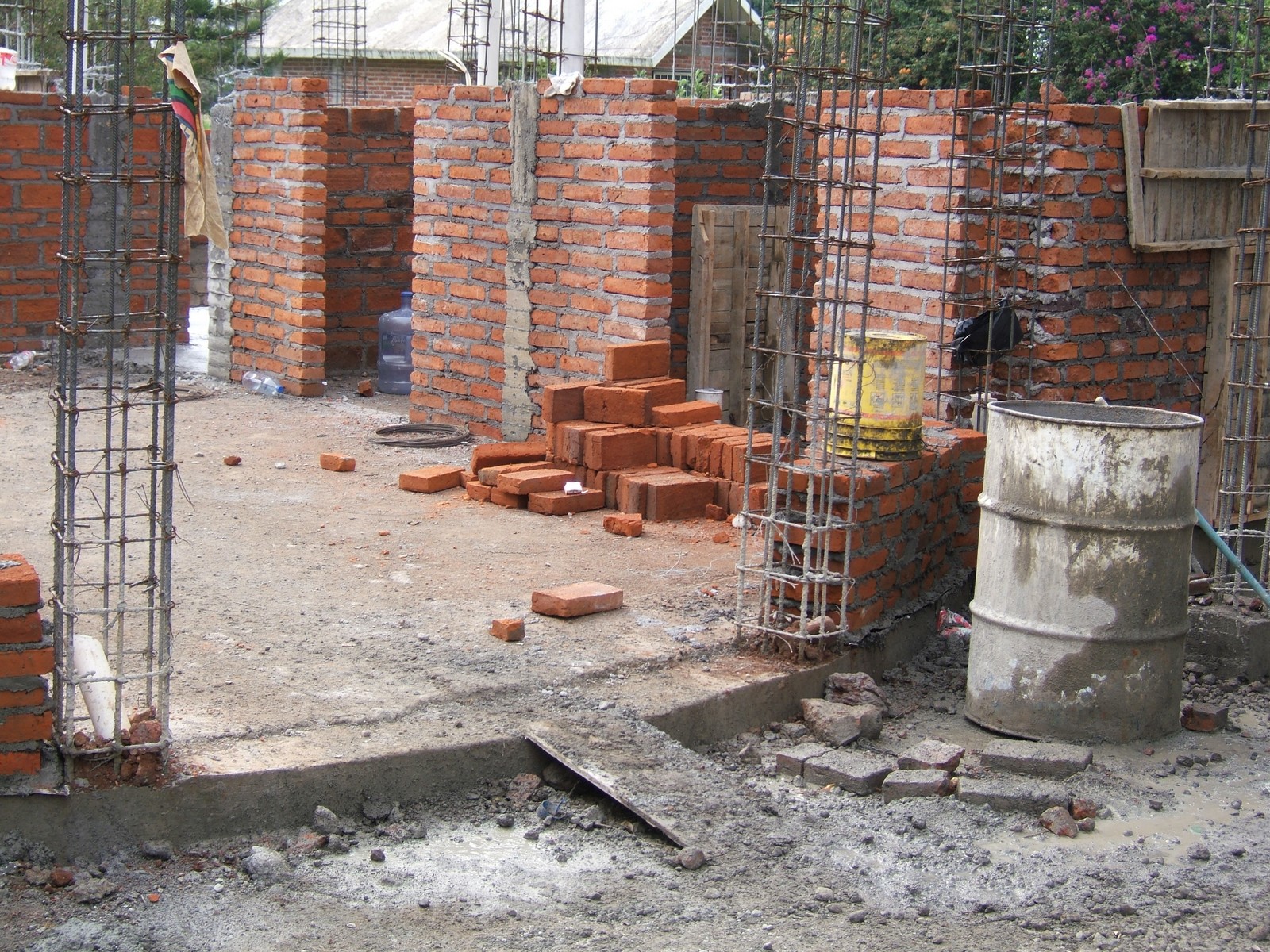 La fosa séptica cubierta, con la cocina y la sala familiar en el fondo. Actualmente las paredes de la casa tienen un altura de 2.5 metros; con una dala que tiene una altura de 20cm, que dará una altura de 2.7 metros.
