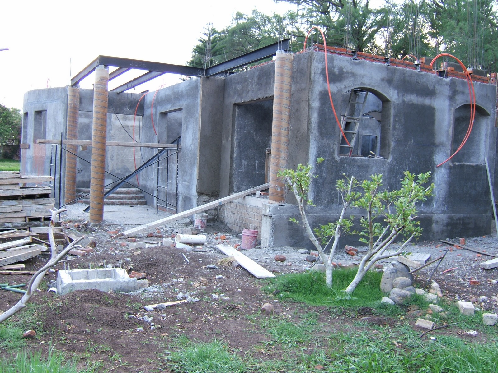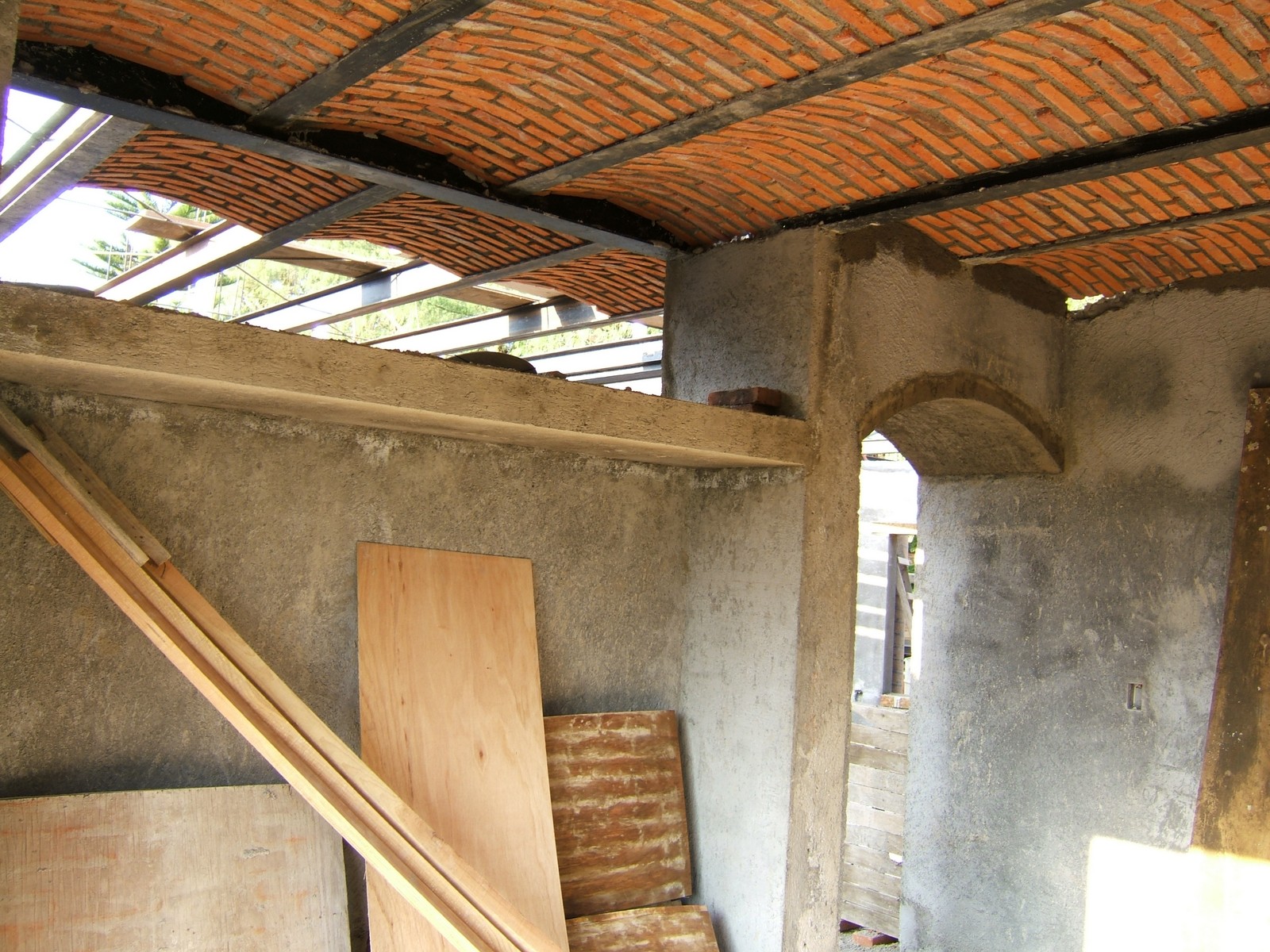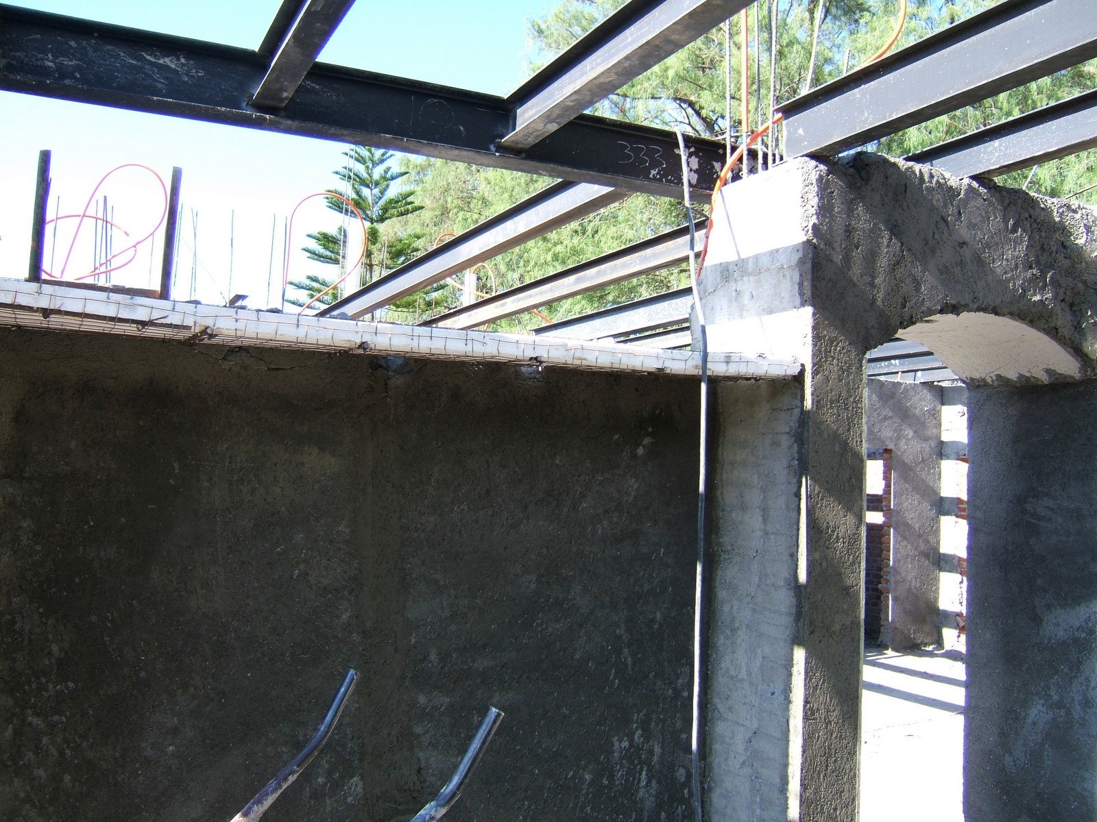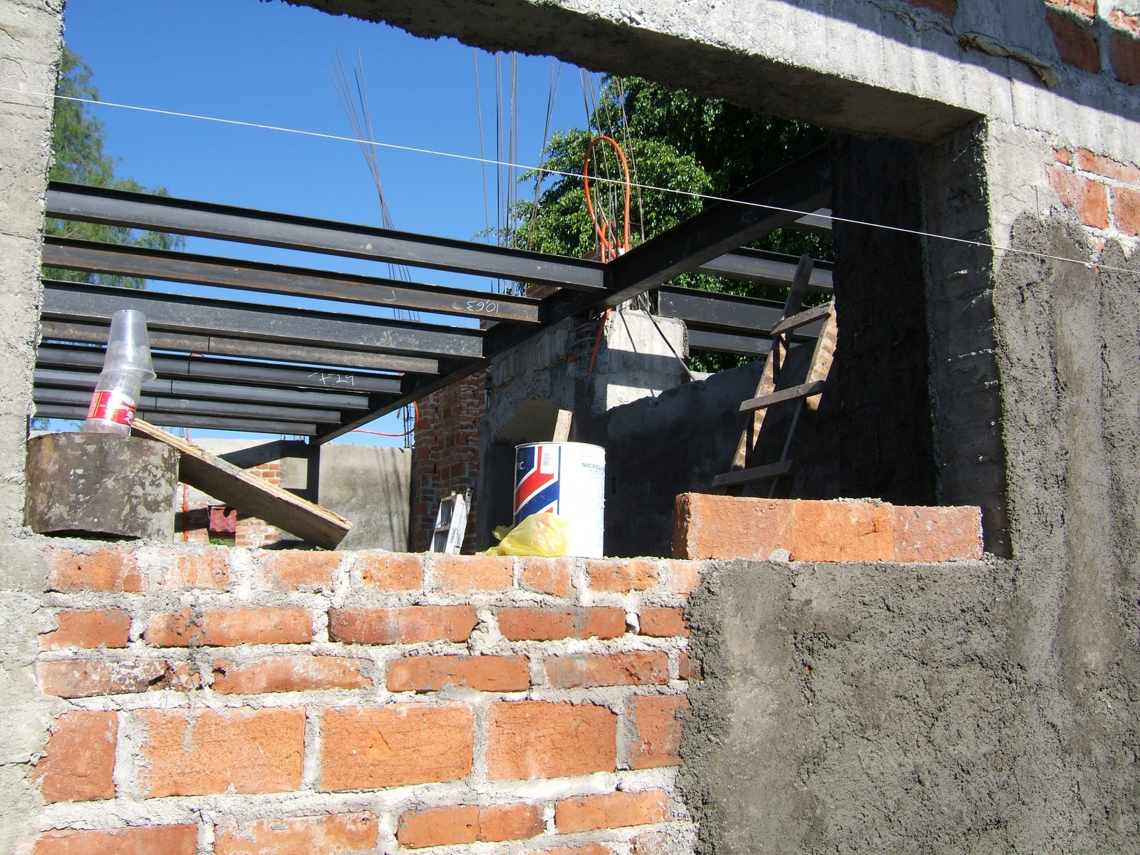 En este momento, el trabajo sobre las viguetas de acero está casi terminado, así es el cubrir del interior y el exterior de la casa con cemento. Se acaba de comenzar el trabajo sobre los techos de bóveda en la sala familiar.