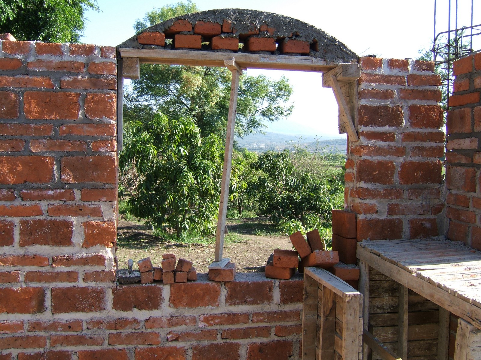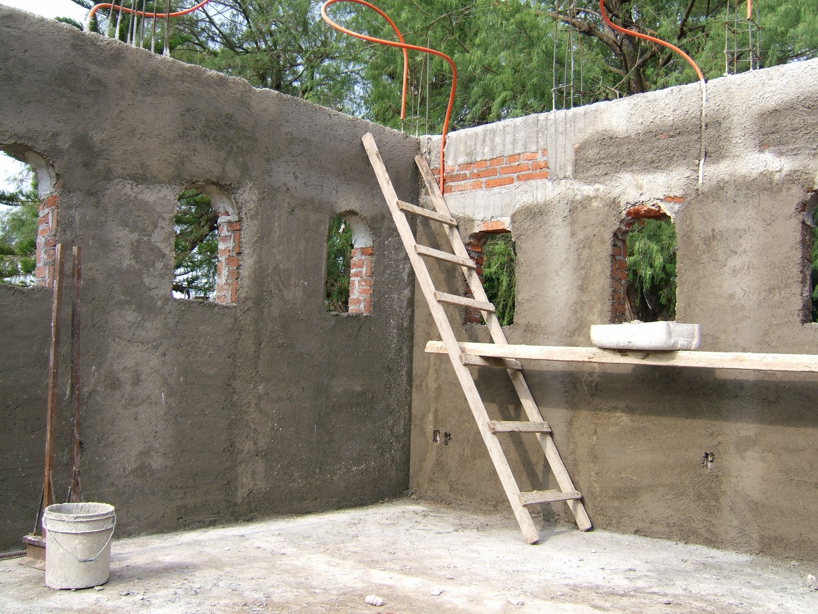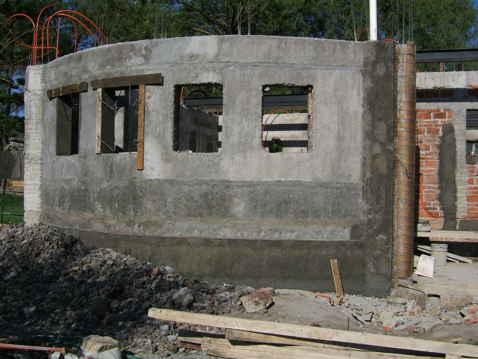 En este momento, el trabajo sobre las viguetas de acero está casi terminado, así es el cubrir del interior y el exterior de la casa con cemento. Se acaba de comenzar el trabajo sobre los techos de bóveda en la sala familiar.