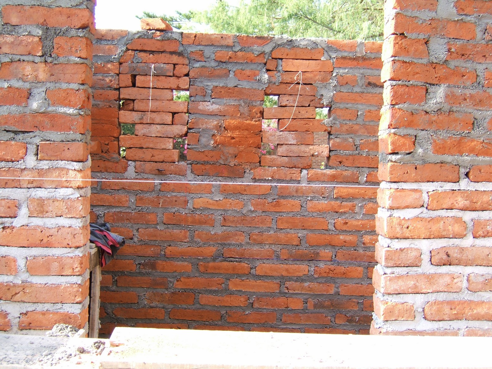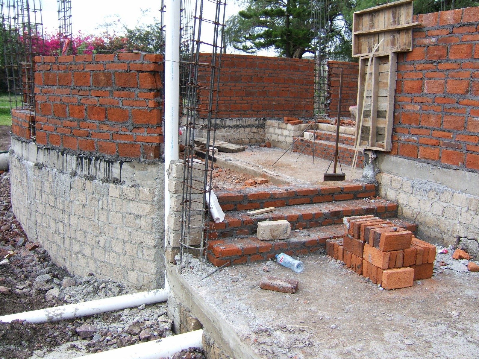La entrada, mostrando que se han construido las paredes para tener una altura de 2.1 metros; esta es la altura de arriba de la mayoría de las ventanas donde se pondrán dalas. Una excepción es a la izquierda del recibidor; aquí las paredes tienen más altura con ventanas escalonadas por las escaleras.