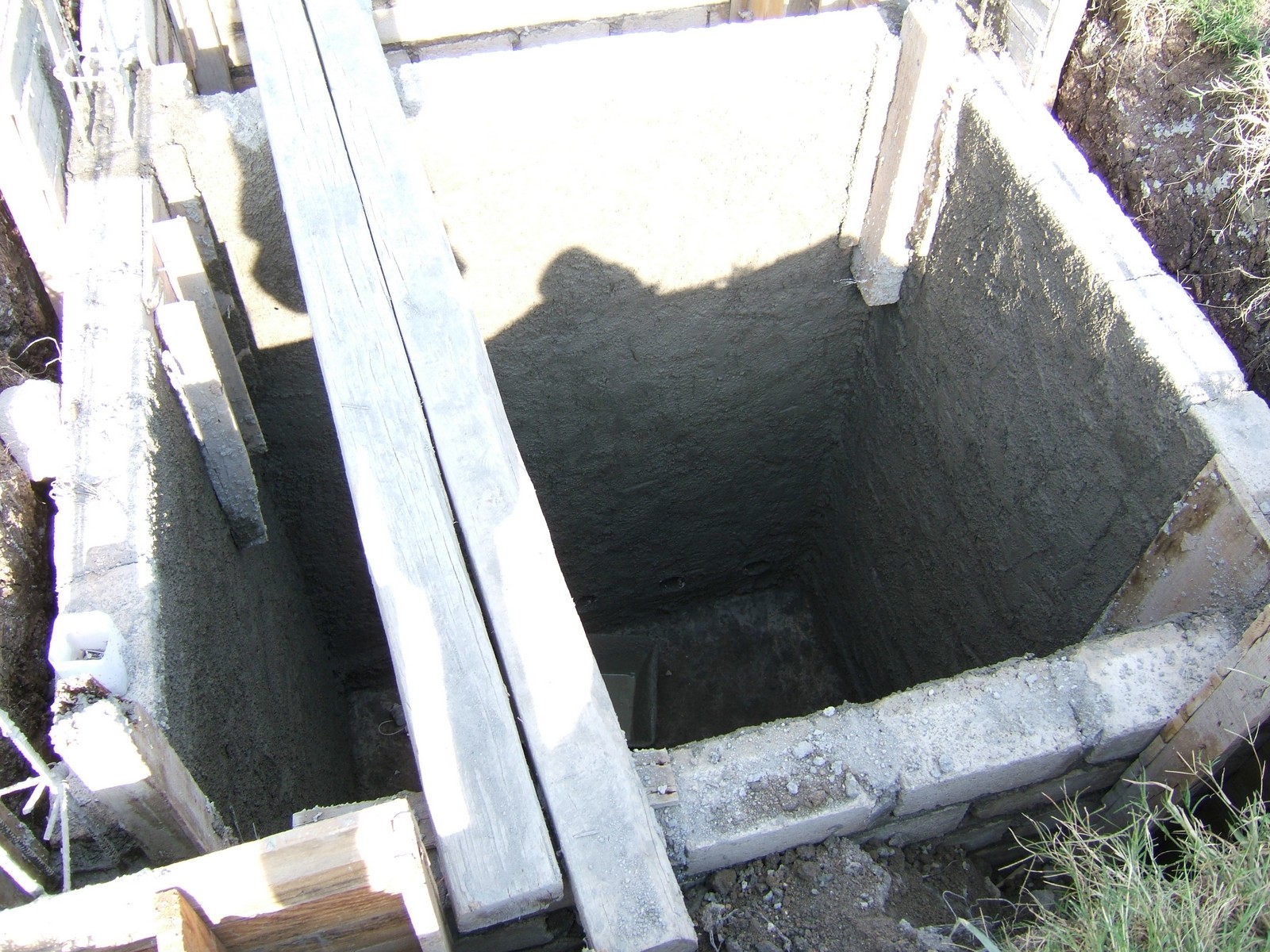 Una de las cuatro cámaras de la fosa séptica con cemento aplicado sobre las paredes. Cada cámara tiene profundidad de 2.2 metros y ancho de 1.7 metros. El largo de cada cámara es de 1 metro, menos la que está más cerca del canal que tiene largo de 1.5 metros. La capacidad es cerca de 17,000L y el vertido al canal debería ser agua muy limpia.