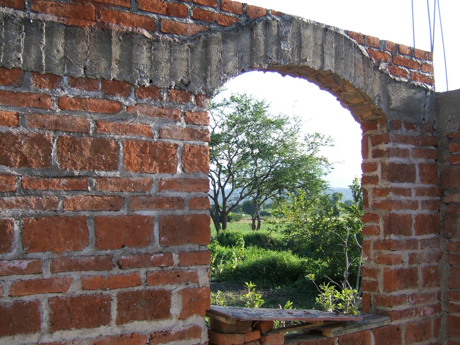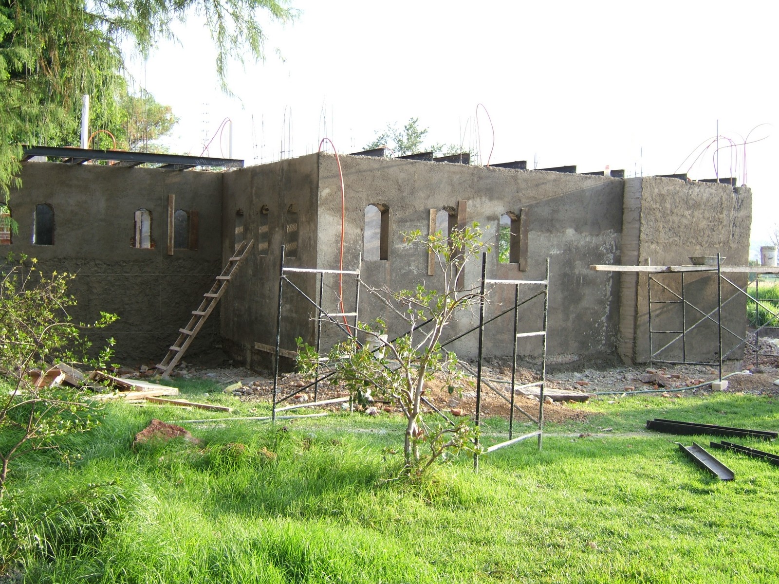 Una perspectiva general mostrando que se han construido más paredes de la casa. Después se cubrirán todas las paredes, dentro y afuera, con cerca de 2cm de enjarre.