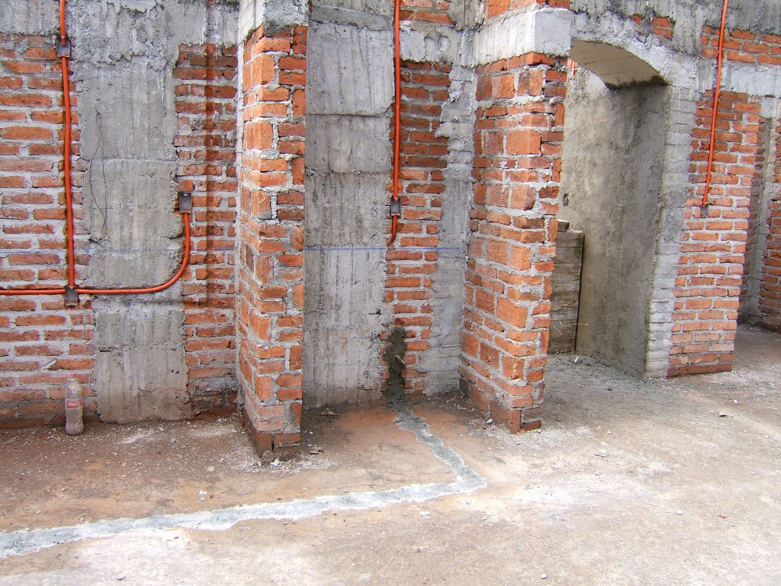 La sección alta de la estancia mostrando el comienzo de aplicación de enjarre a las paredes, y contactos para electricidad y comunicaciones.