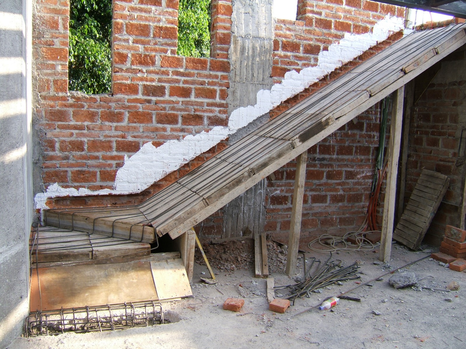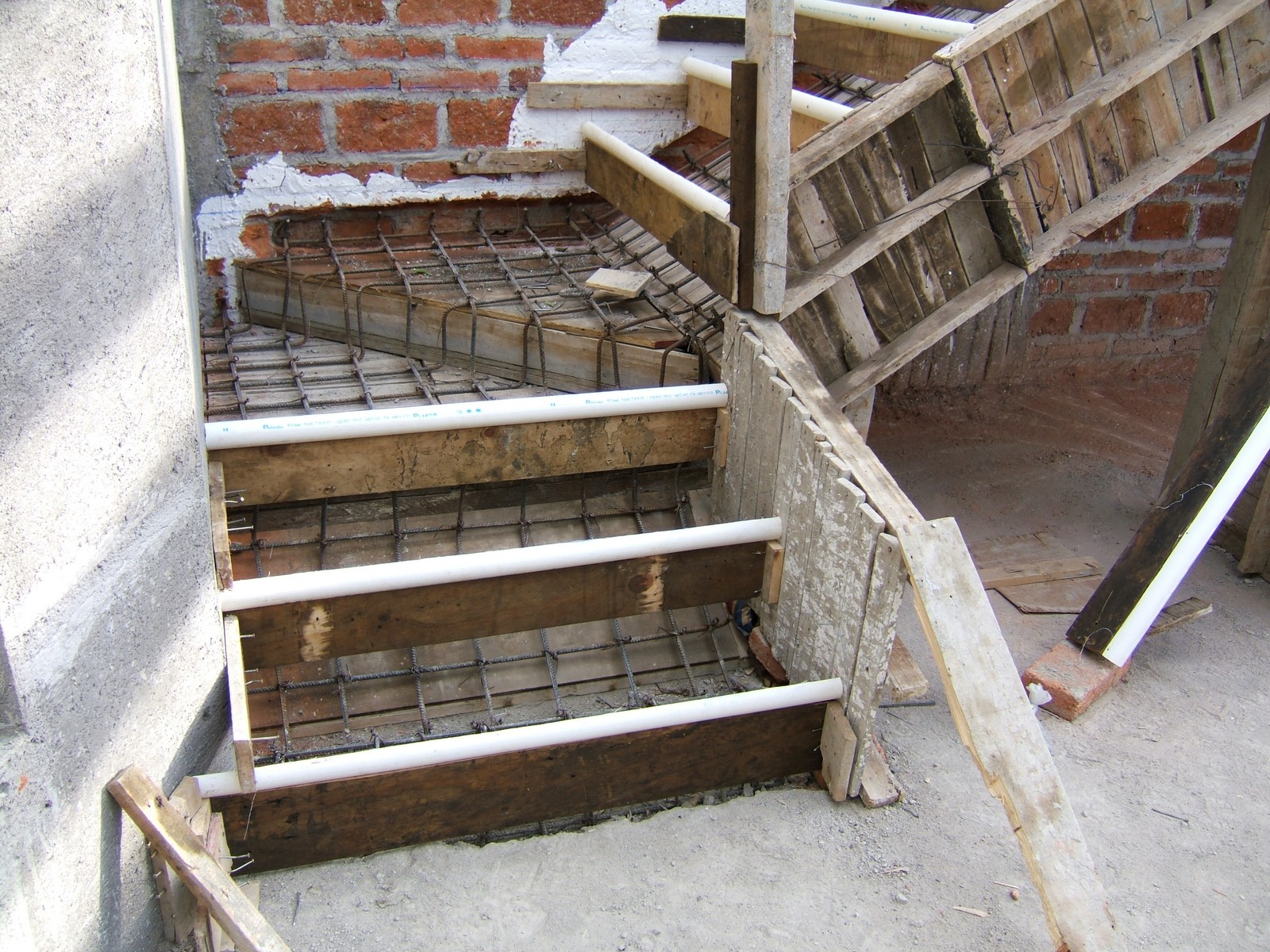 Las escaleras con refuerzos de acero y moldes en sus sitios, listas para vertir el concreto. Se usan tubos de PVC que se han cortado en dos para formar las orillas curvas de las escaleras.