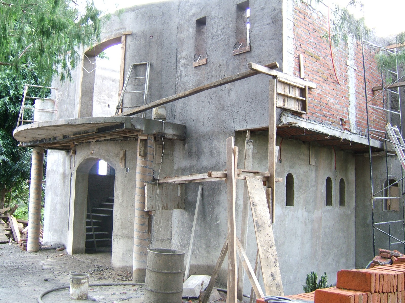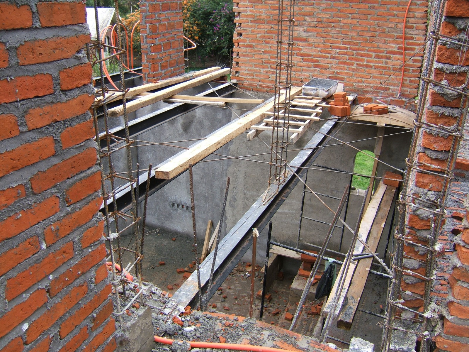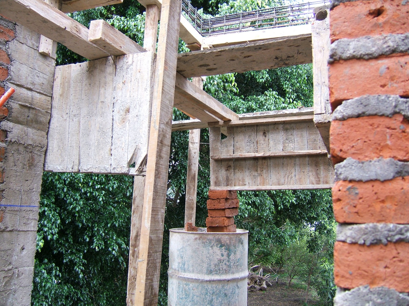 Están construyendo el balcón de concreto refuerzo de la recámara principal. Este es el único piso de losa; la madera soporta el concreto mientras fragua.
