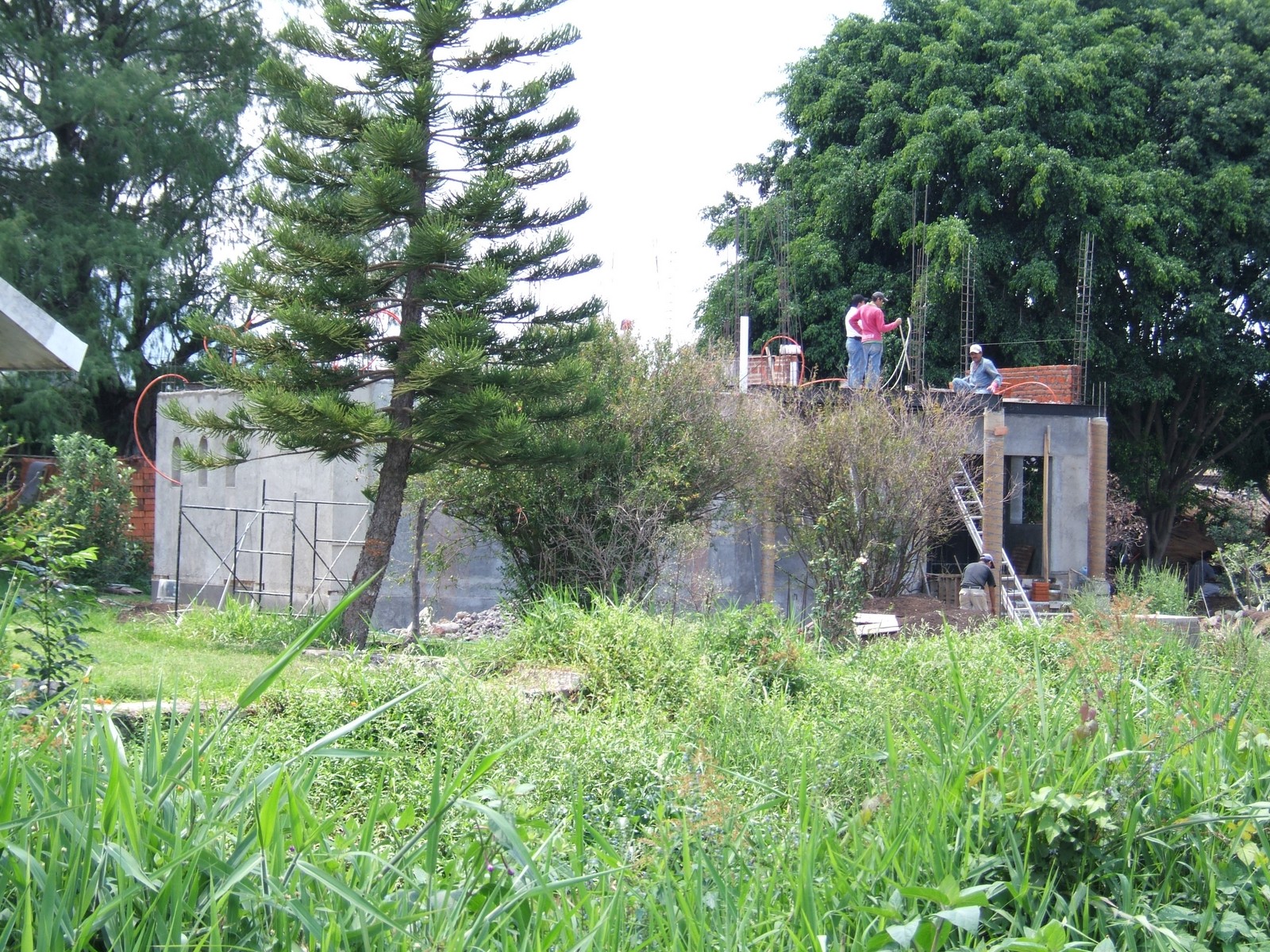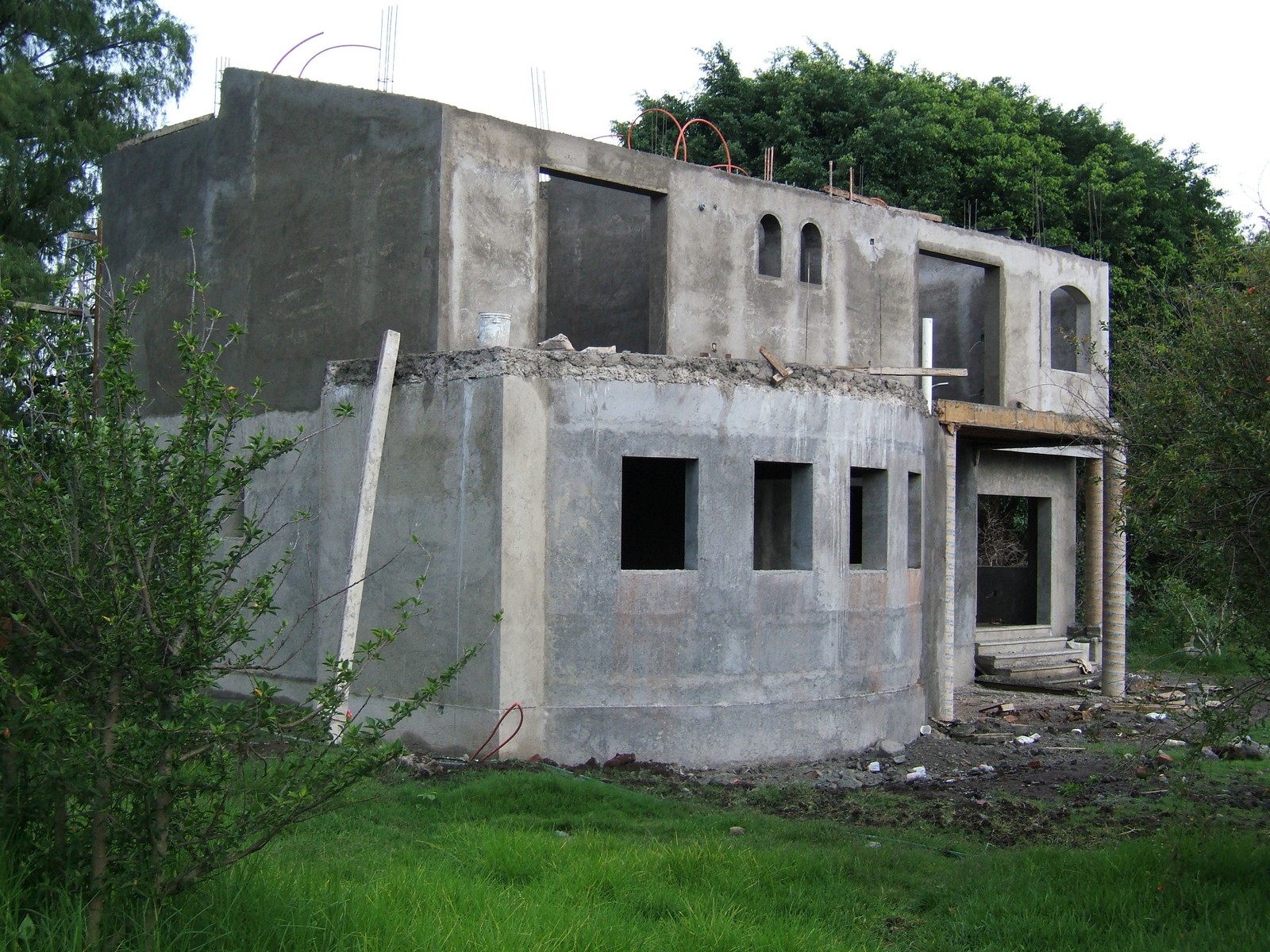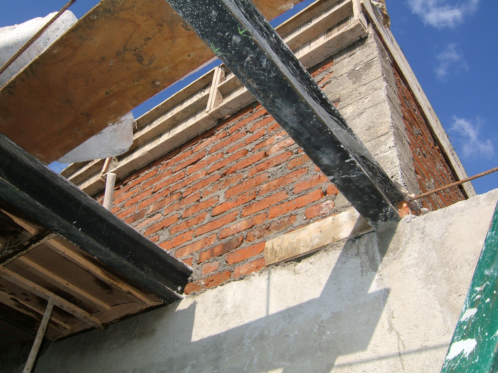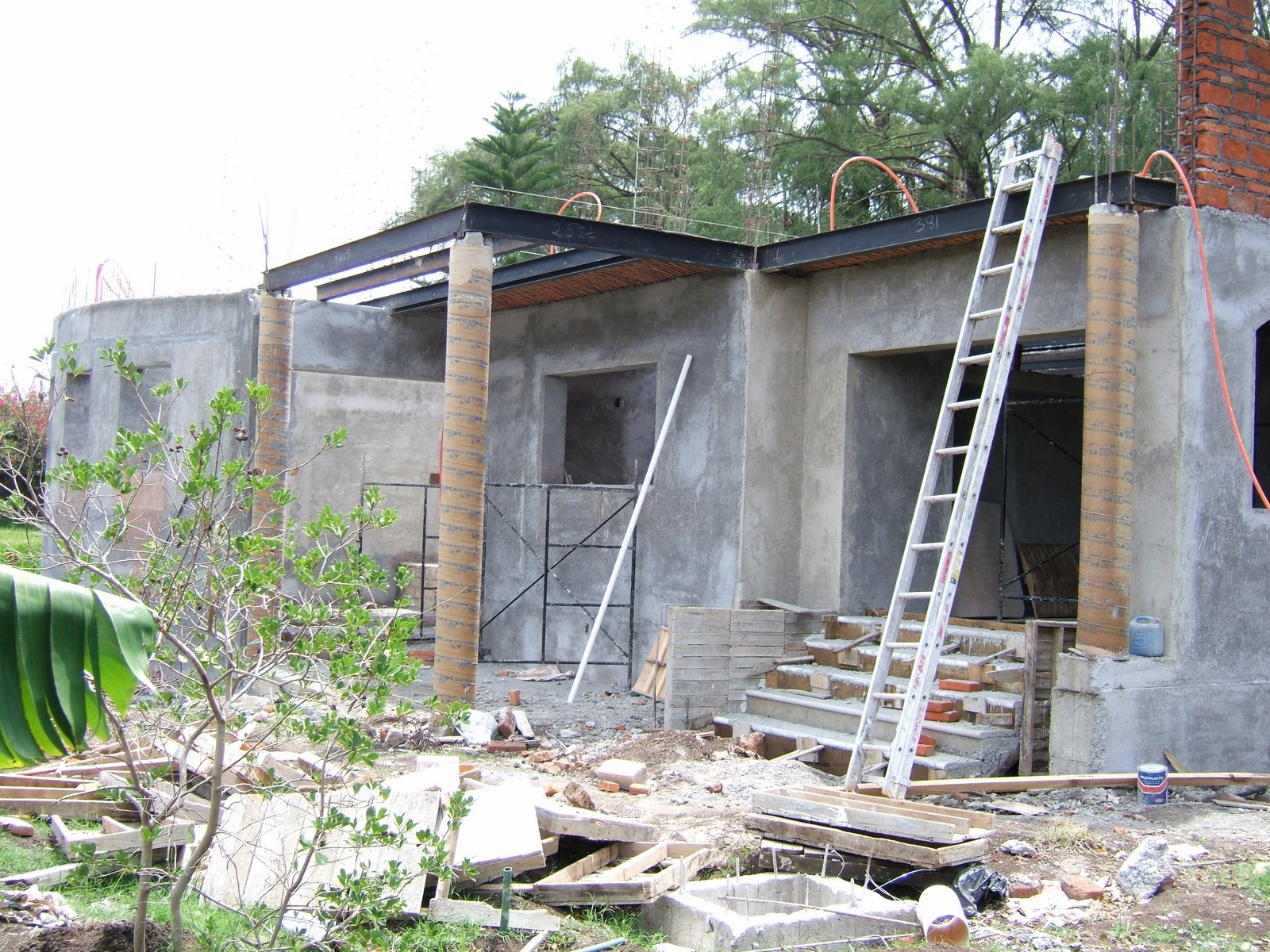 Están construyendo el balcón de concreto refuerzo de la recámara principal. Este es el único piso de losa; la madera soporta el concreto mientras fragua.