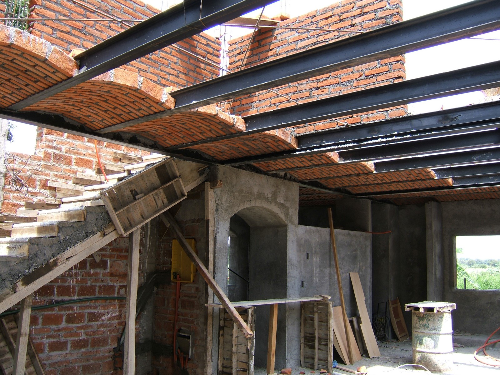 Los escalones de la sala familiar que se están construyendo, y la obra de bóveda exterior. Soportan la abertura grande para la puerta dos dalas sustanciales en la pared atravesada, y también la vigueta de 8x5¼ encima de la columna.
