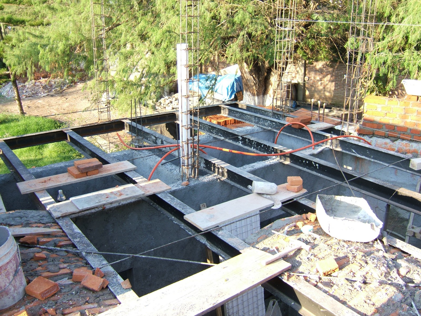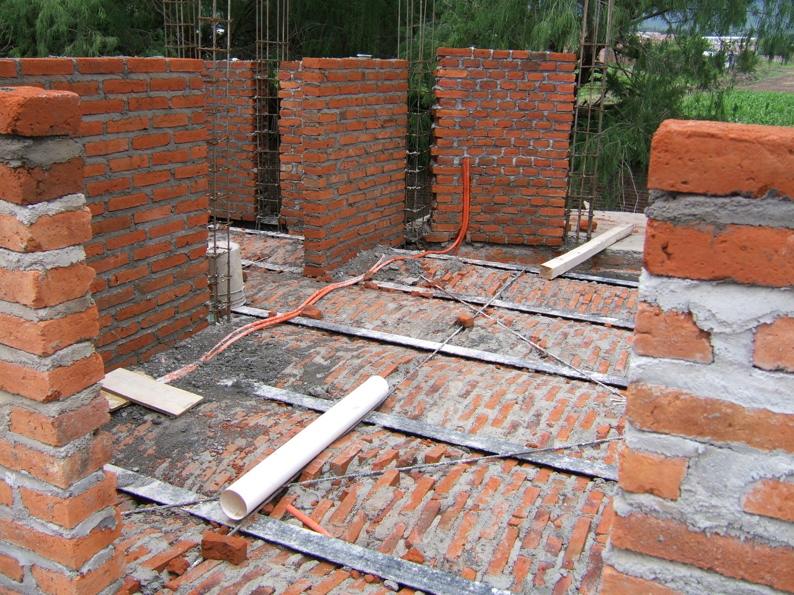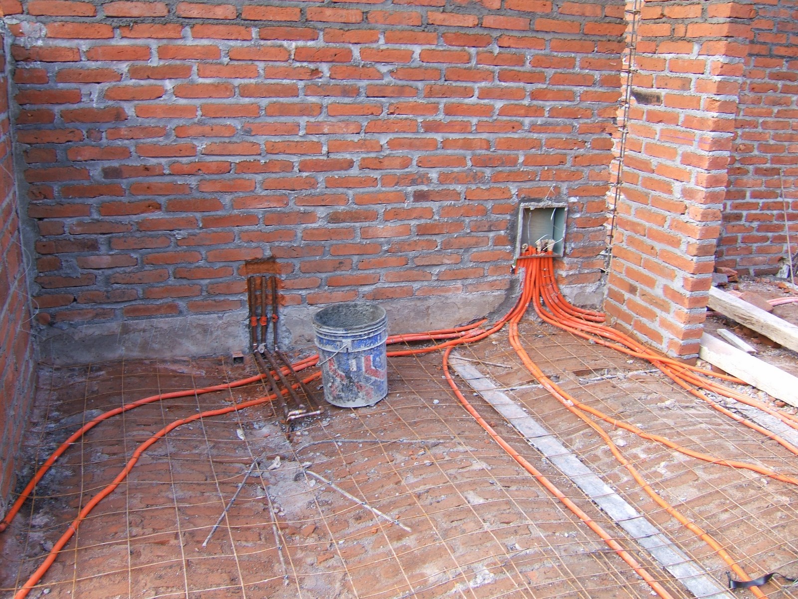 El comienzo de la obra sobre el piso de recámara 3, mostrando la malla de acero que se usa para refuerzo del concreto. Ahora la mayoría de la instalación eléctrica está terminada.