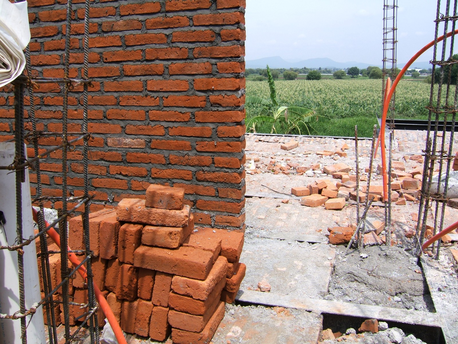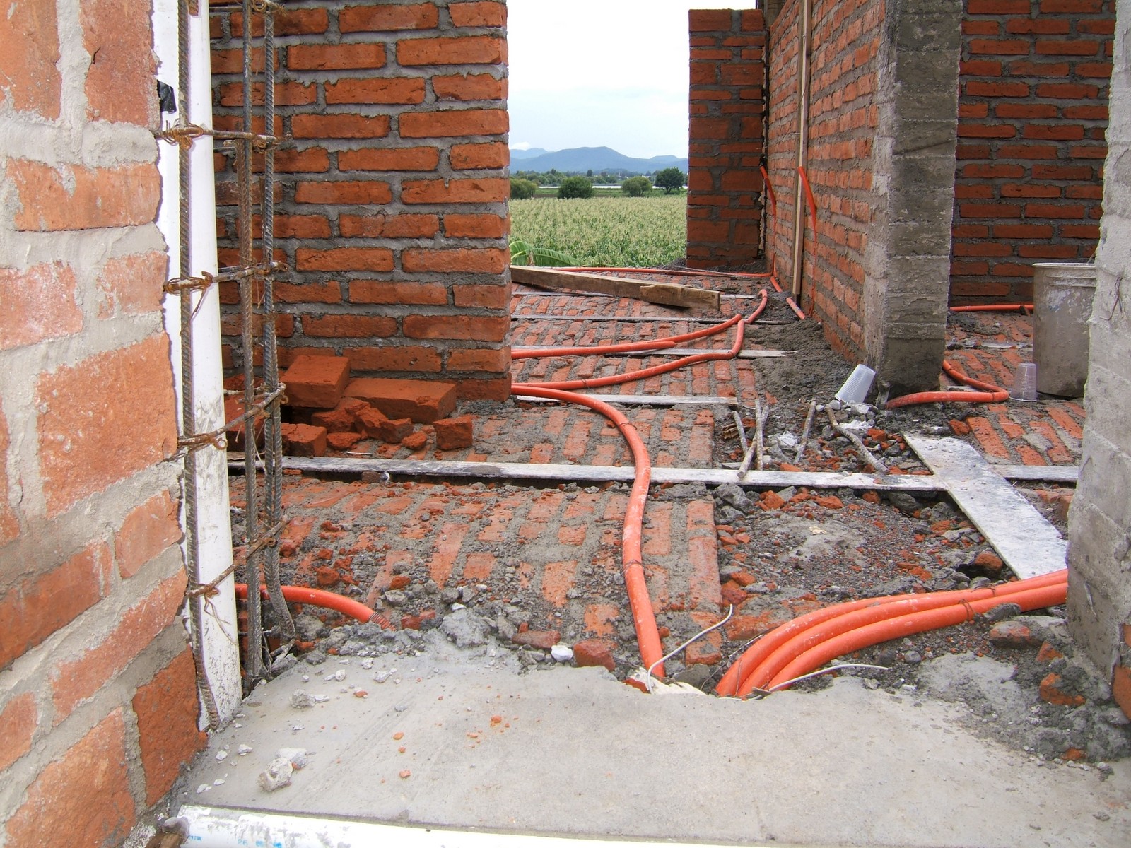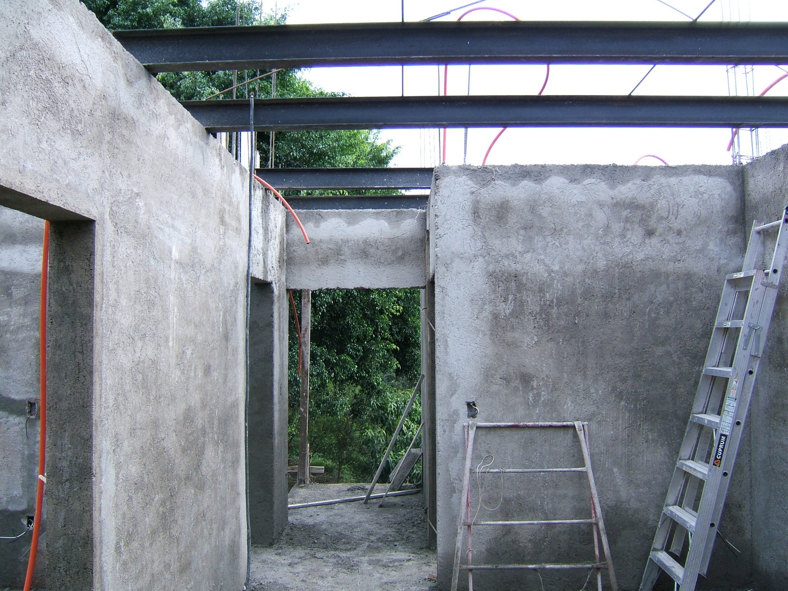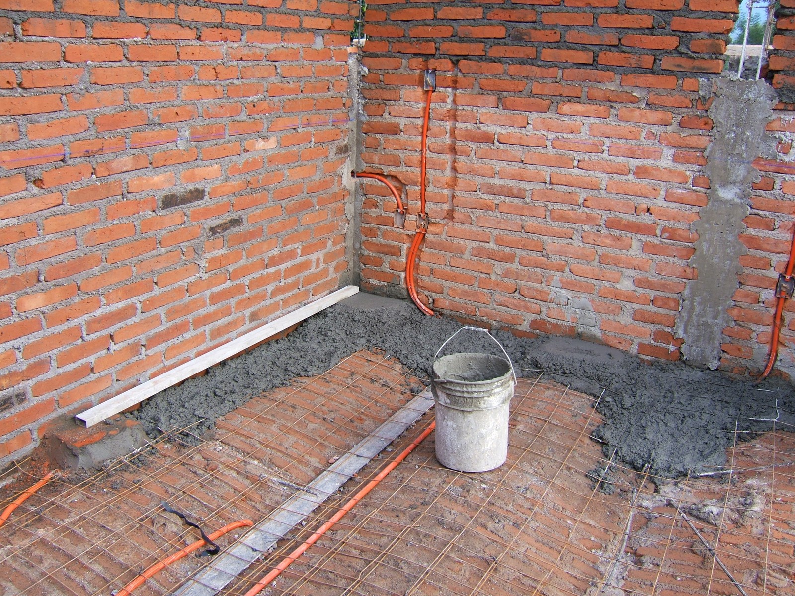 El comienzo de la obra sobre el piso de recámara 3, mostrando la malla de acero que se usa para refuerzo del concreto. Ahora la mayoría de la instalación eléctrica está terminada.
