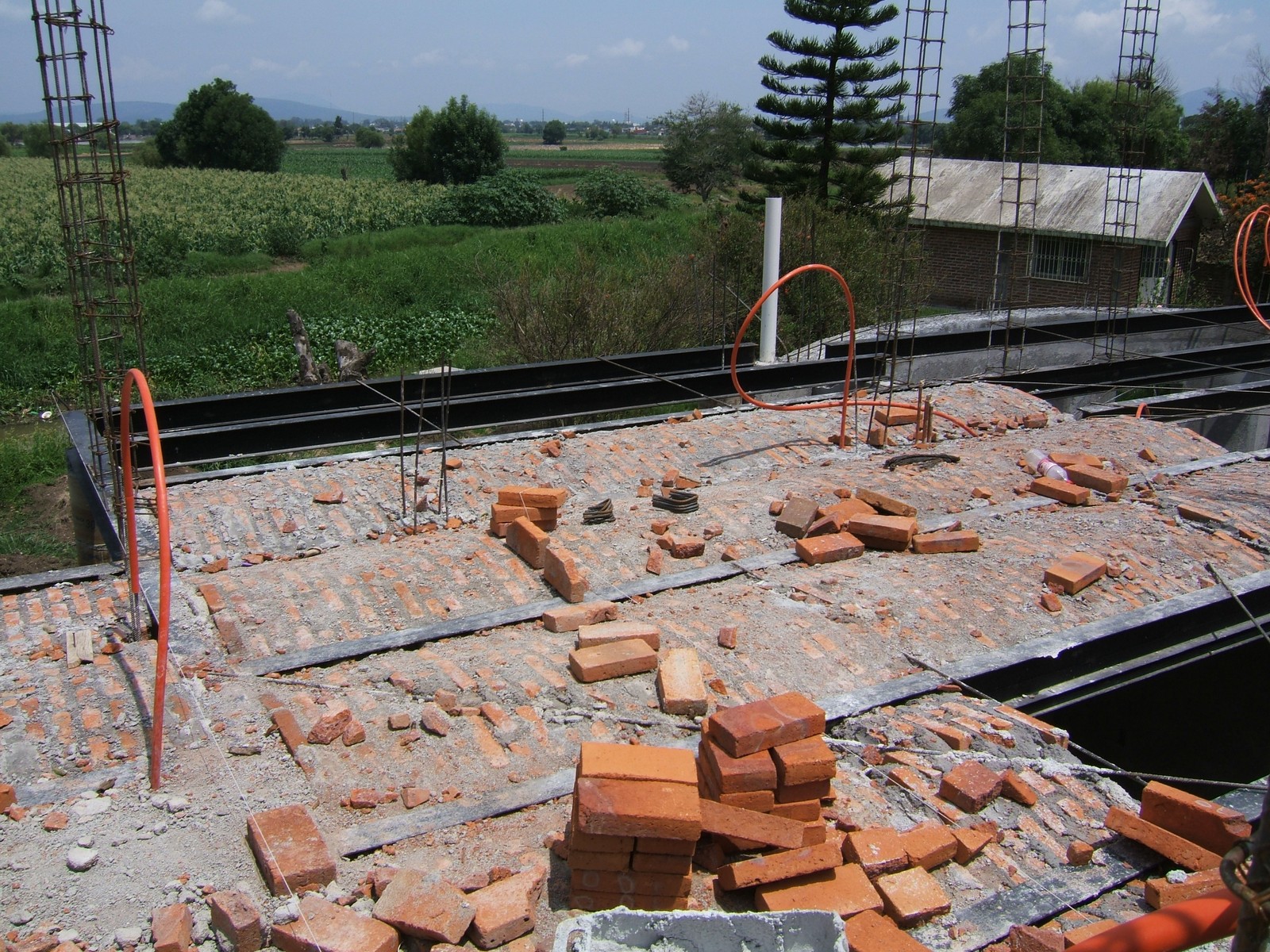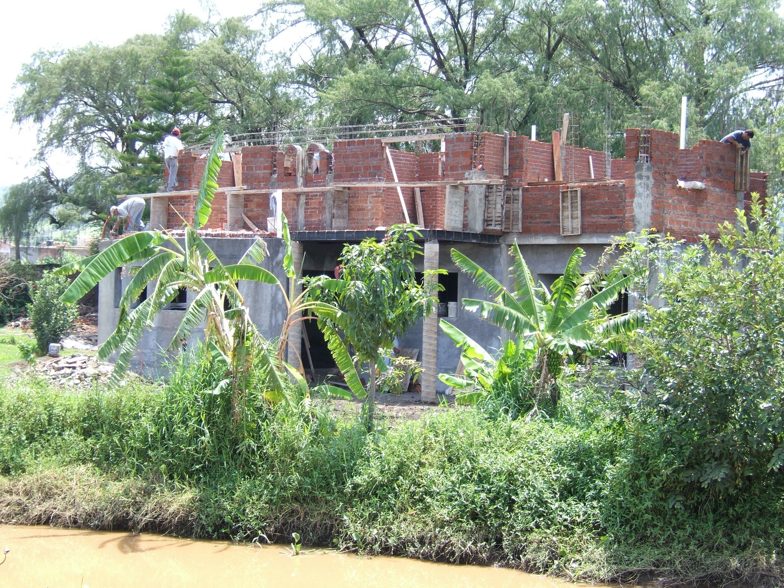 Una vista del otro lado del canal mostrando que se han comenzado obras sobre las paredes de la planta alta. Aún hay sólo un poquito del techo en su sitio, pero eso no les detiene - maromean encima de las viguetas.