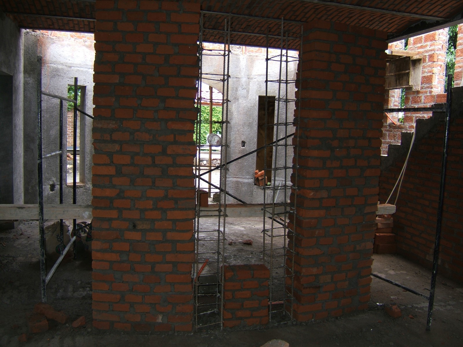 La construcción de la mámpara que separa el recibidor del área de la cocina y el comedor. Muestra también la obra de bóveda casi terminada en esta área, y las escaleras que tienen un cuarto abajo.