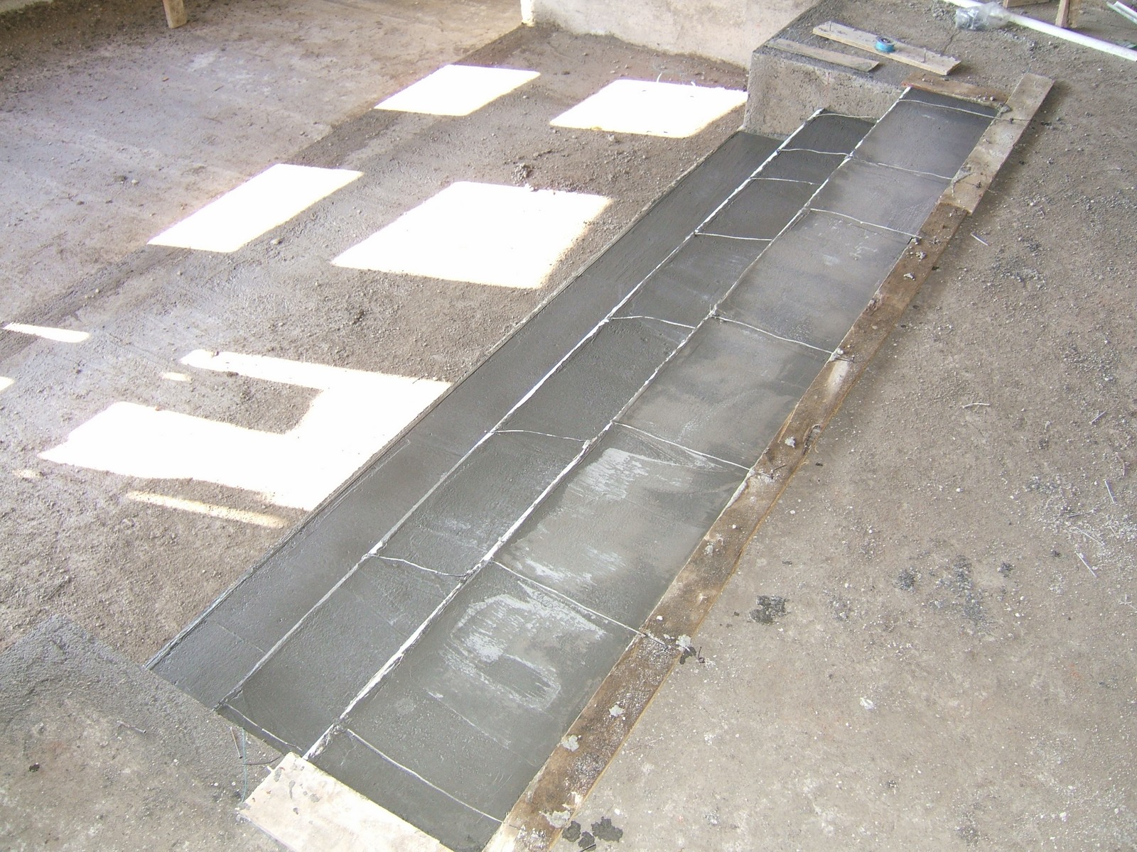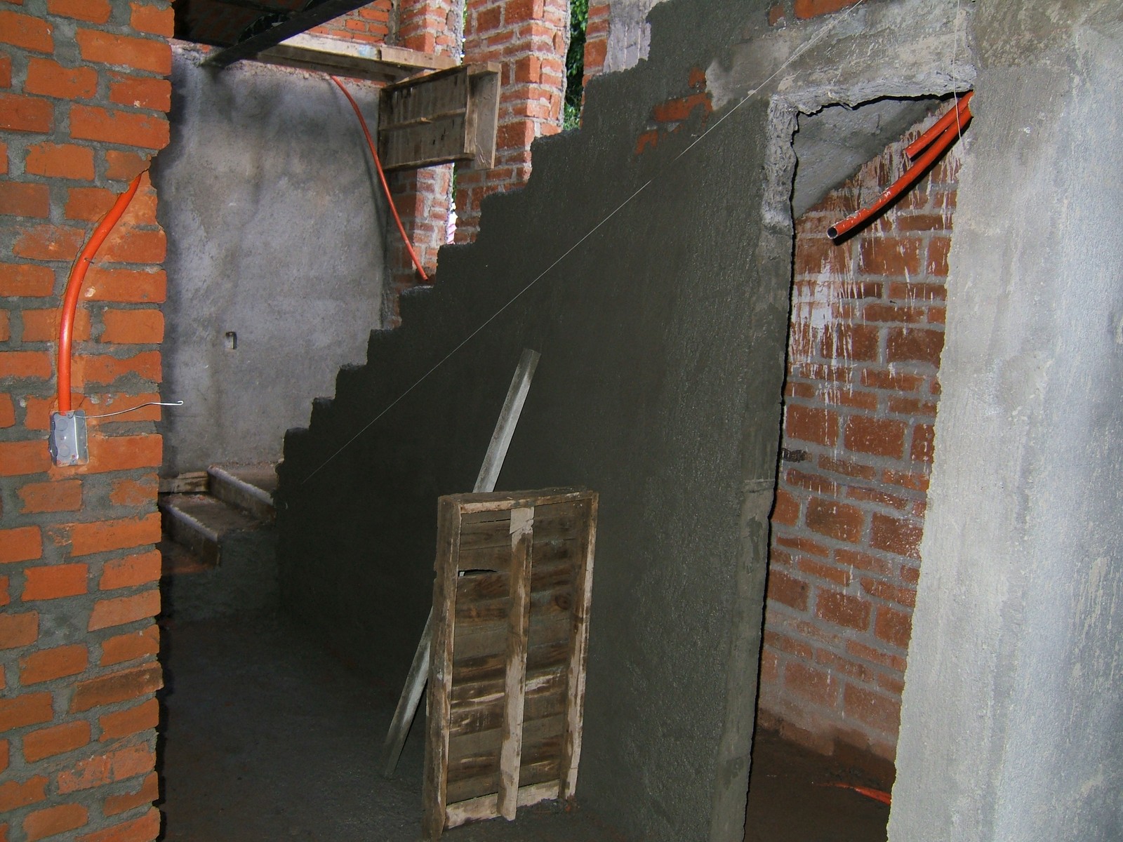 Las escaleras, la mayoría ahora están cubiertas con enjarre, mostrando también el cuarto abajo de las escaleras a la derecha y la mámpara a la izquierda.
