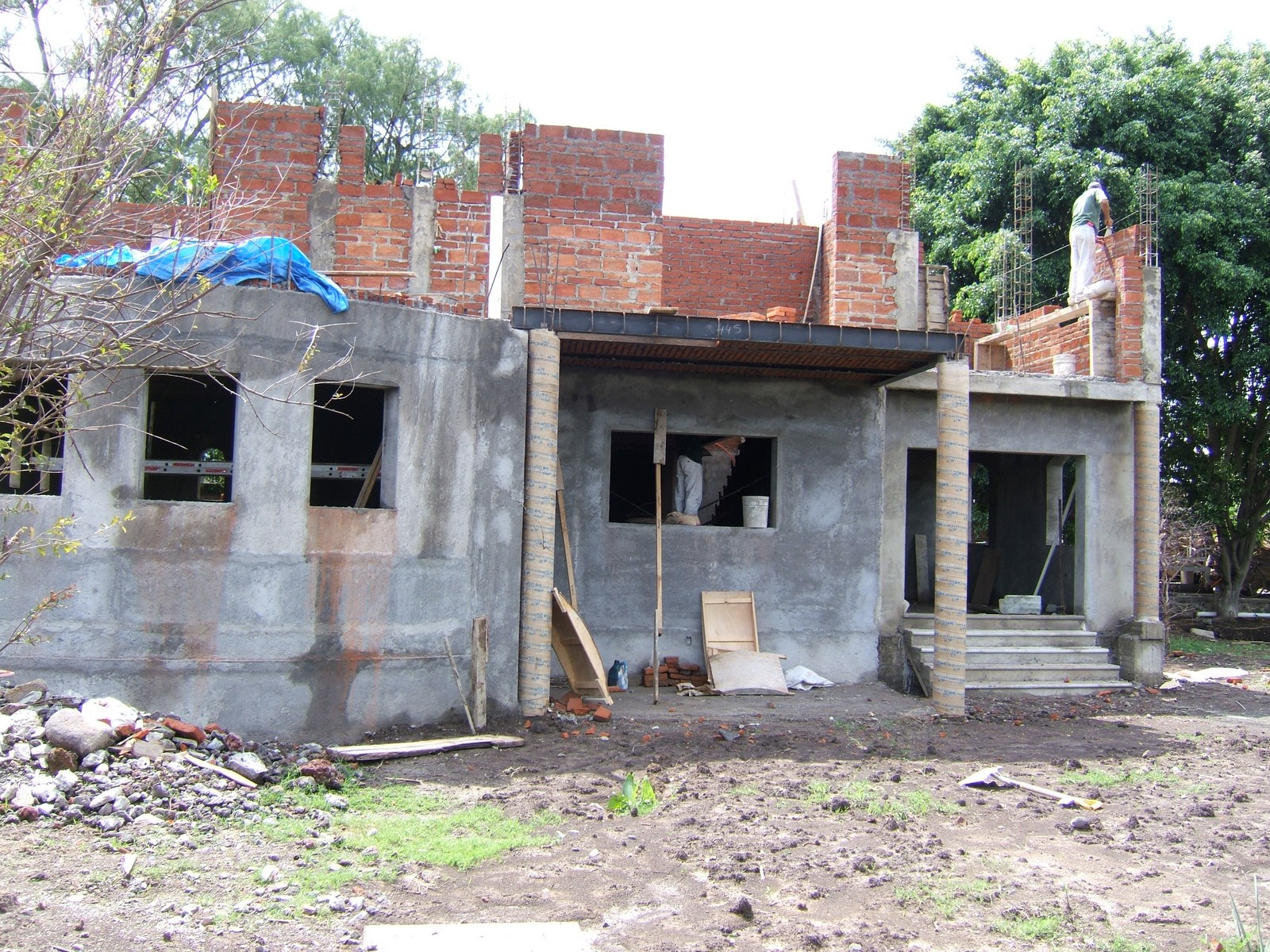 Una perspectiva general mostrando la casa con enjarre que ya se ha aplicado a la mayoría de las paredes interiores y exteriores.
