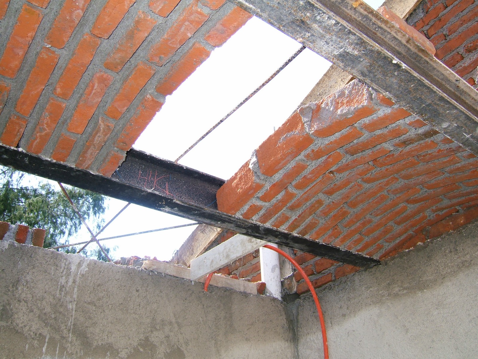 El techo de bóveda en recámara dos está casi terminado. Pero toda la bóveda necesitará mucho más trabajo, incluyendo rellenar con mortero y limpiar con acido muriático. Sobre las viguetas, se deben lijar, sellar con silicón, entonces repintar con esmalte.