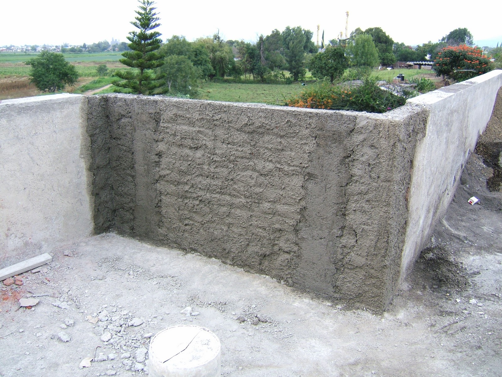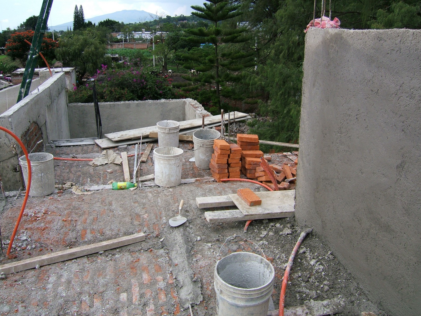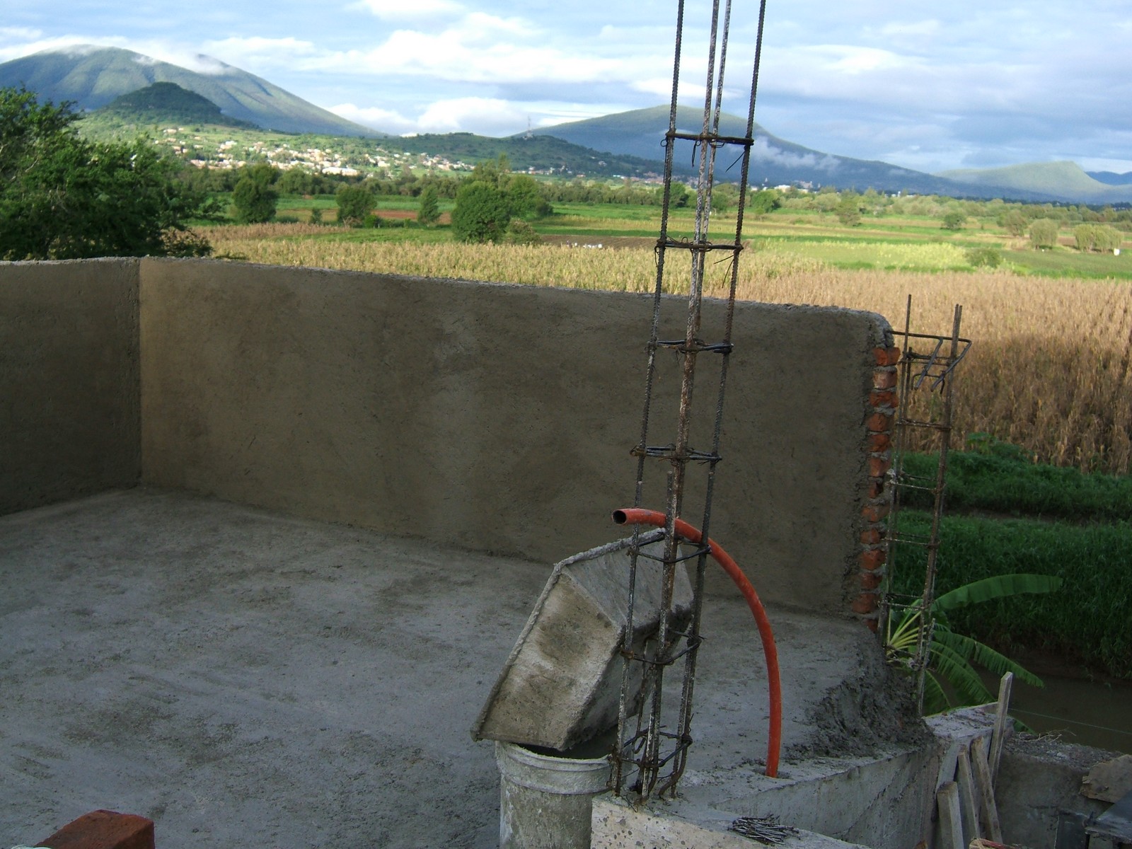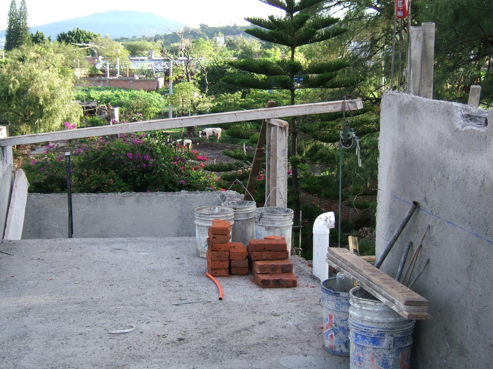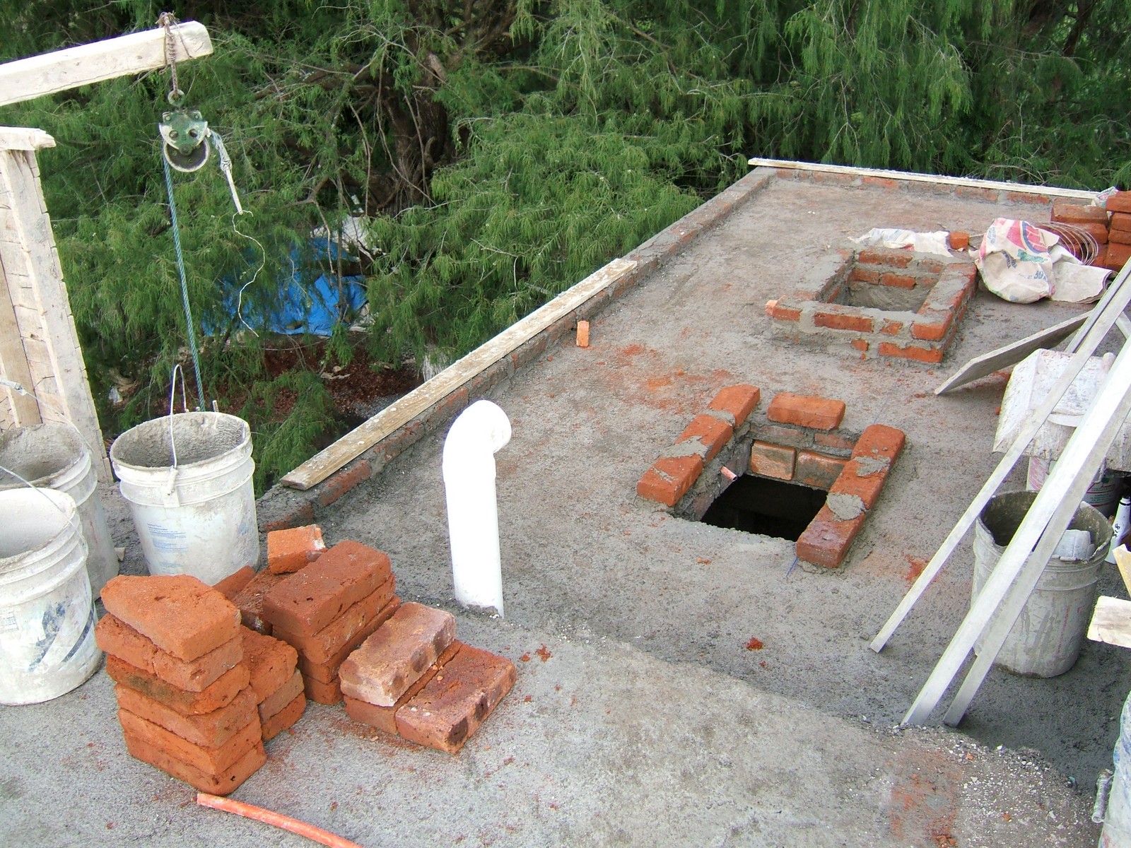 Otra vista, ahora la azotea está cubierta con cemento, y mostrando equipo sofisticado que se usa para recoger cubetas de cemento. También mostrando uno de tres tubos para ventilar gases de agua negra; se empotrarán en la pared todos y parecerán solo como una apertura.