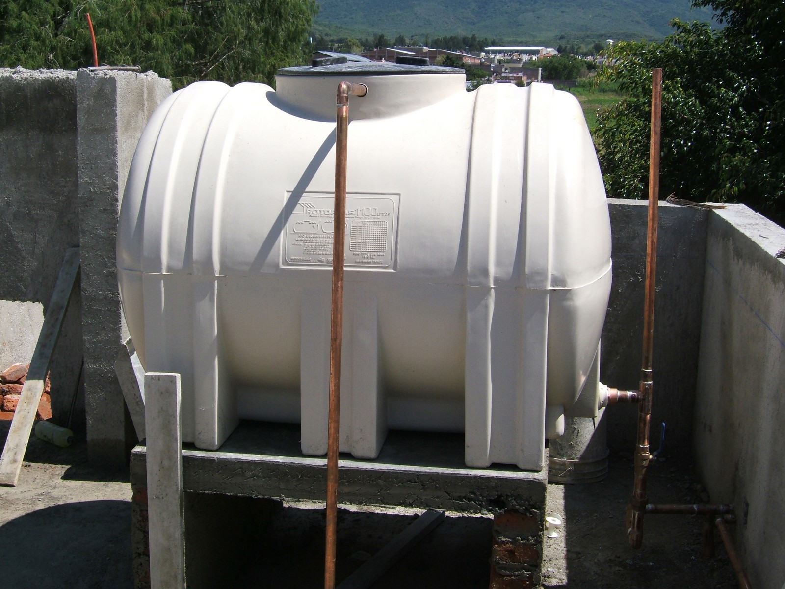 El tinaco de 1100 litros está instalado encima de la azotea; este pesará más que 1.15 toneladas cuando esté lleno.