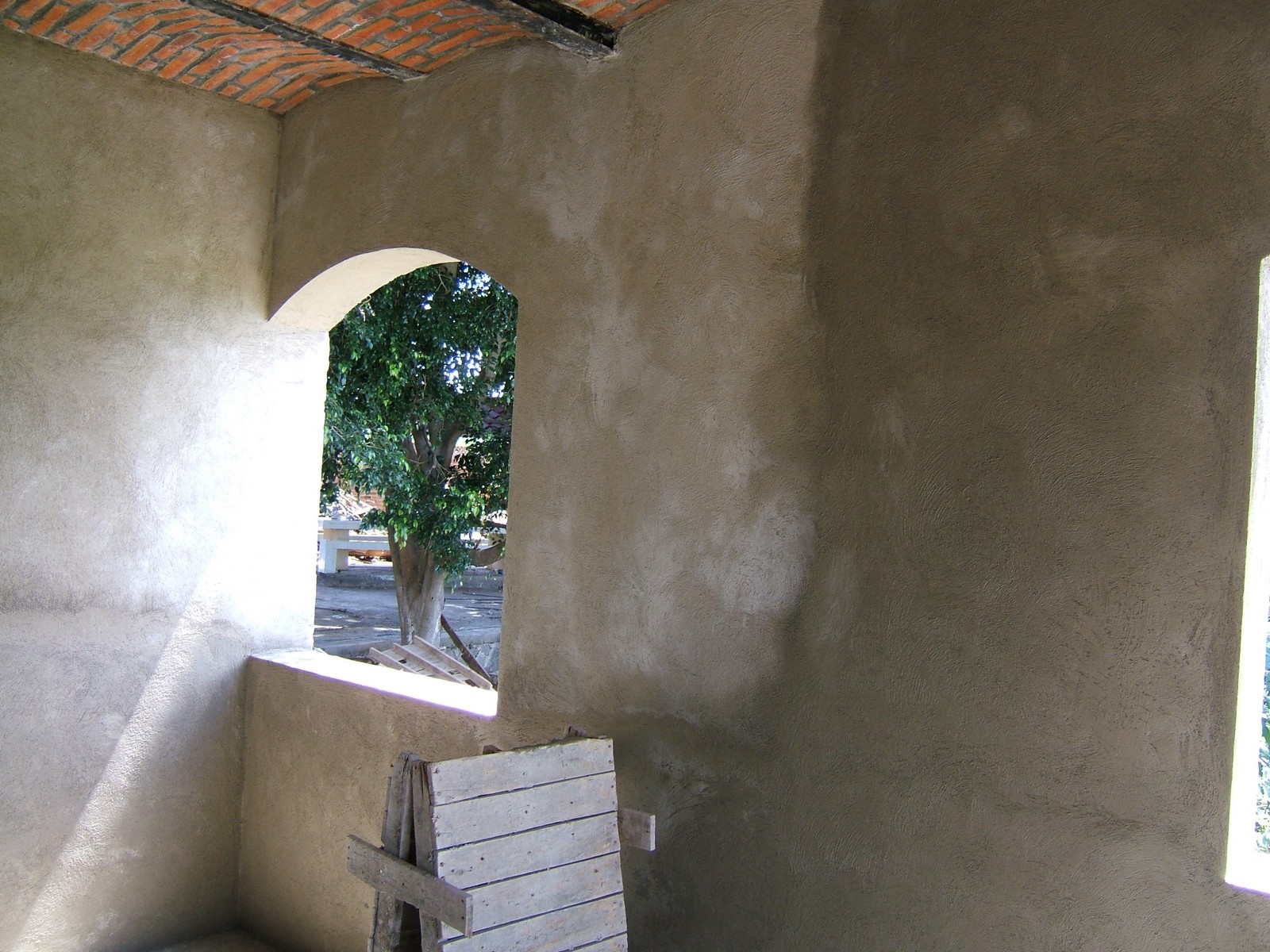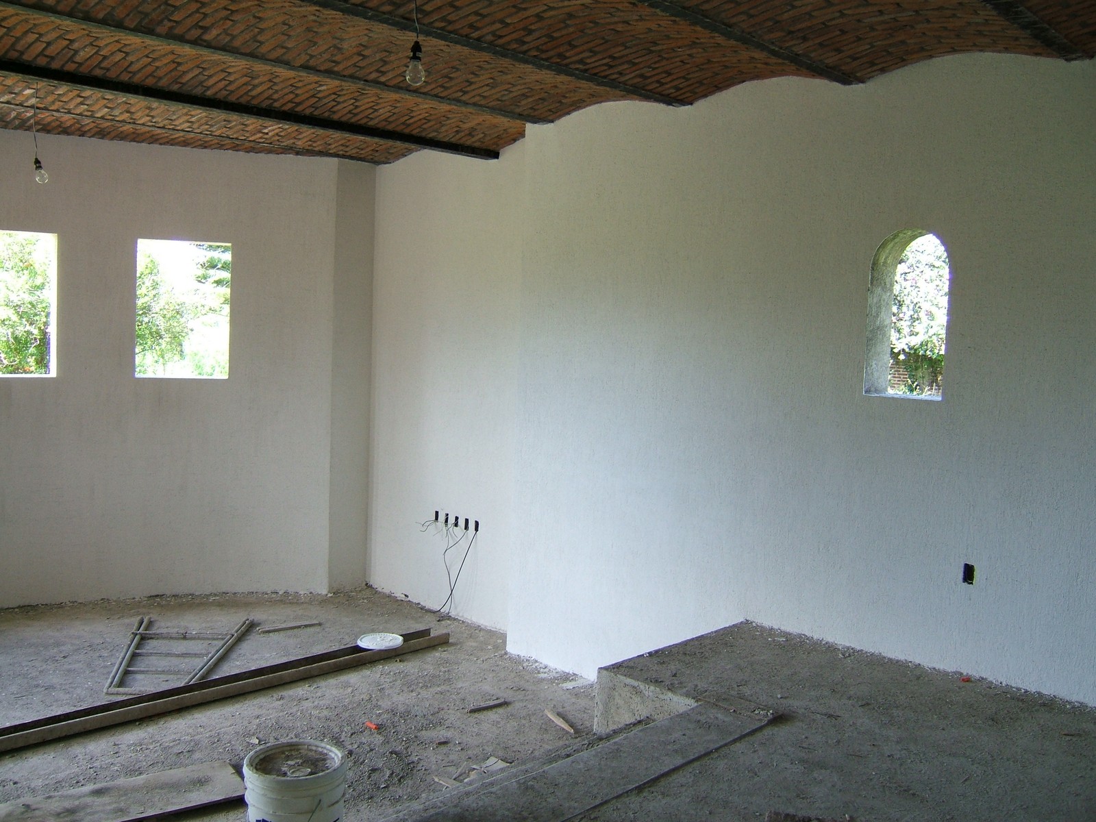 Viendo hacia el patio tendido, mostrando el techo de bóveda plano casi terminado, y enjarre sobre la pared por encima de la recámara principal.