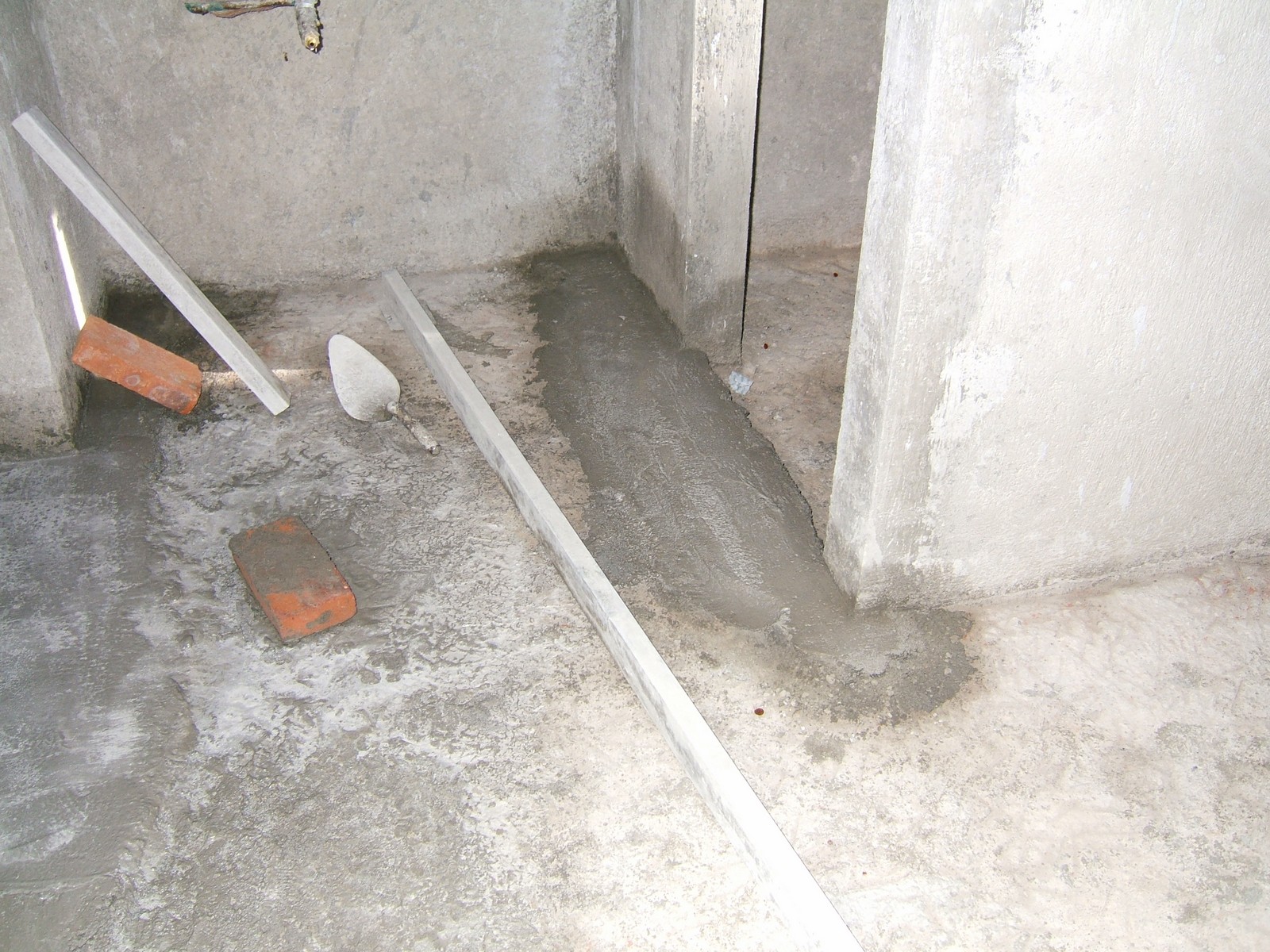 Han aplicado el firme (la última capa de cemento sobre el piso) en recámaras 2 y 3 y el vestidor, y aquí se aplica en el baño principal.