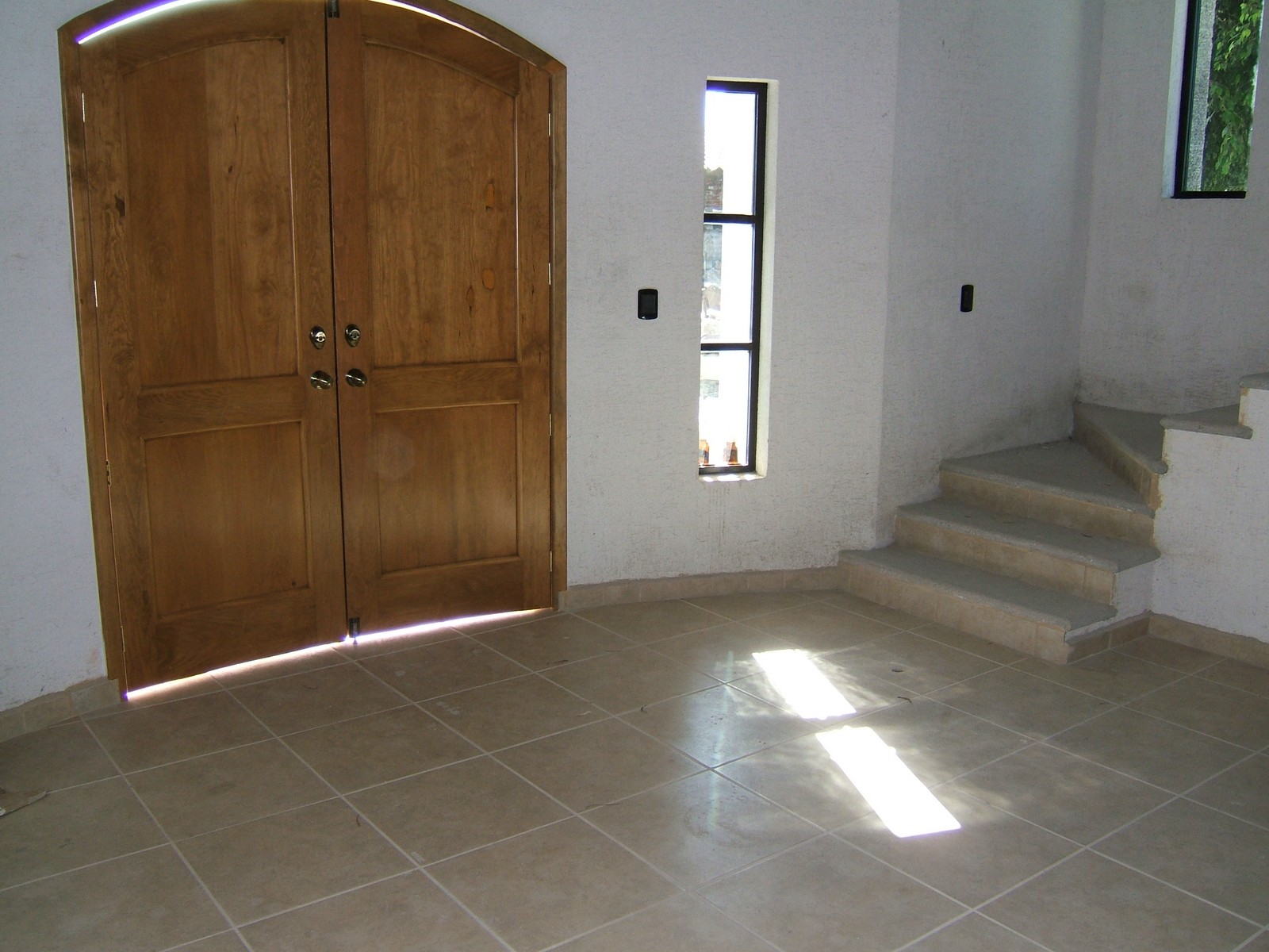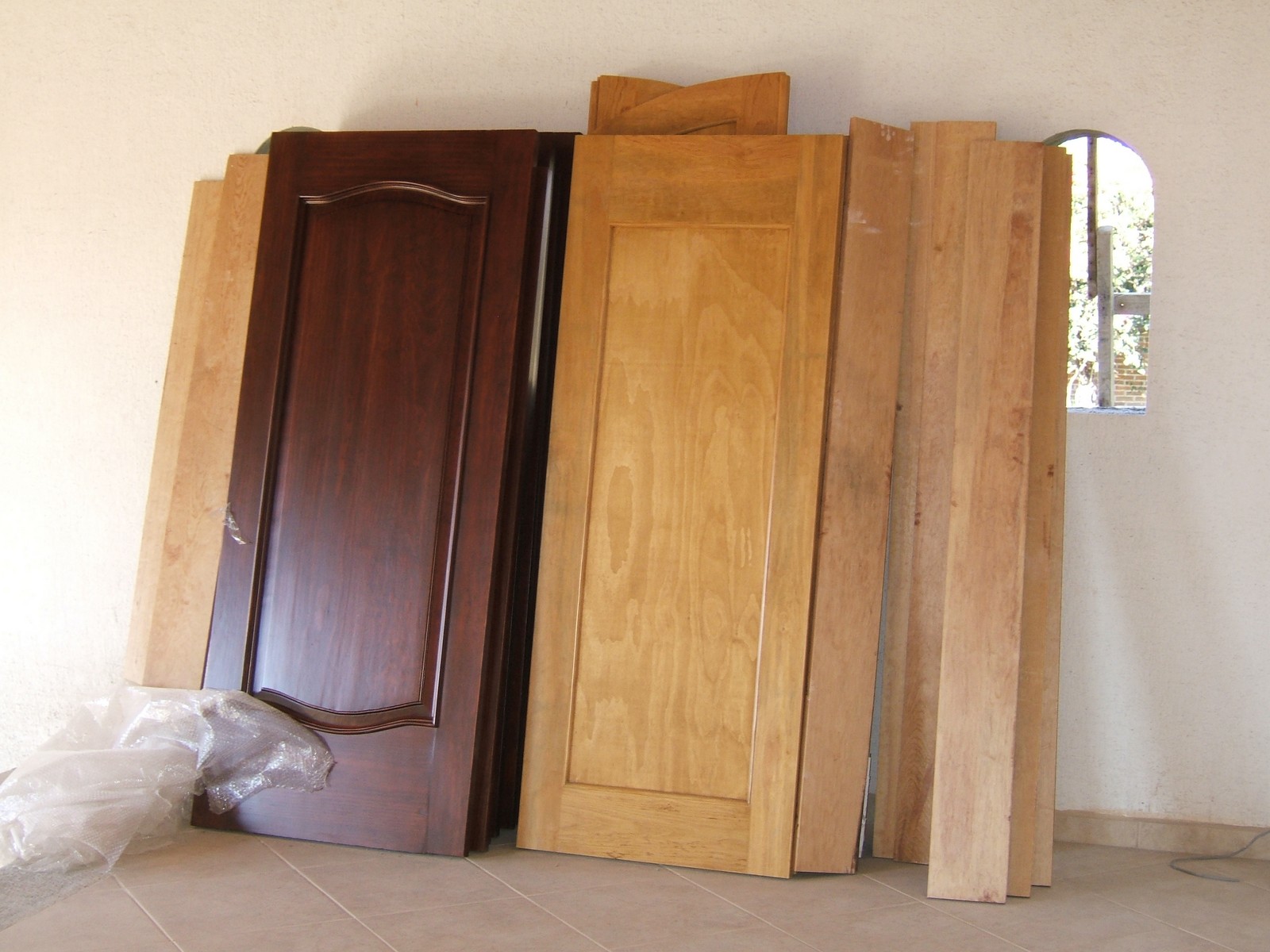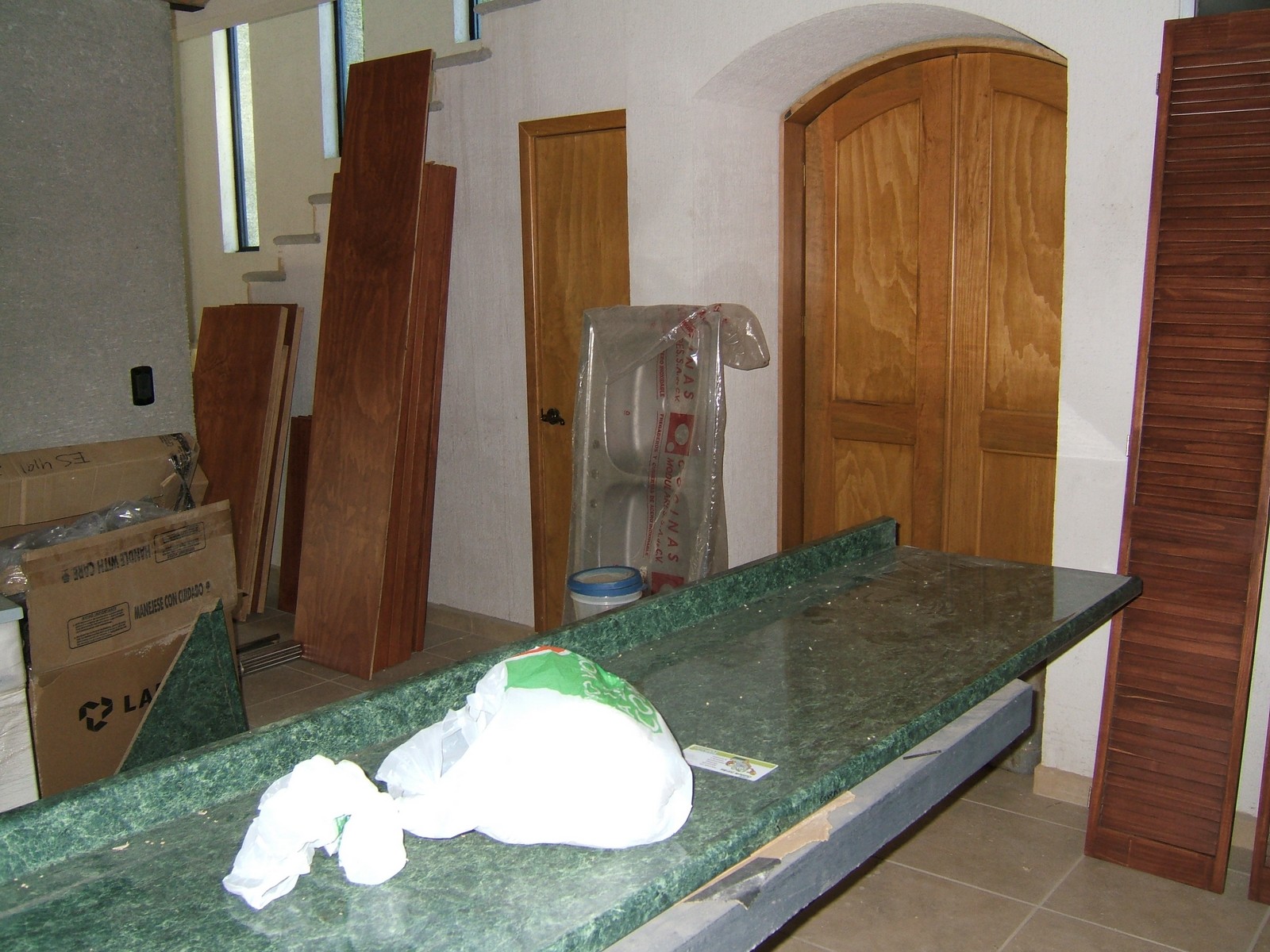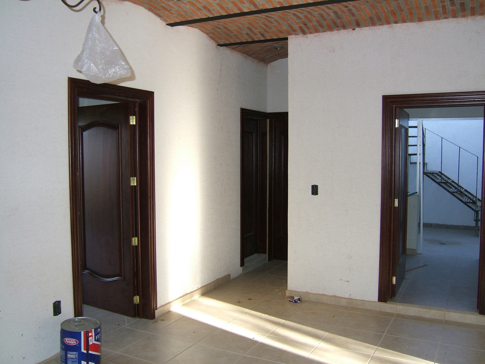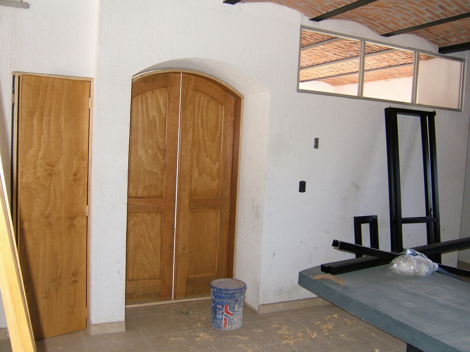La mayoría de las puertas del interior están aquí; aún están haciendo las puertas de la entrada que tendrán arcos y curvas. Todas las puertas son de madera sólida, excepto la puertita del cuarto abajo de las escaleras.