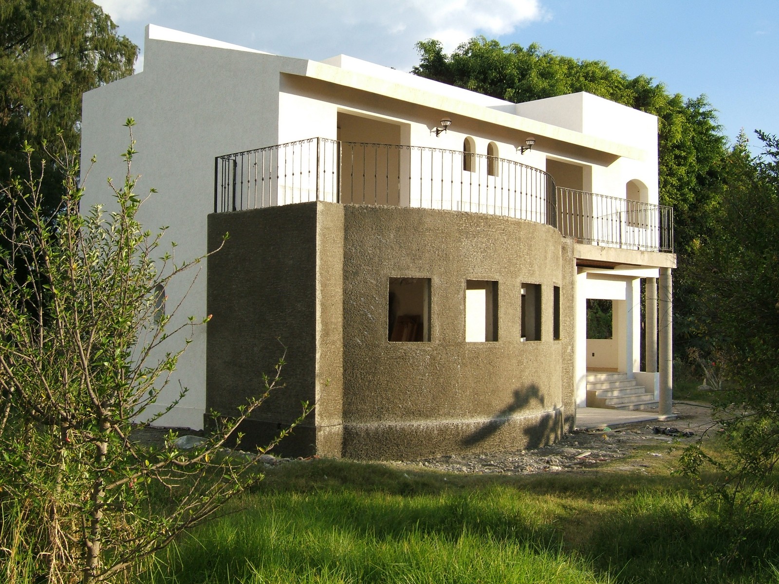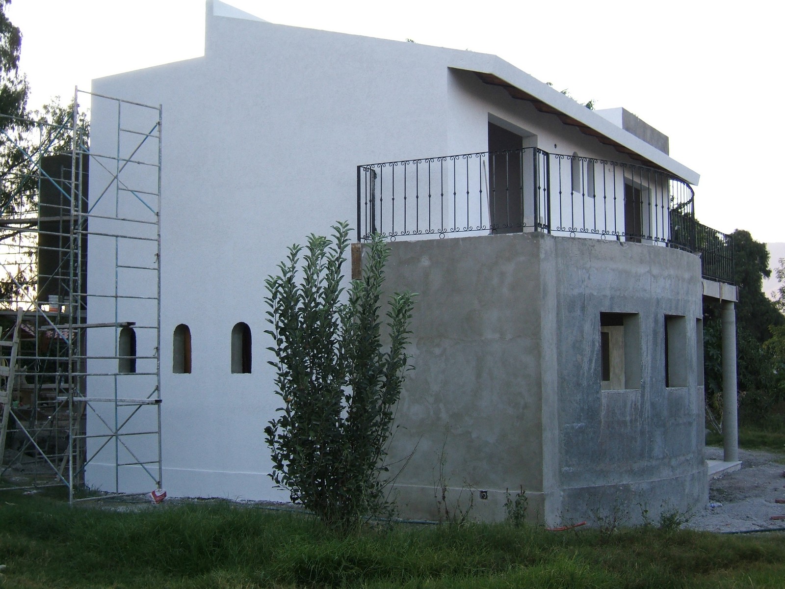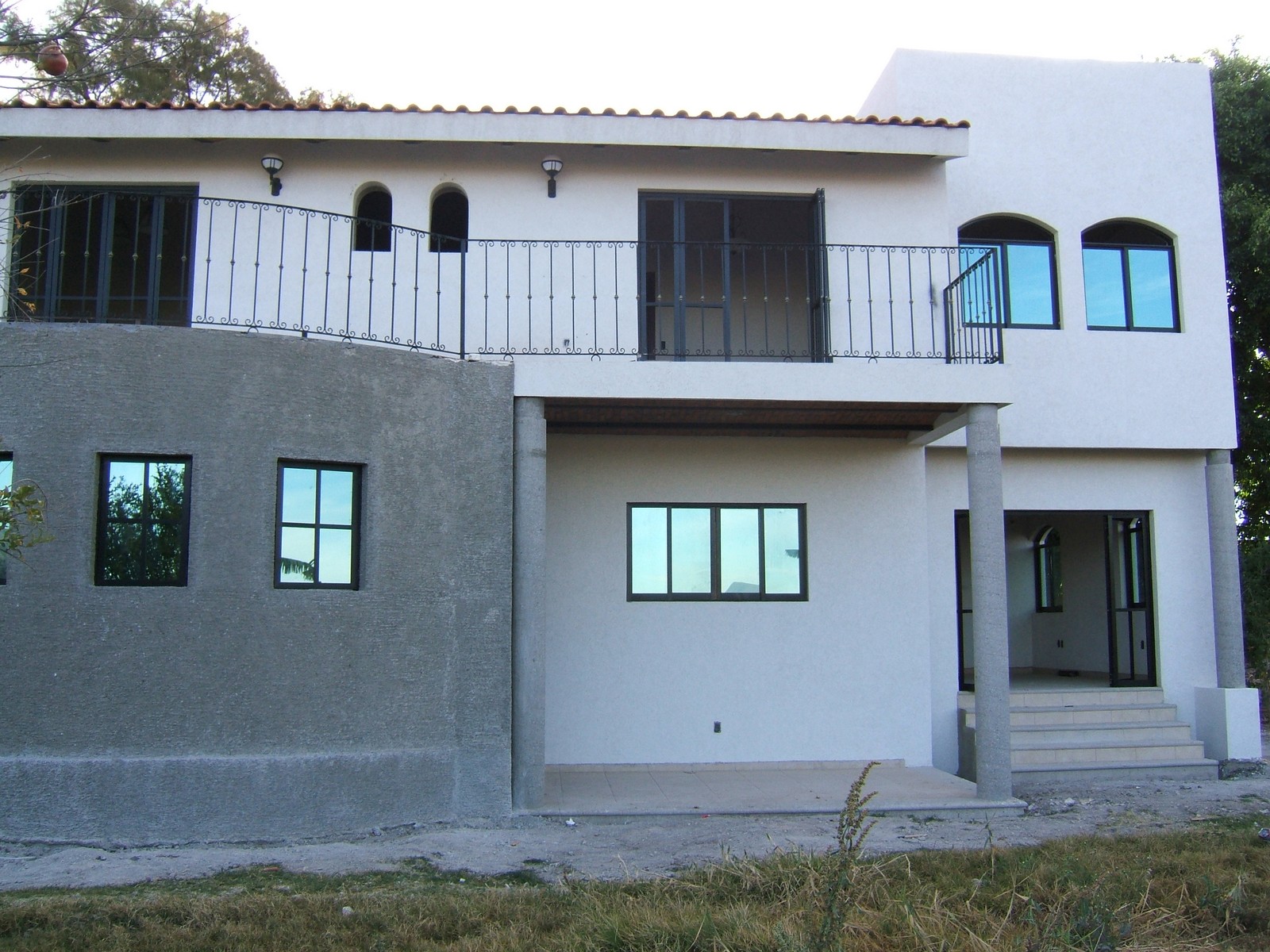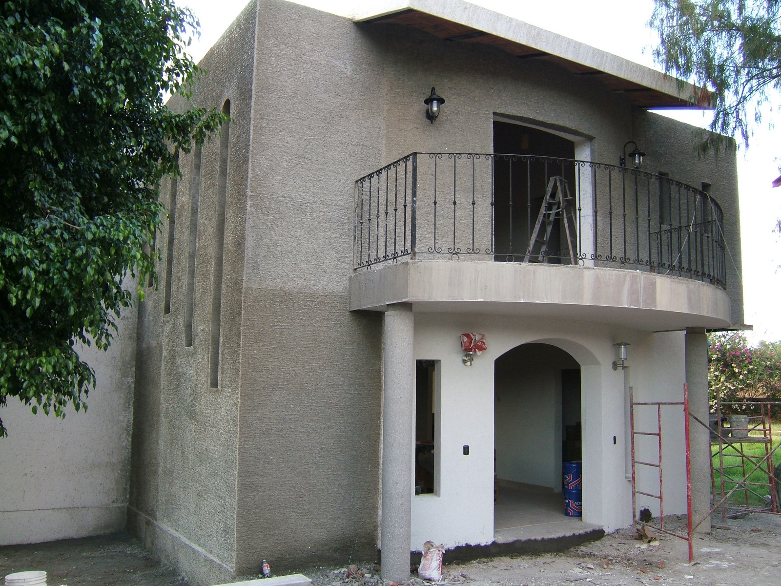 Ahora la mayoría del exterior del frente de la casa está terminada; concreto rústico para la planta alta y pintura texturizada para la planta baja. También se han colocado las rejas del balcón de la recámara principal.