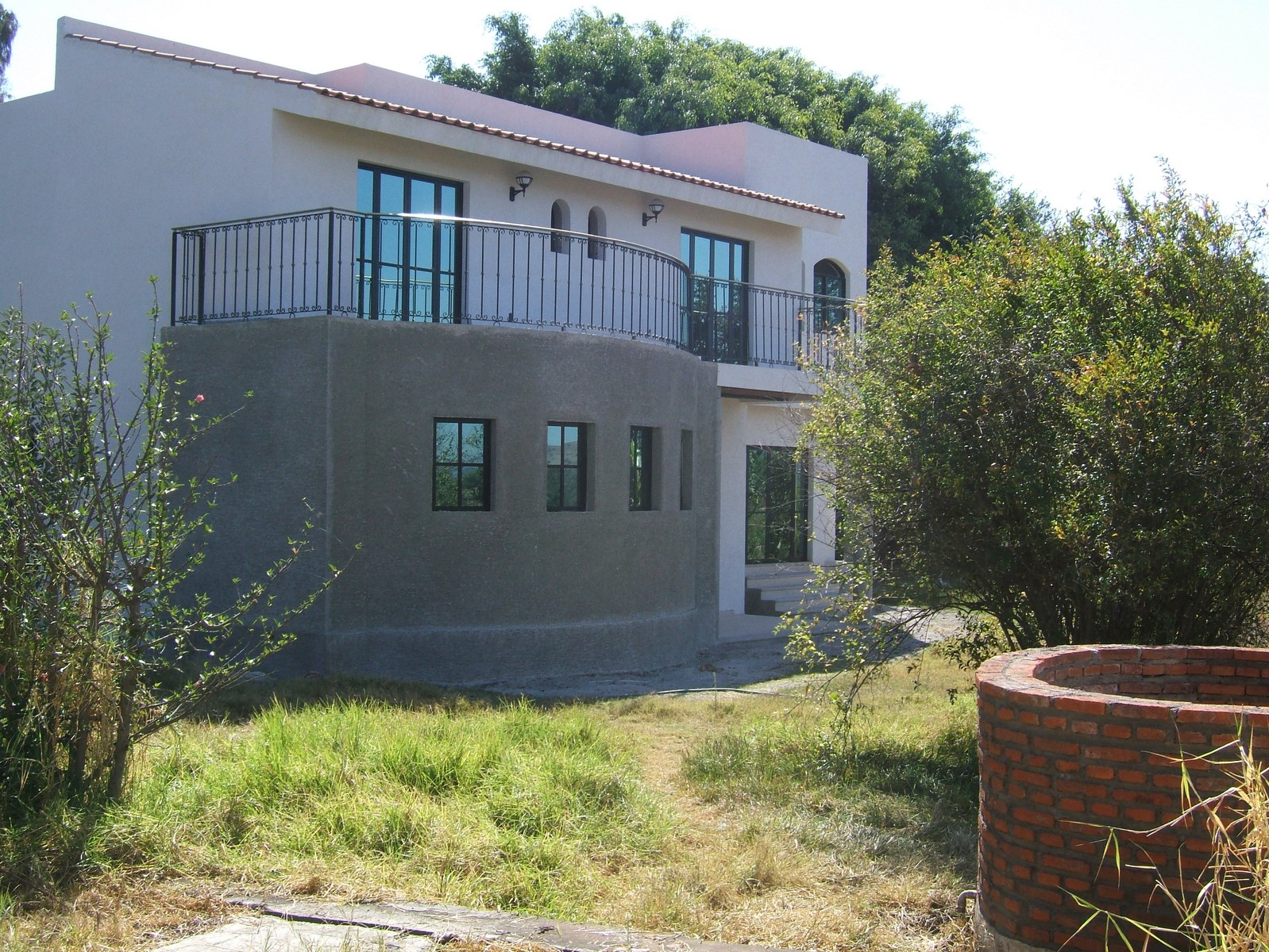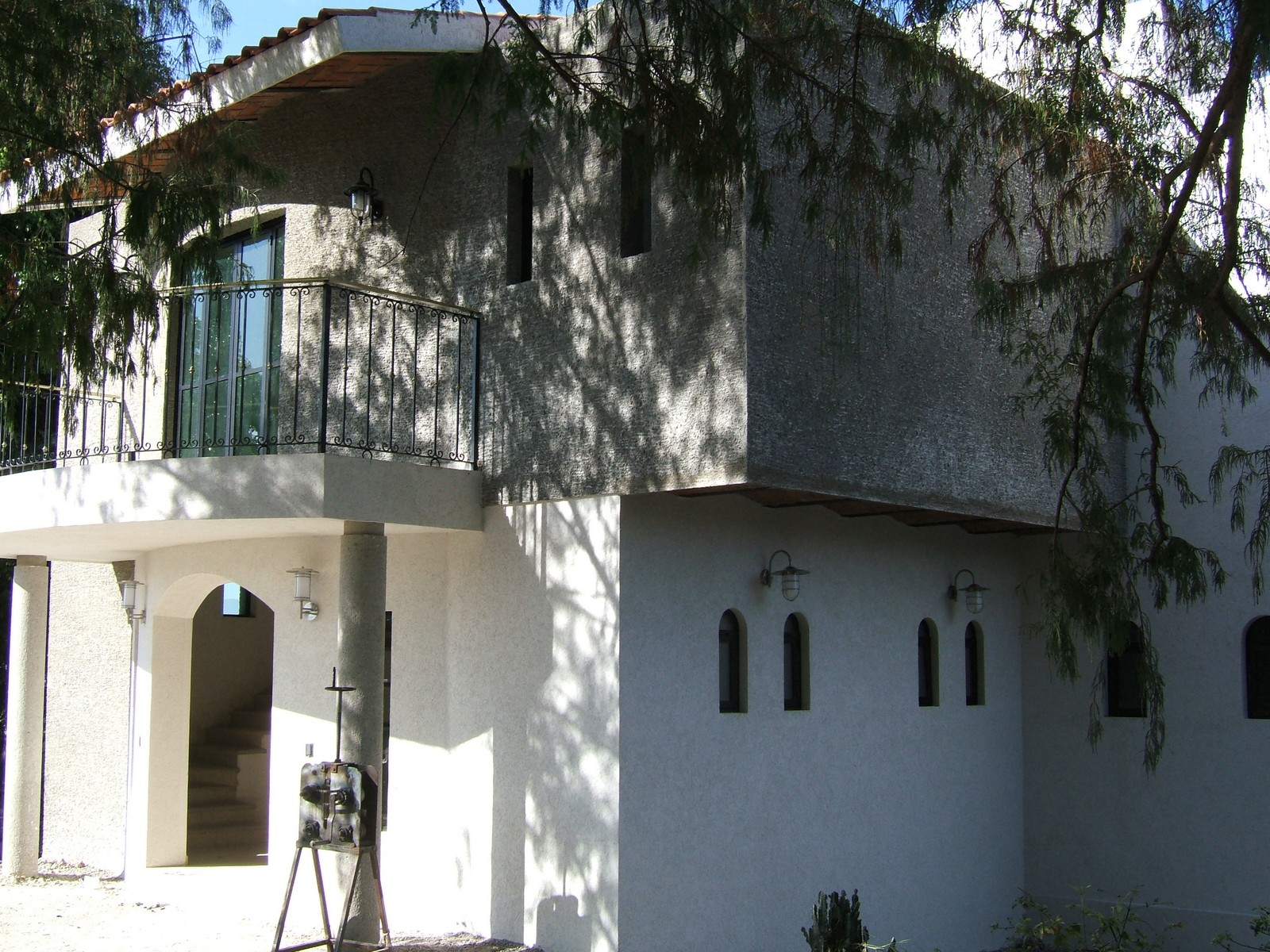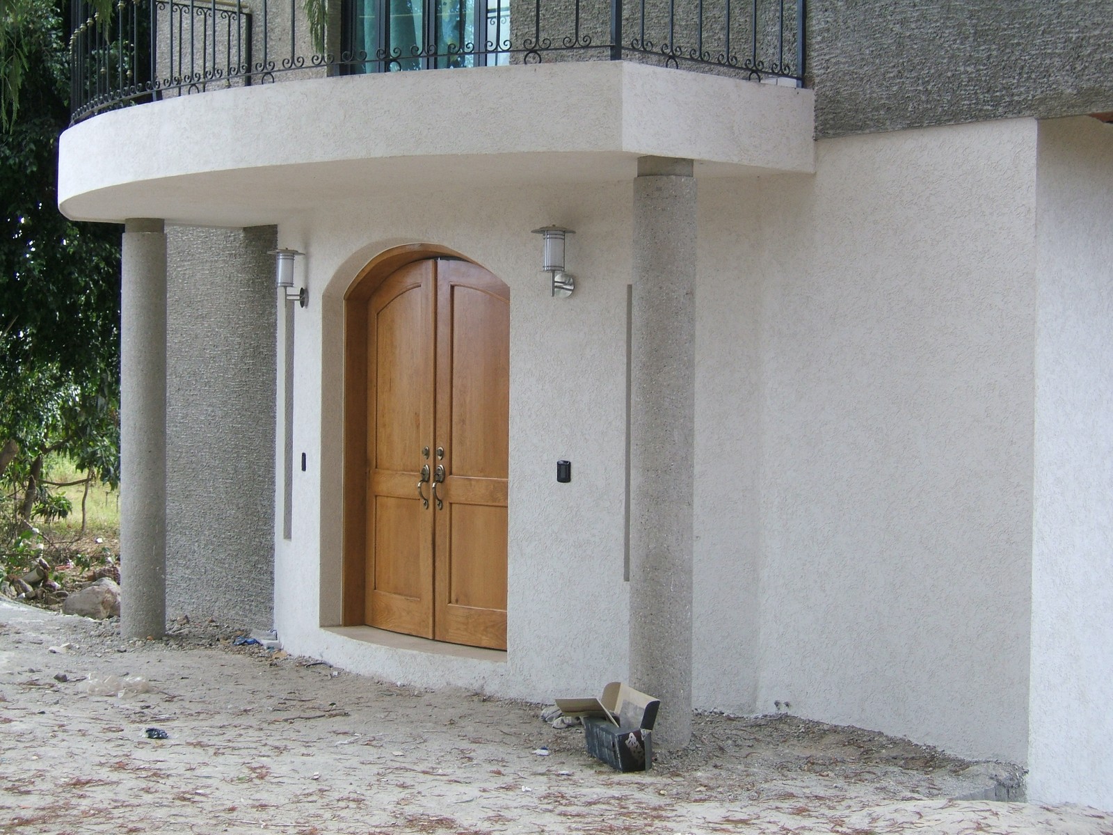 Ahora la mayoría del exterior del frente de la casa está terminada; concreto rústico para la planta alta y pintura texturizada para la planta baja. También se han colocado las rejas del balcón de la recámara principal.