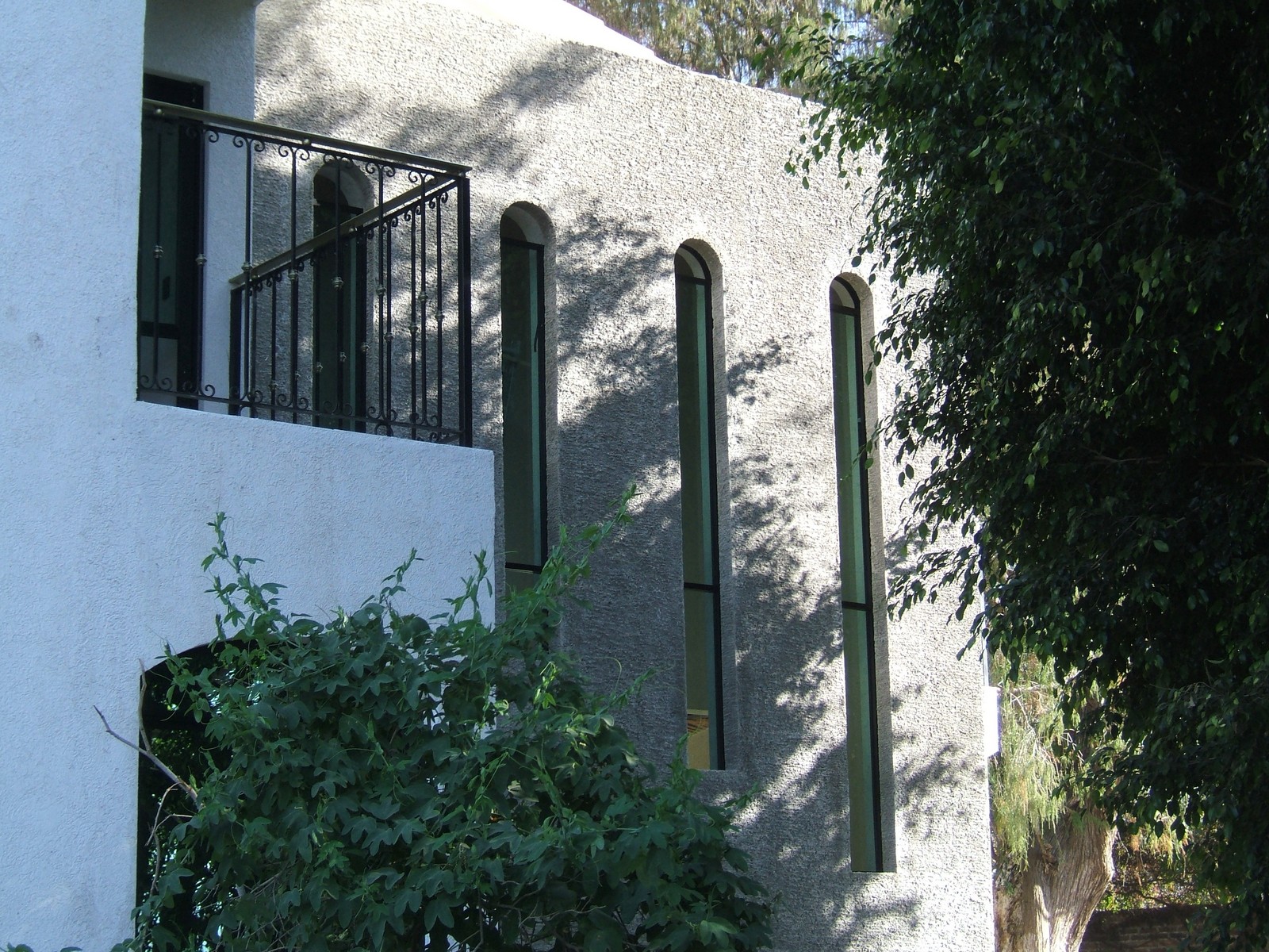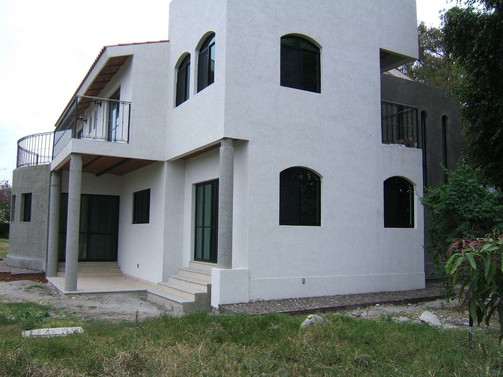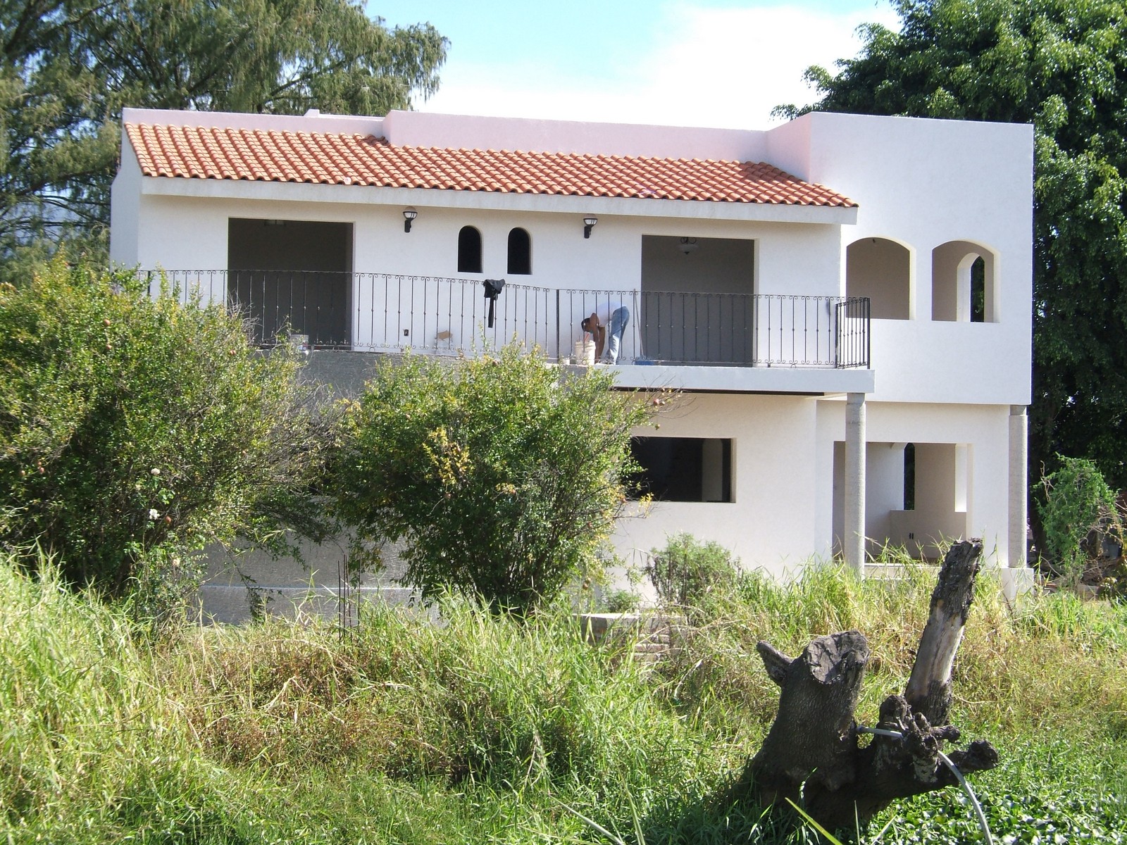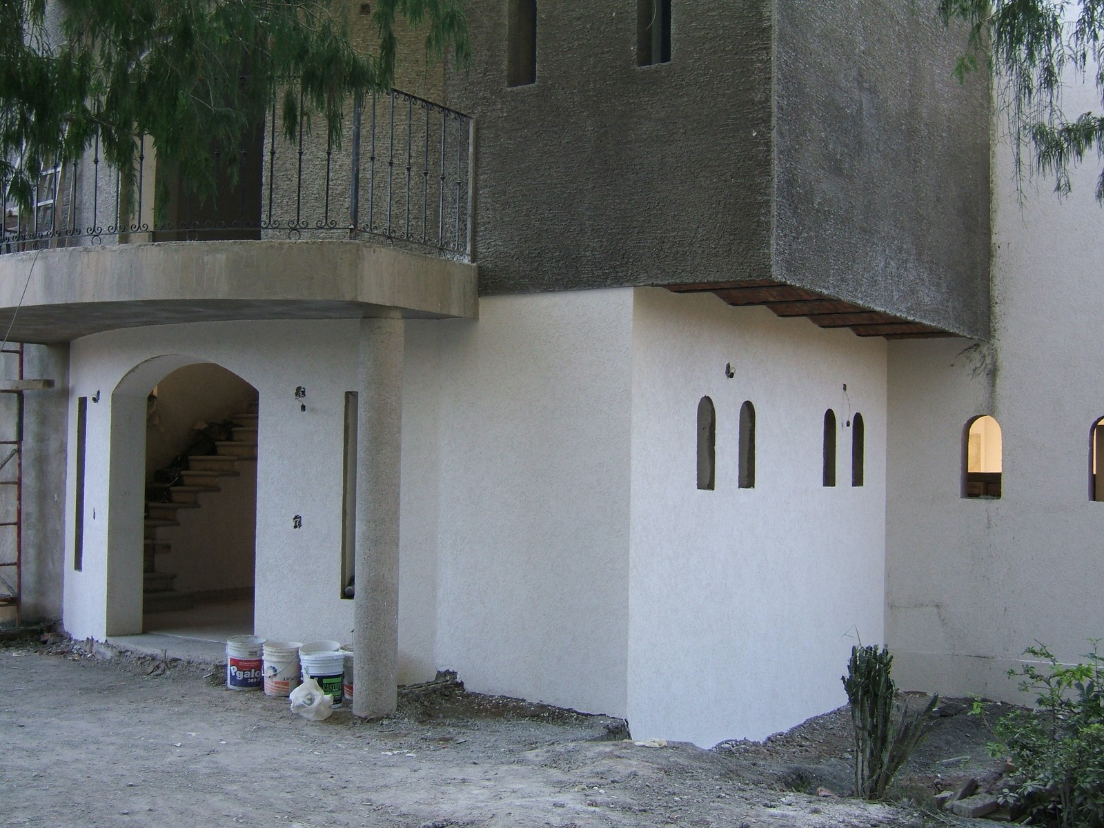 Ahora la mayoría del exterior del frente de la casa está terminada; concreto rústico para la planta alta y pintura texturizada para la planta baja. También se han colocado las rejas del balcón de la recámara principal.