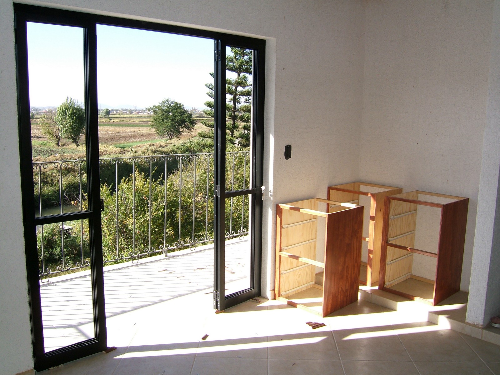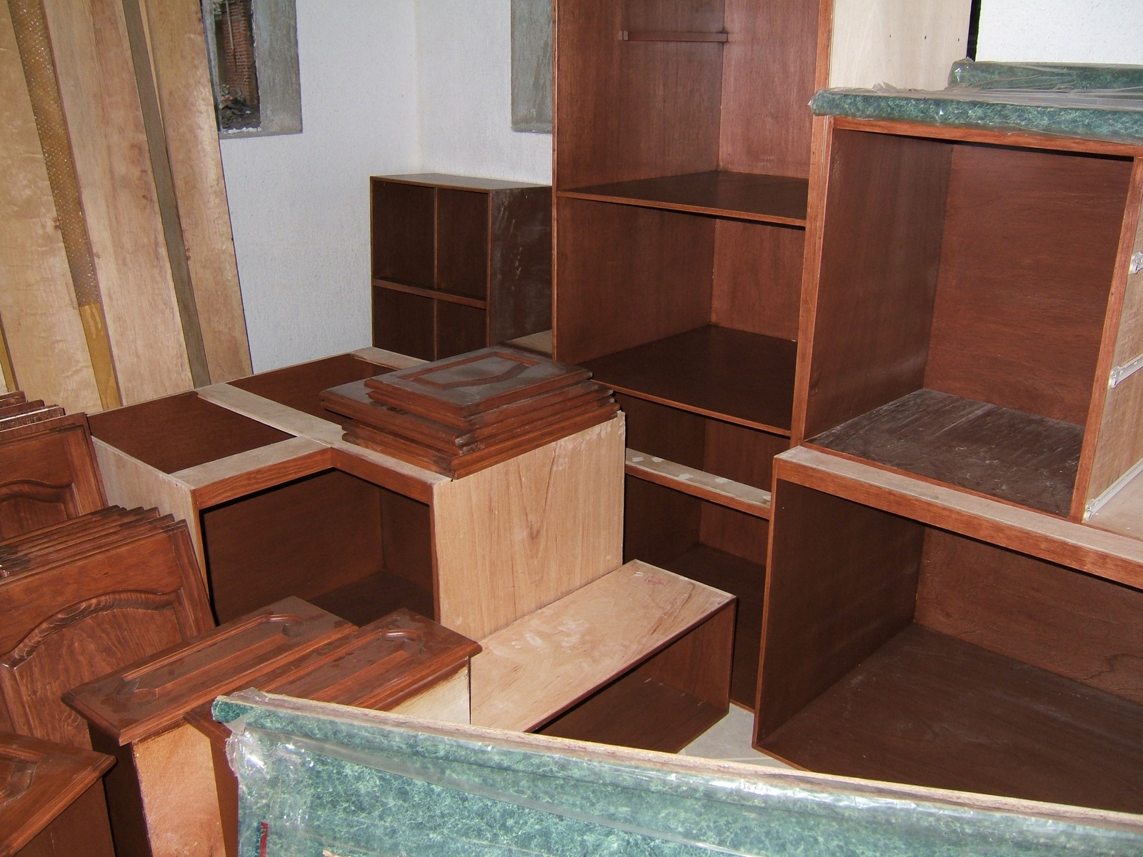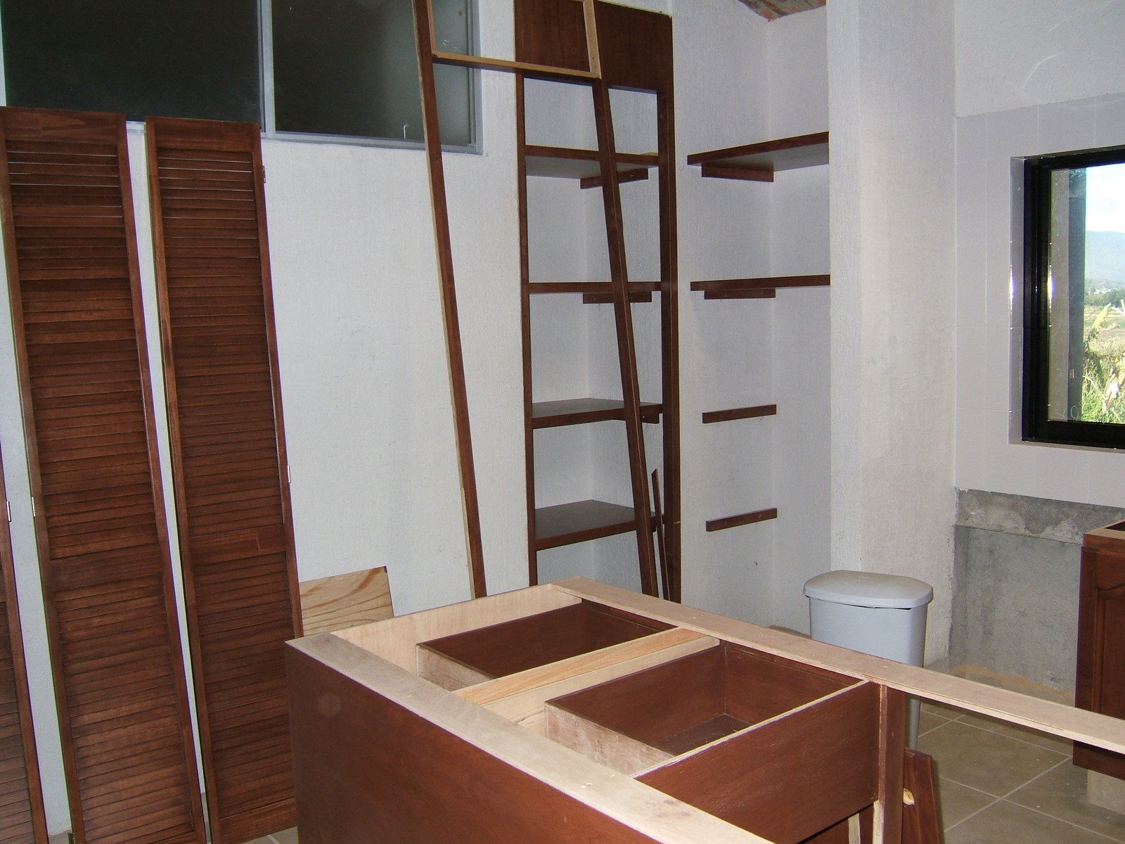 También se están instalando los bastidores de aluminio para las ventanas y las puertas; a la derecha están algunas de las unidades interiores para los armarios.