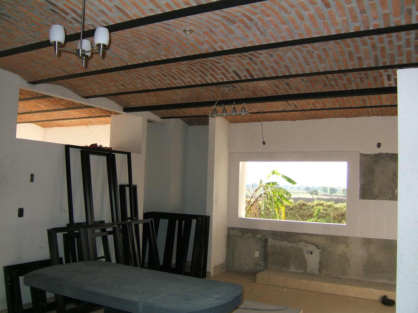 Algunos de los bastidores de aluminio para las ventanas están aquí, y más lámparas colocadas.