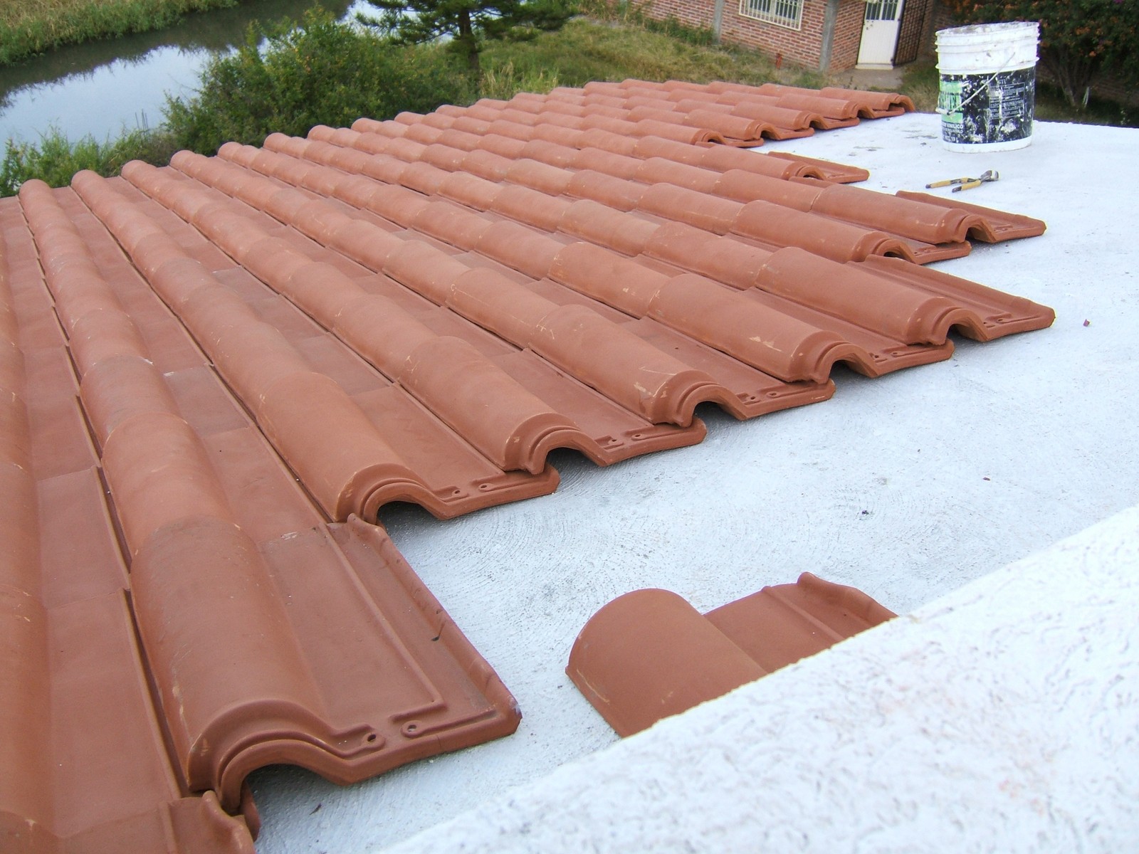 Al fin se están colocando las tejas; también se pegan estas con adhesivo. El tipo es “El Aguila”, hecho en León, Guanajuato.