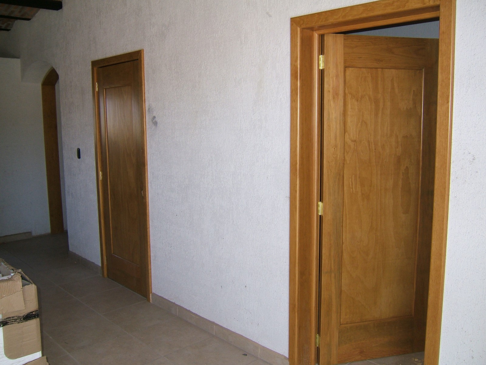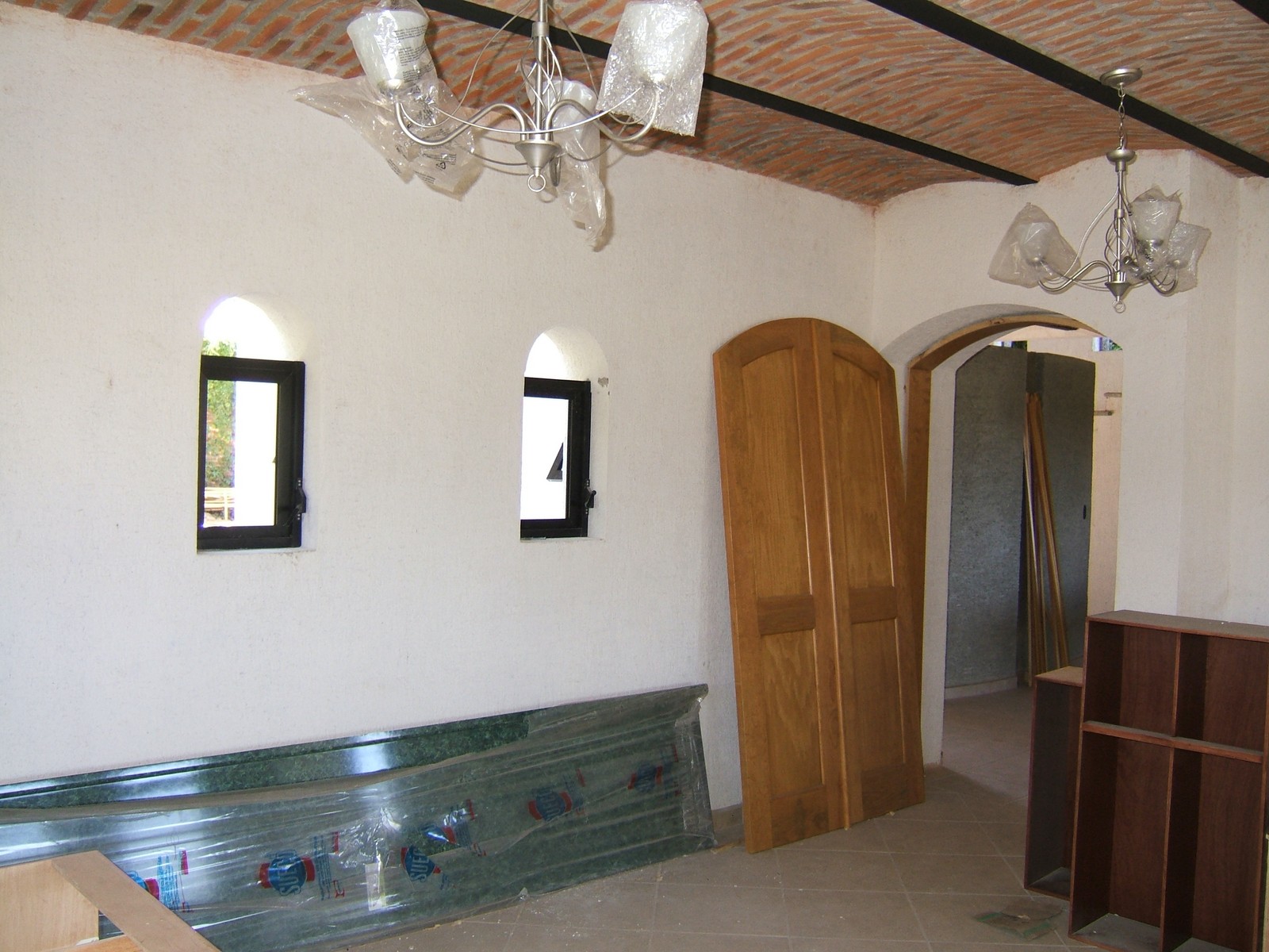 Las puertas dobles de la estancia aún no están colocadas; han colgado todas las puertas interiores pero no las han terminado.
