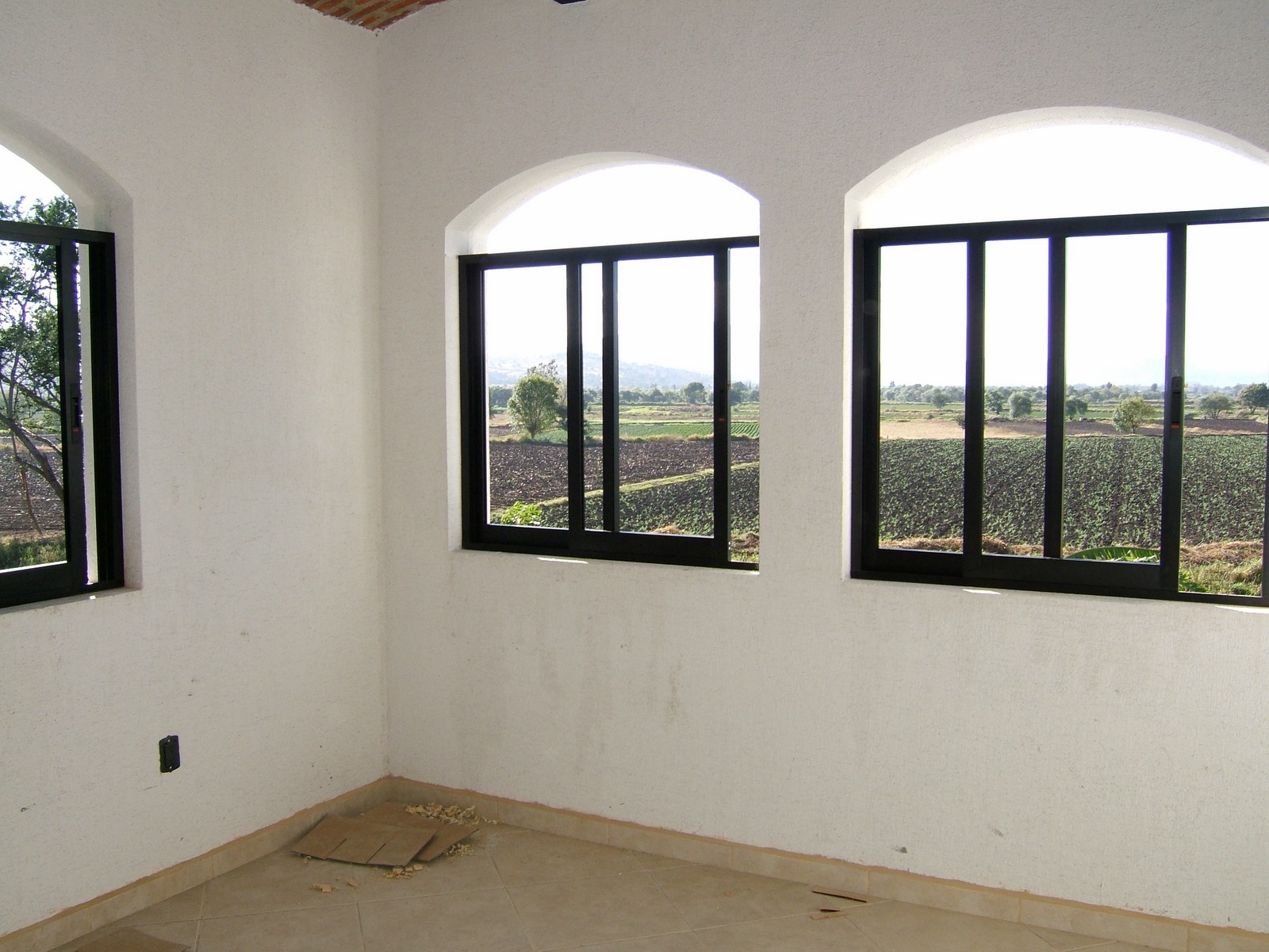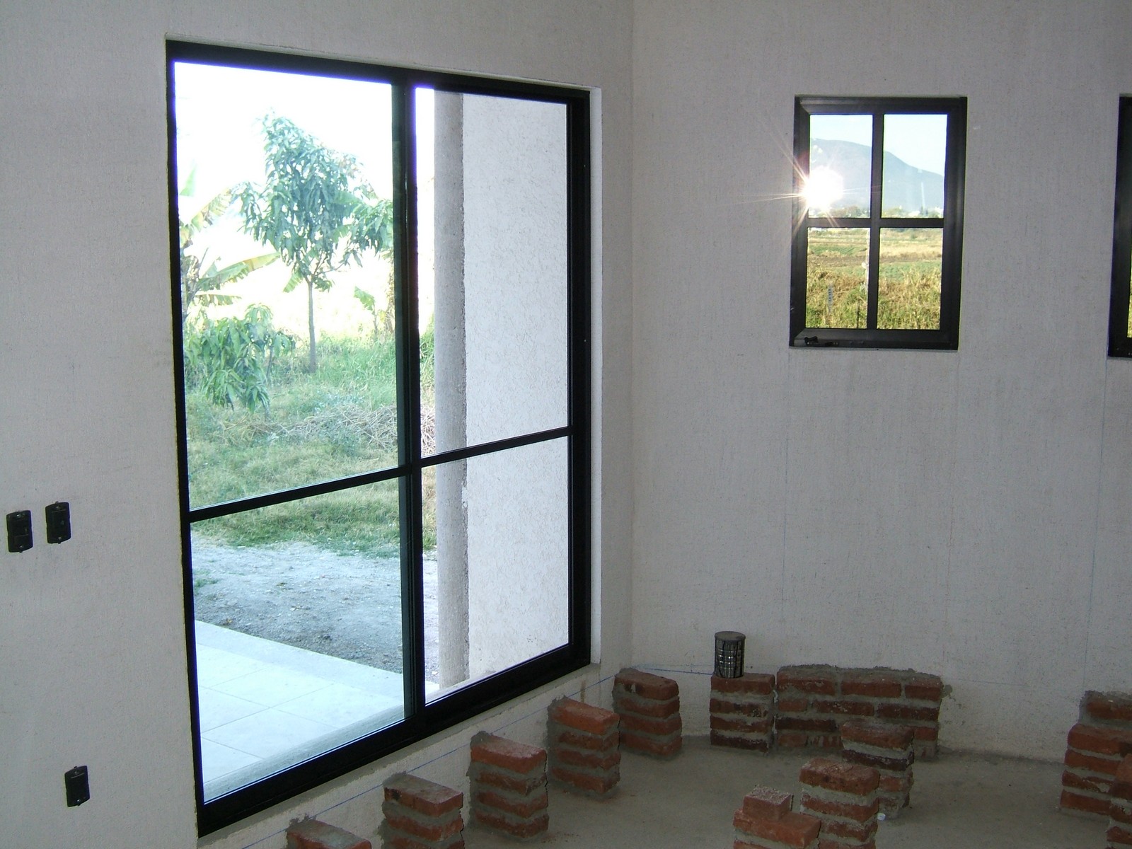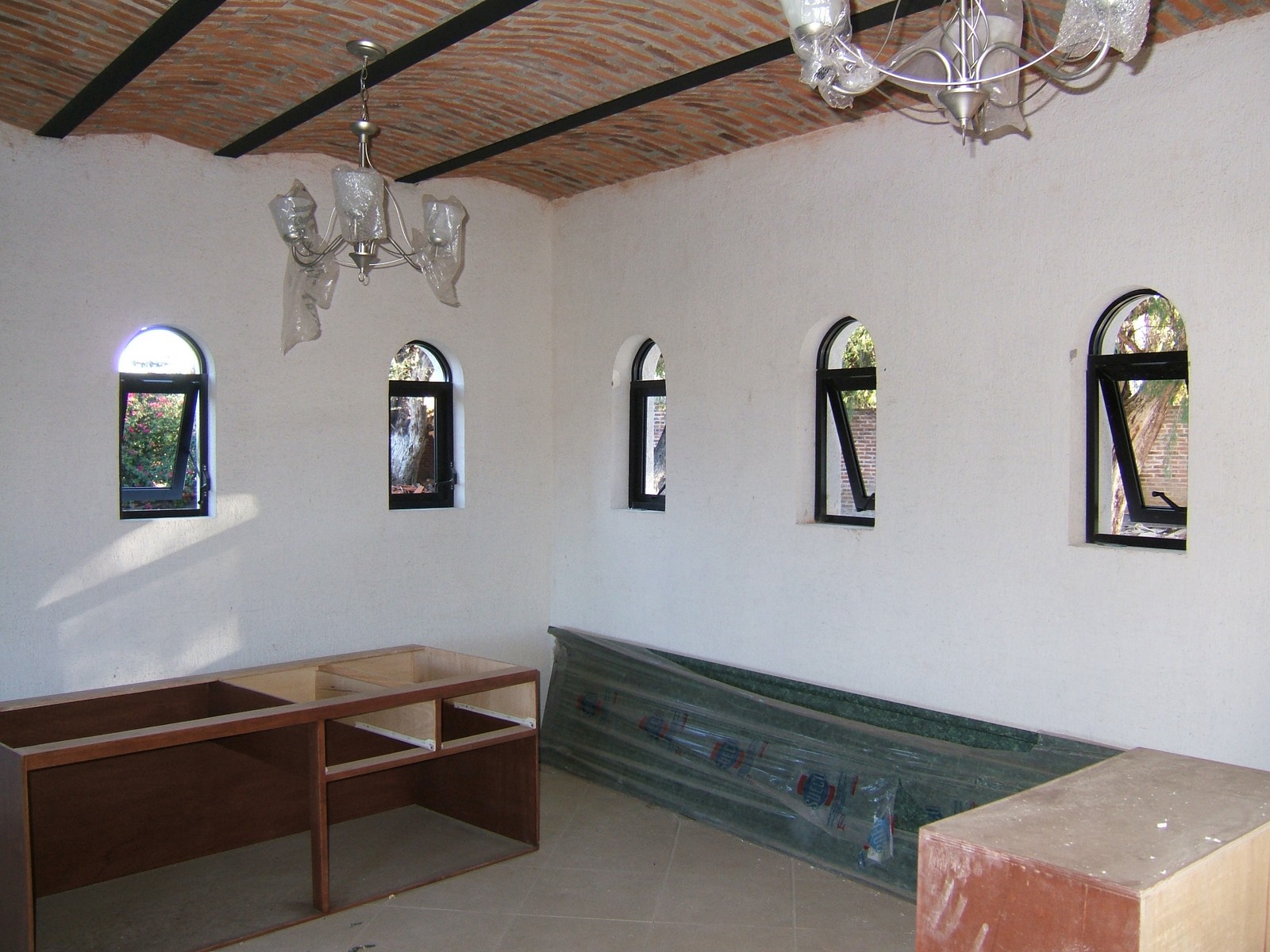 Una vista de por la casita mostrando más ventanas colocadas, pero esto está yendo MUY lentamente. Los carpinteros no han venido durante algunas semanas, y mudarse no será posible sin todo el aluminio/cristal y las puertas de la entrada.