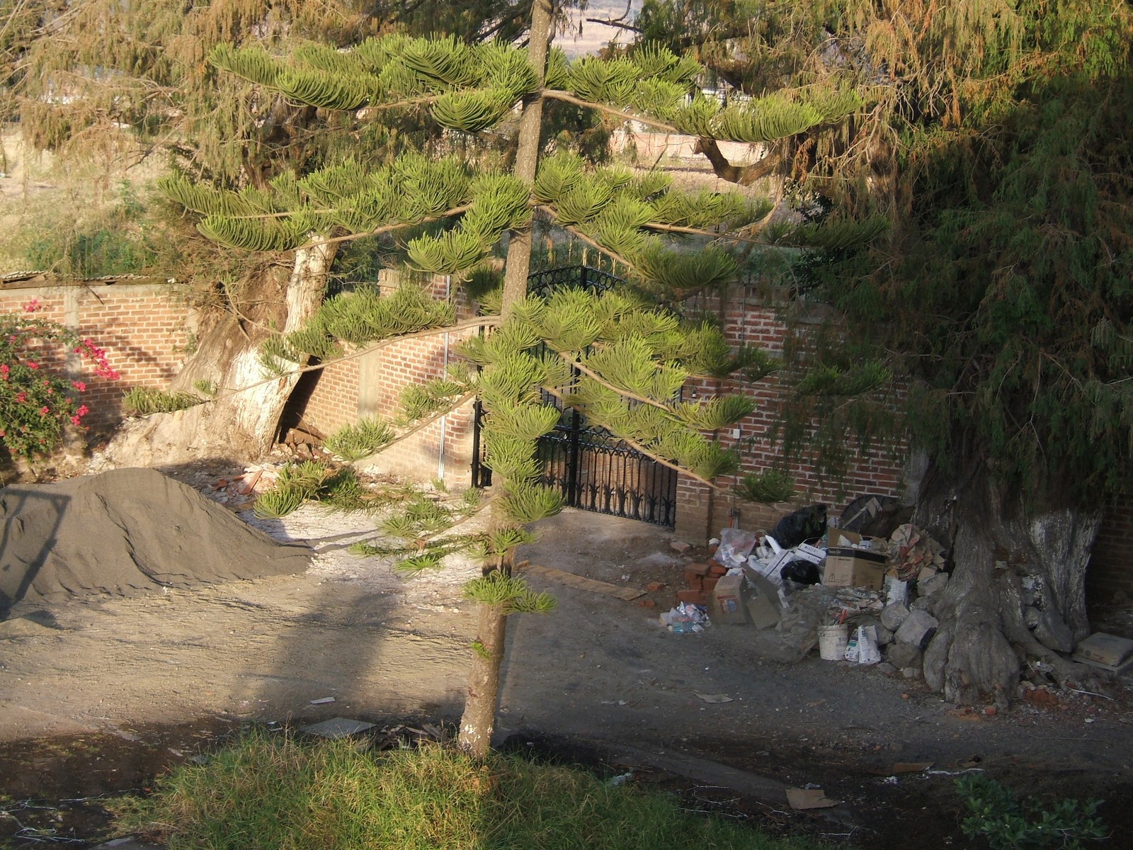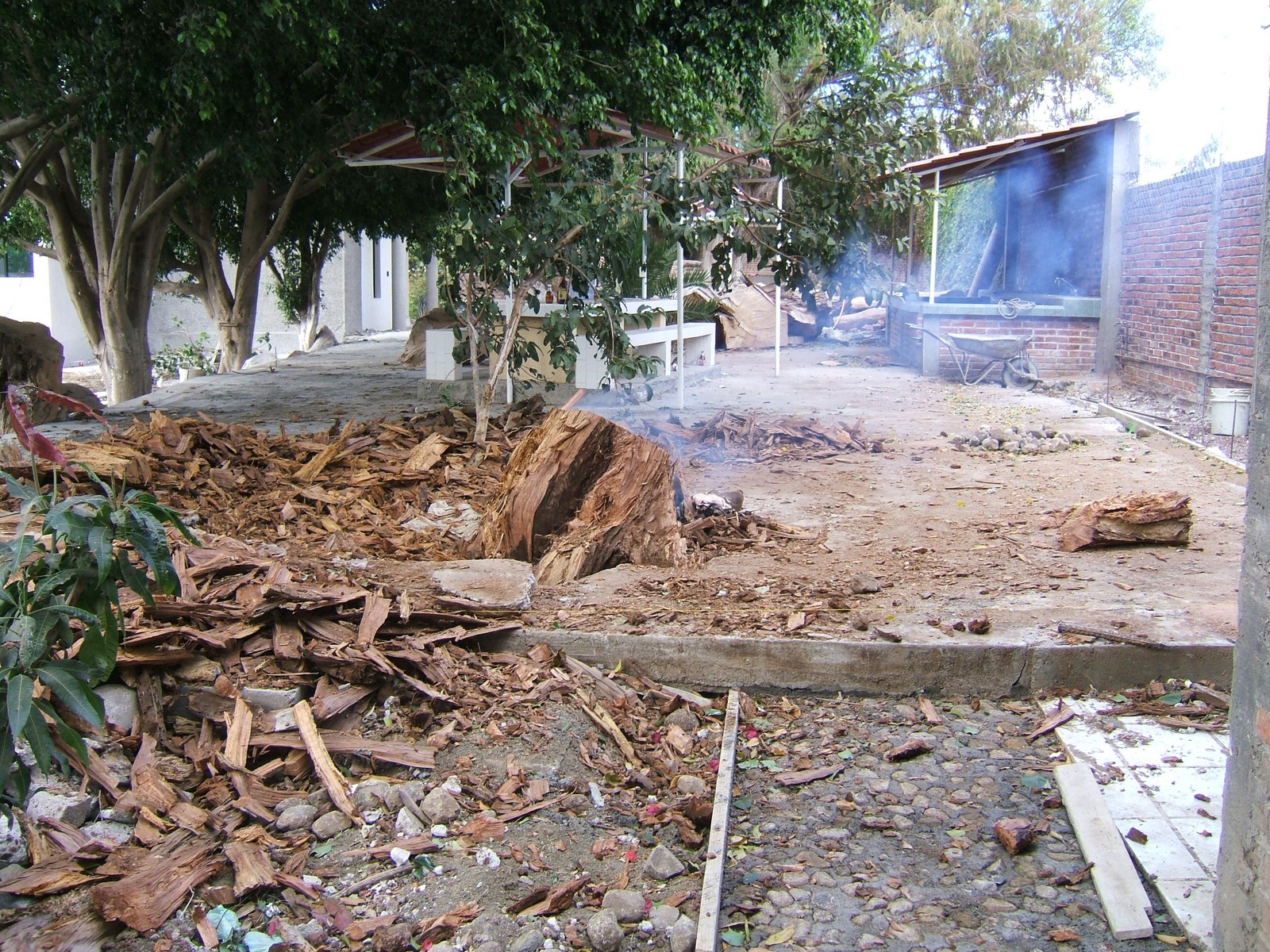 Se ha repavimentado con piedras del río en concreto el camino de la bodeguita al extremo sur, y este mismo acabado se aplicará al todo el patio. Primero, hay mucha madera vieja por quitar de dos árboles muertos (sabinos) que se cortó el marzo pasado.