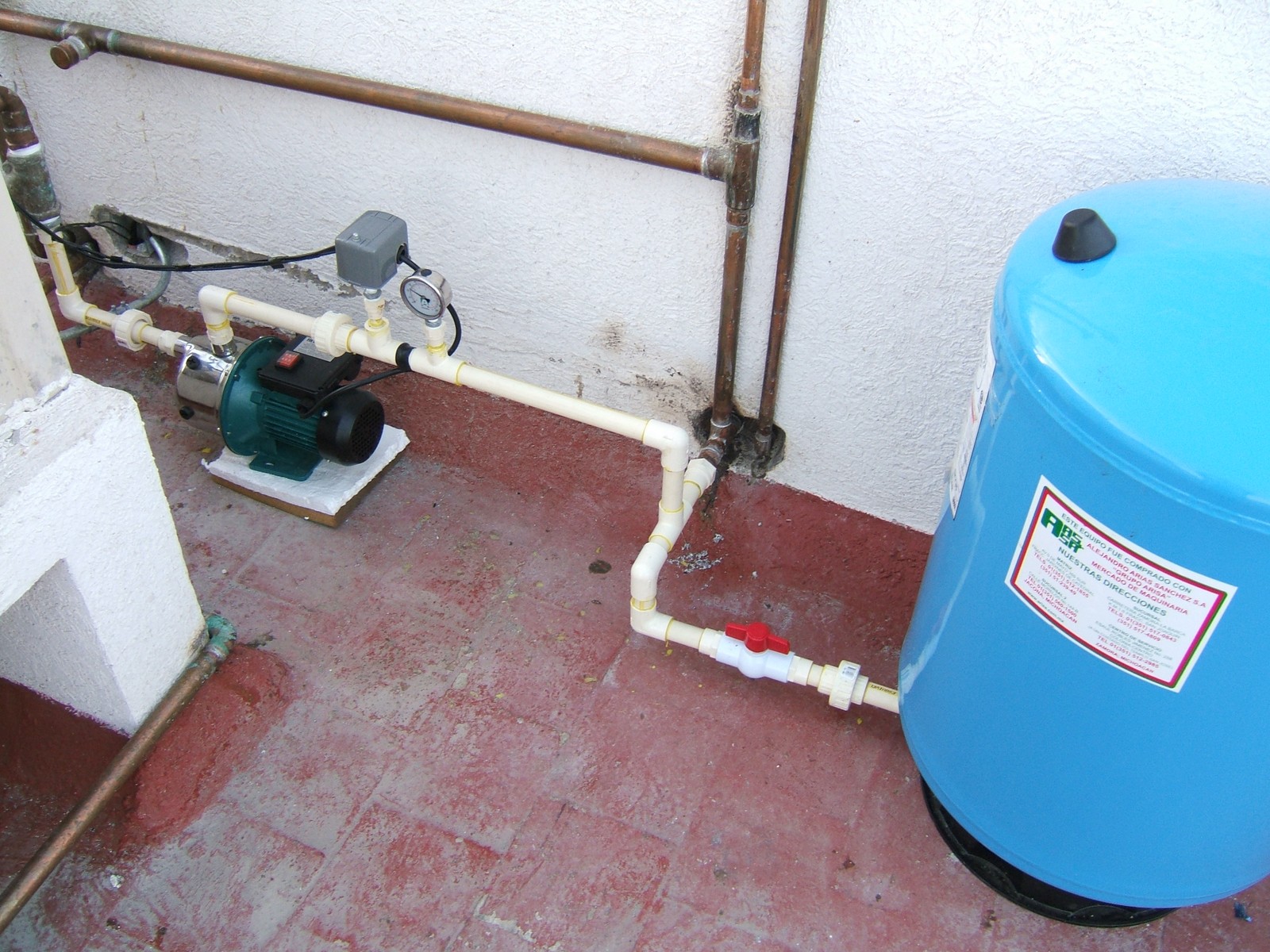 Ahora está instalado un sistema para alta presión de agua, y se ha llenado el tanque de gas. Por lo tanto puede ducharse con agua caliente y usar la lavadora. Después se hará una caja protectora para proteger este equipo.