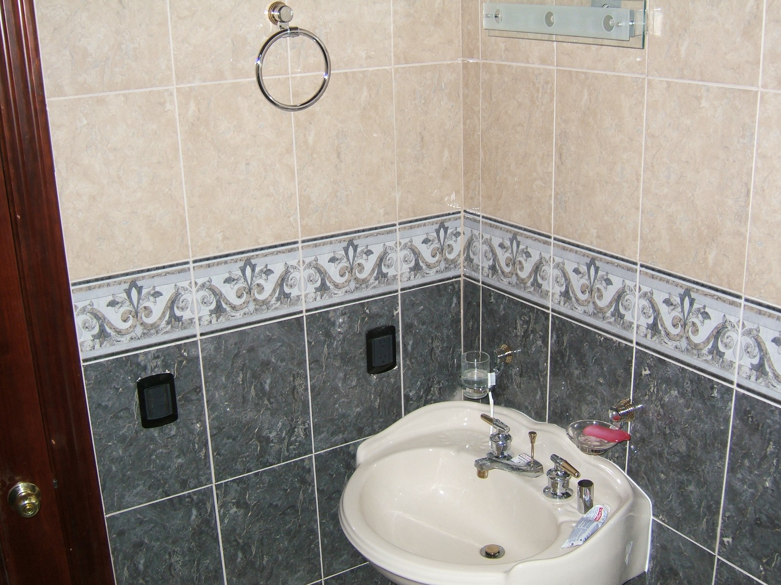 El lavabo en el baño compartido, mostrando algunos de los accesorios.