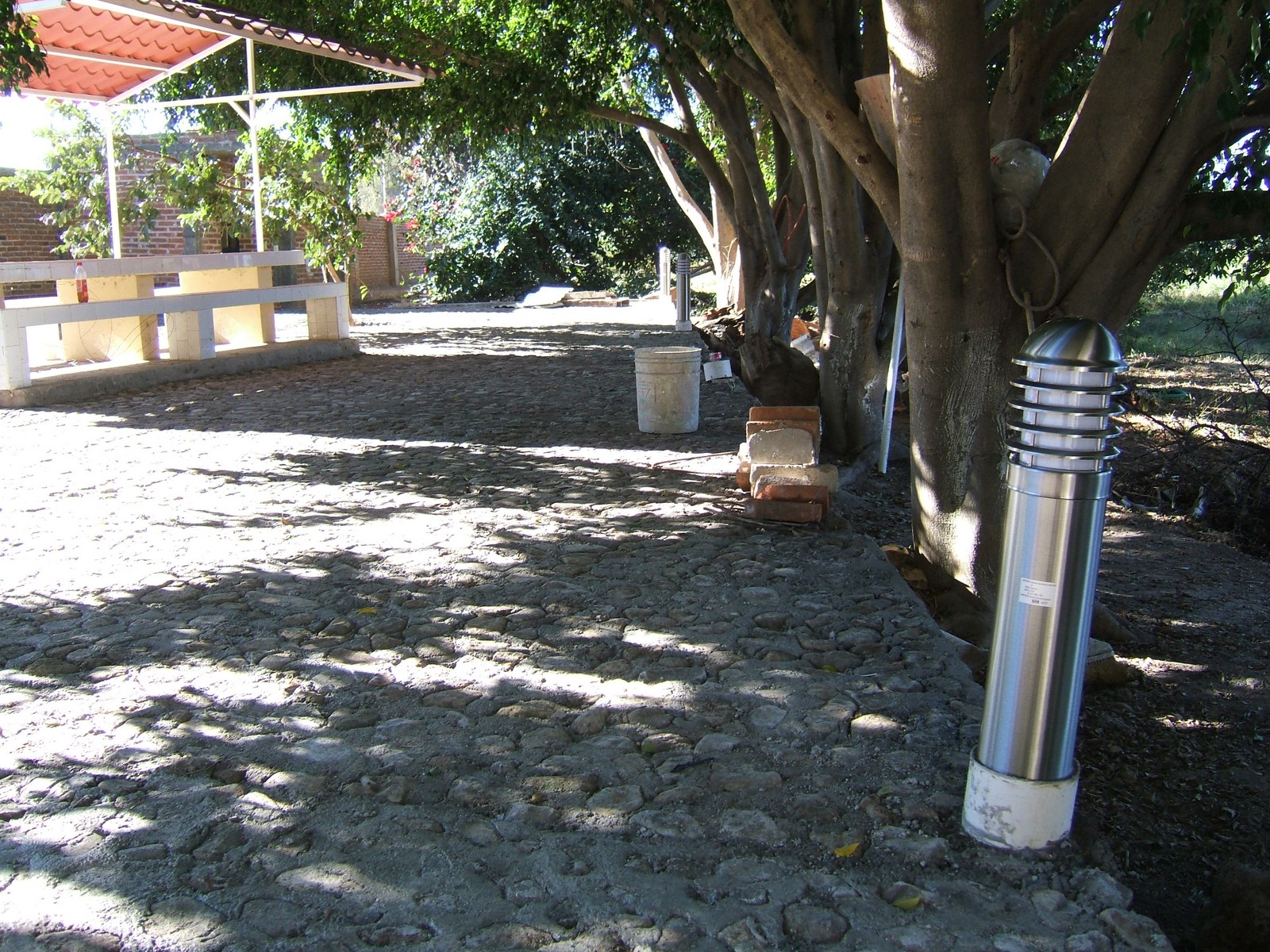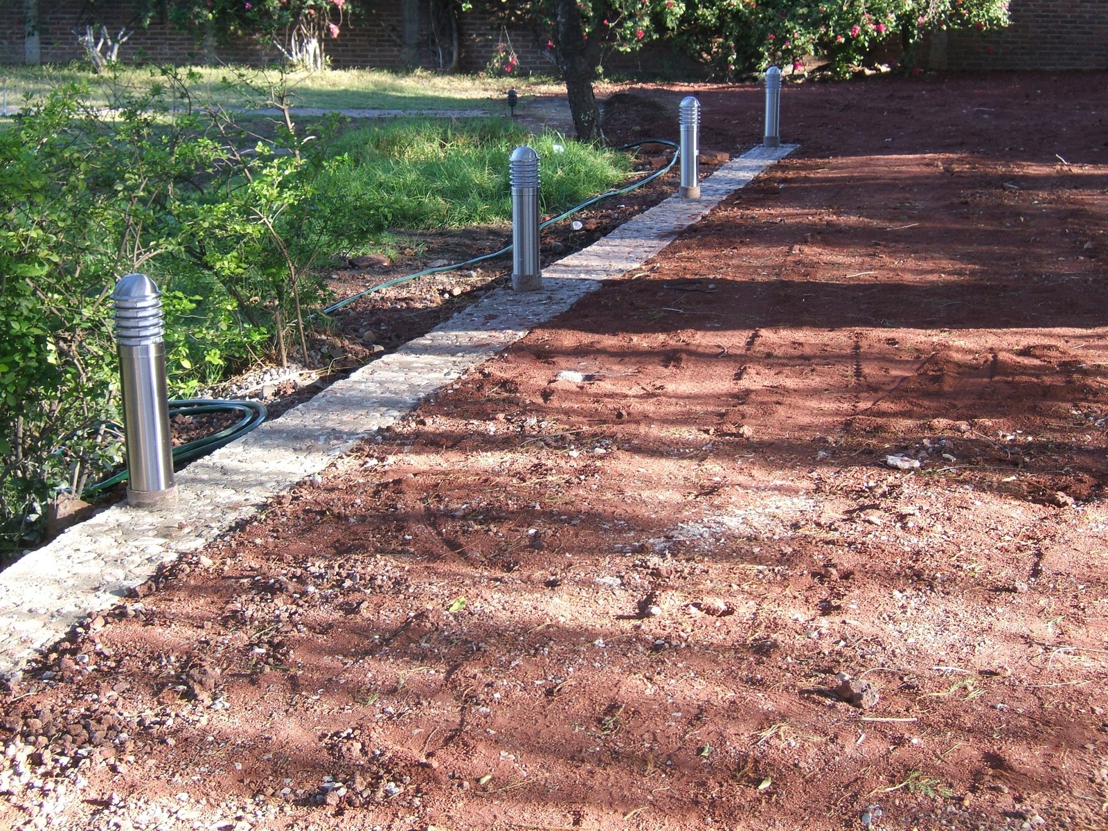 Se han colocado tres de las lámparas por el patio (supongo que los tubos de PVC se quitarán cuando haya fraguado el concreto). Habrá 10 de esas, 5 a cada lado de la casa.